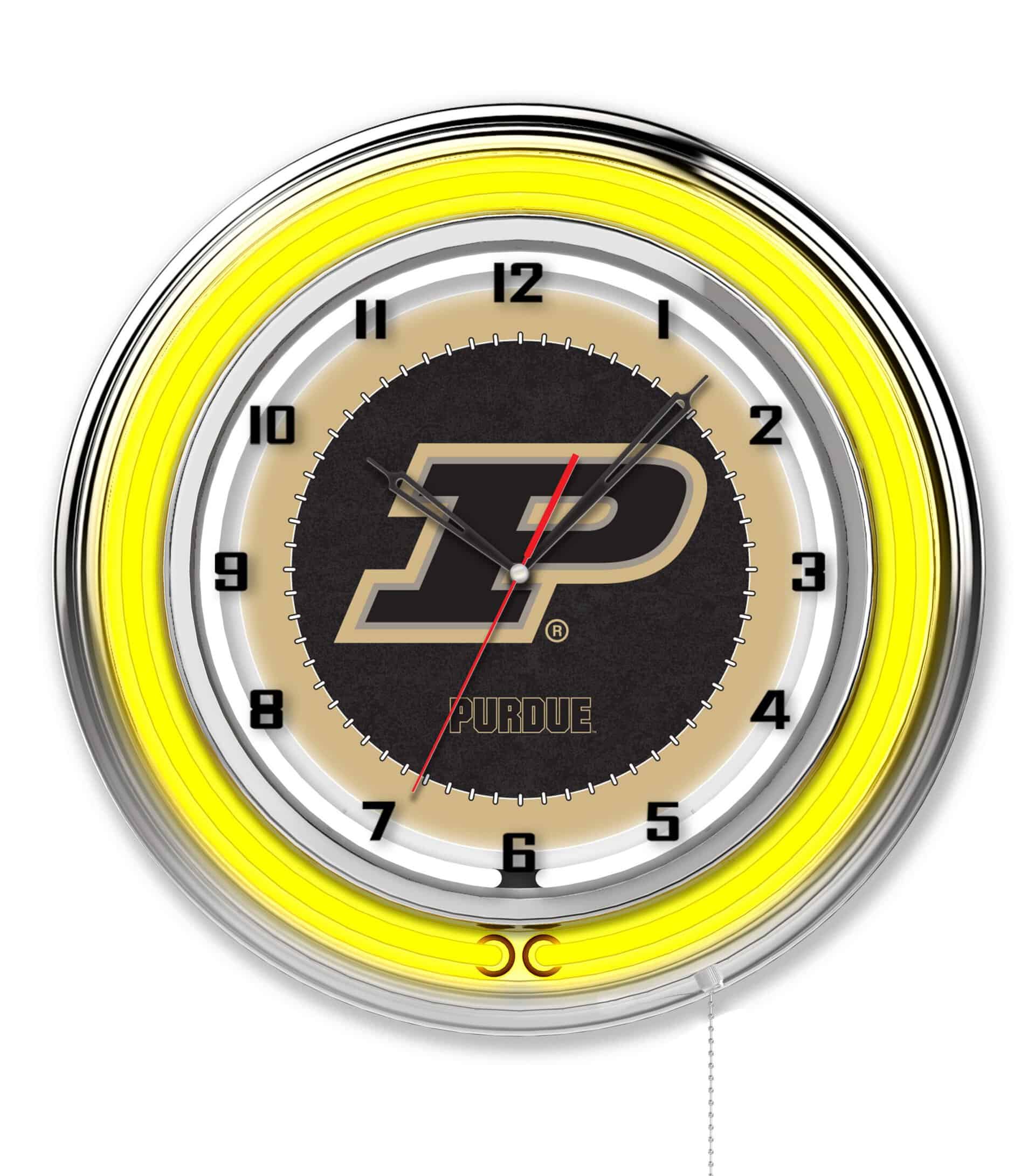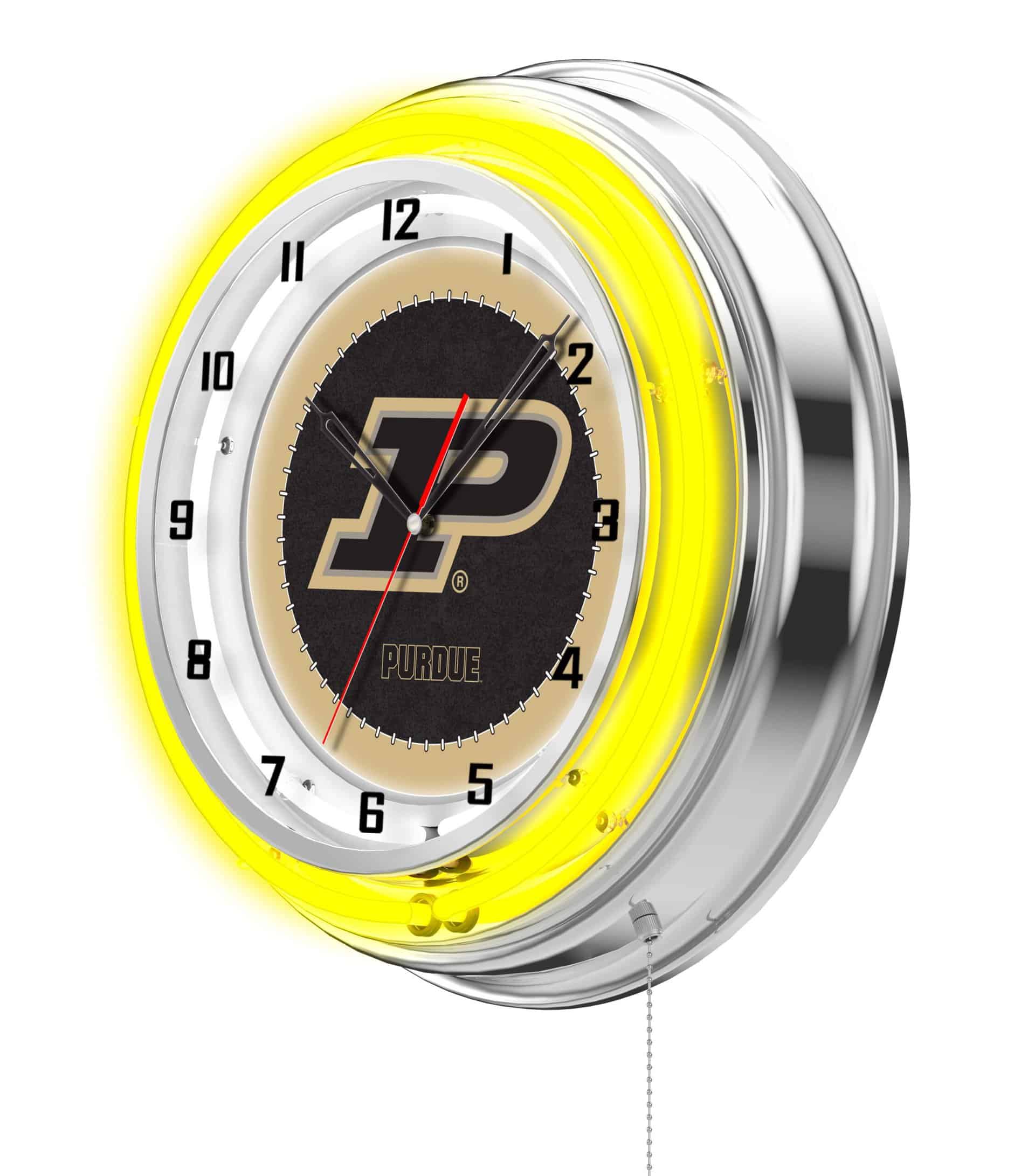 The “Purdue 19-Inch Neon Logo Clock in Chrome is the perfect addition to any man cave, showcasing your school pride with vibrant colors and a stylish design. This clock features a sleek chrome casing and a team color-specific neon outer ring that beautifully highlights the custom printed clock face, illuminated by a brilliant white inner neon ring. The neon rings can be easily activated or deactivated using a convenient pull chain located at the bottom of the clock. Powered by a UL Listed transformer that connects to a standard 120V outlet, this clock ensures accurate timekeeping with its quartz movement, requiring only a single AA battery (not included). Ideal as a gift for graduates, sports enthusiasts, or as a personal treat, this clock combines functionality and style.