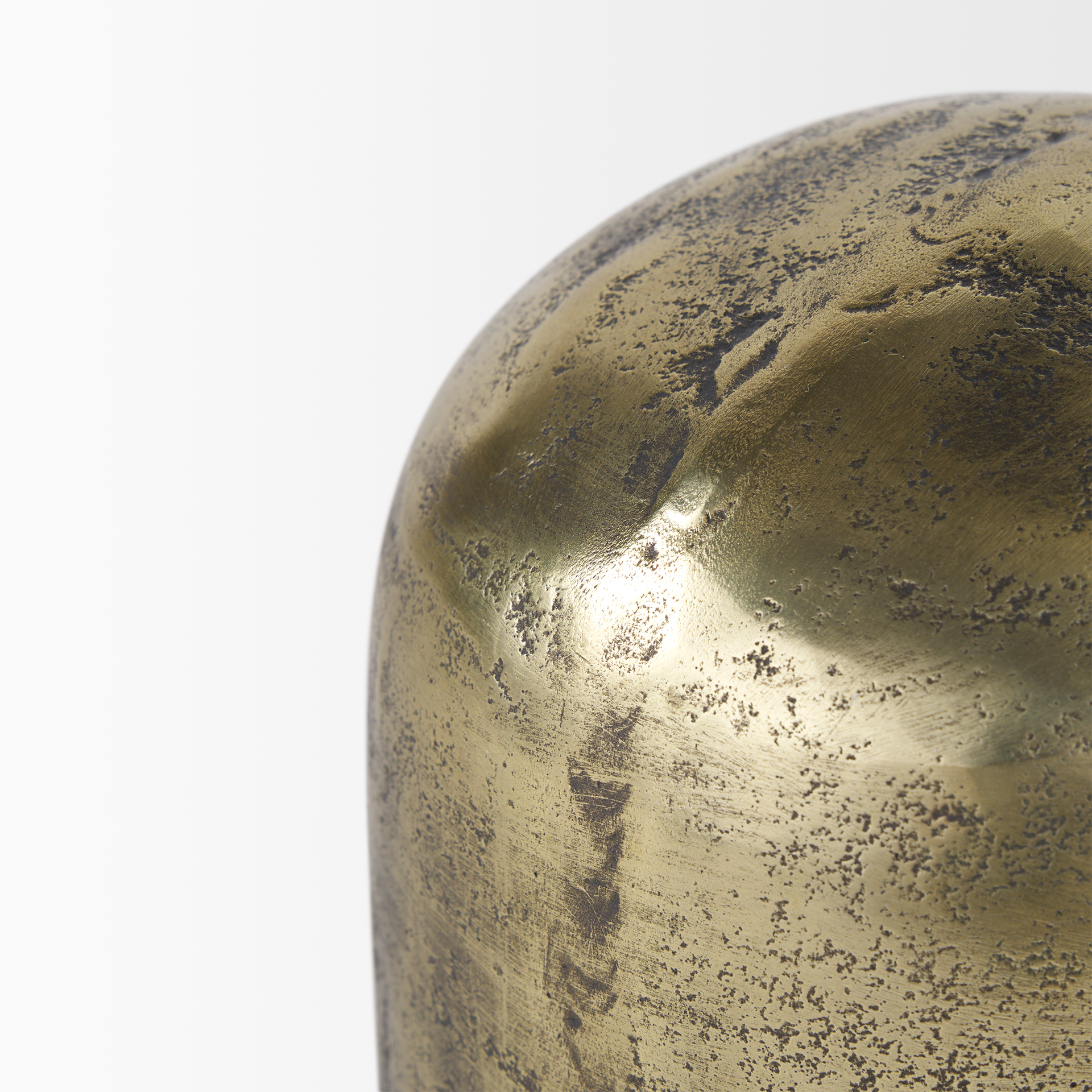 The Quonset is a striking decorative object, perfect for adding a touch of elegance to any space. This pillar-style accent piece is crafted from cast aluminum and finished with a shiny, antiqued brass electroplating. Display it alone or create a dynamic arrangement by layering it with the Quonset Tall and Extra Tall versions for enhanced visual depth.