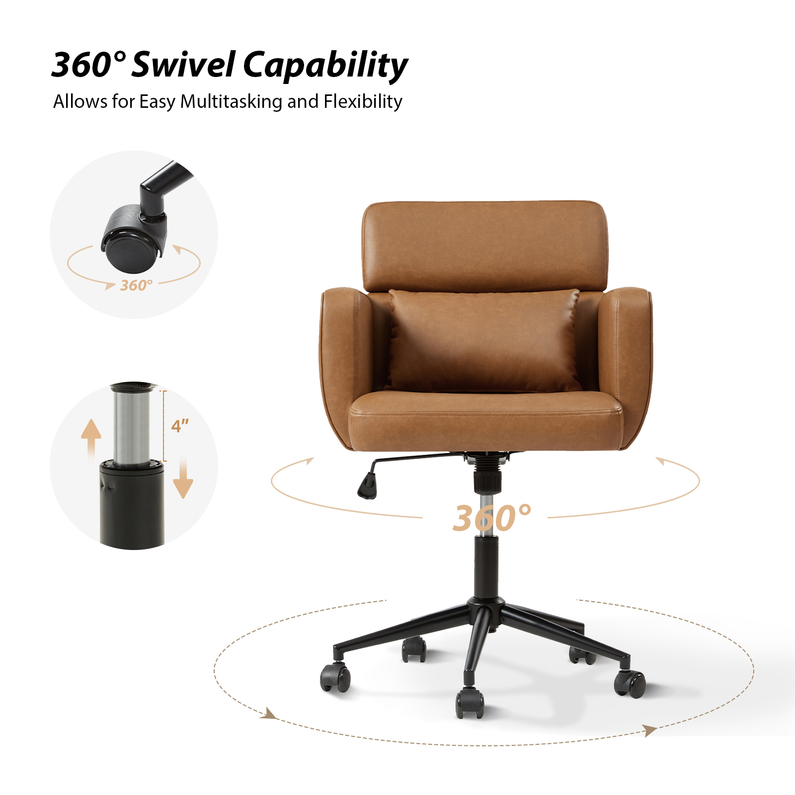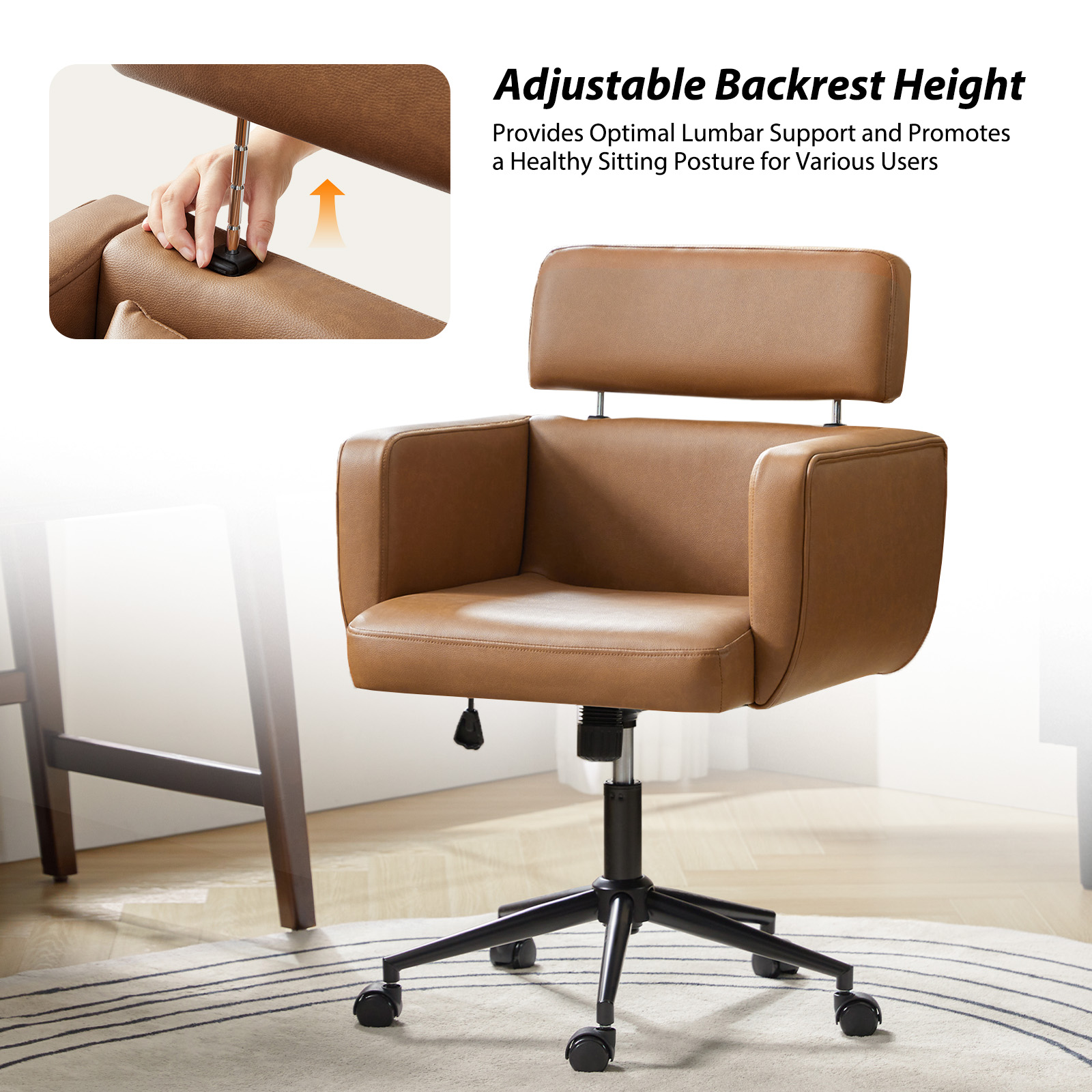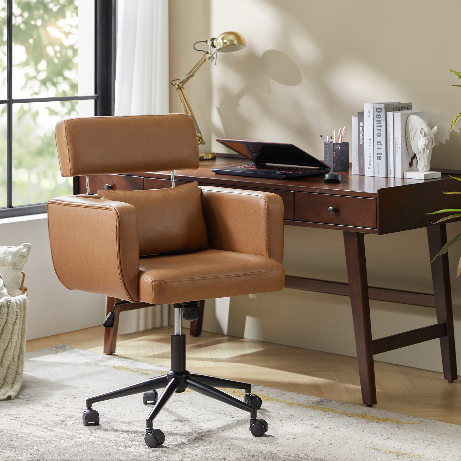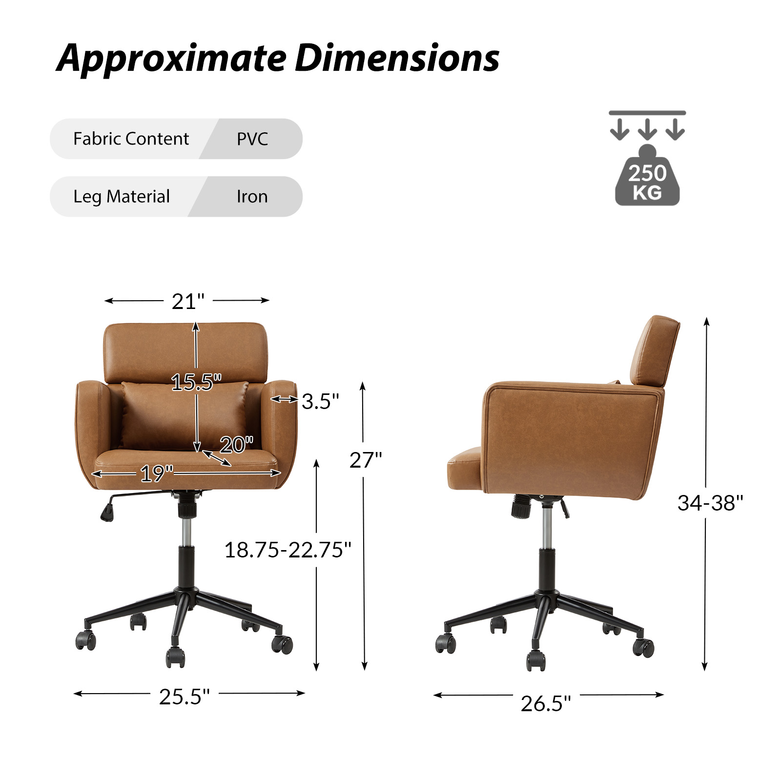 Upgrade your man cave office with this modern marvel! This ergonomic swivel office chair combines style and comfort. The sleek silhouette and camel color fit any room. Work in comfort with the adjustable backrest height and tilt function. The adjustable seat height works with any desk. Spin around with the 360° swivel. This chair is made of durable faux leather, metal, and manufactured wood. Dimensions (WxDxH): 25.5 x 26.5 x 34-38. Seat Dimensions (WxDxH): 26.75 x 24 x 16.5. Product Weight (lbs): 34.3. Some assembly is required.