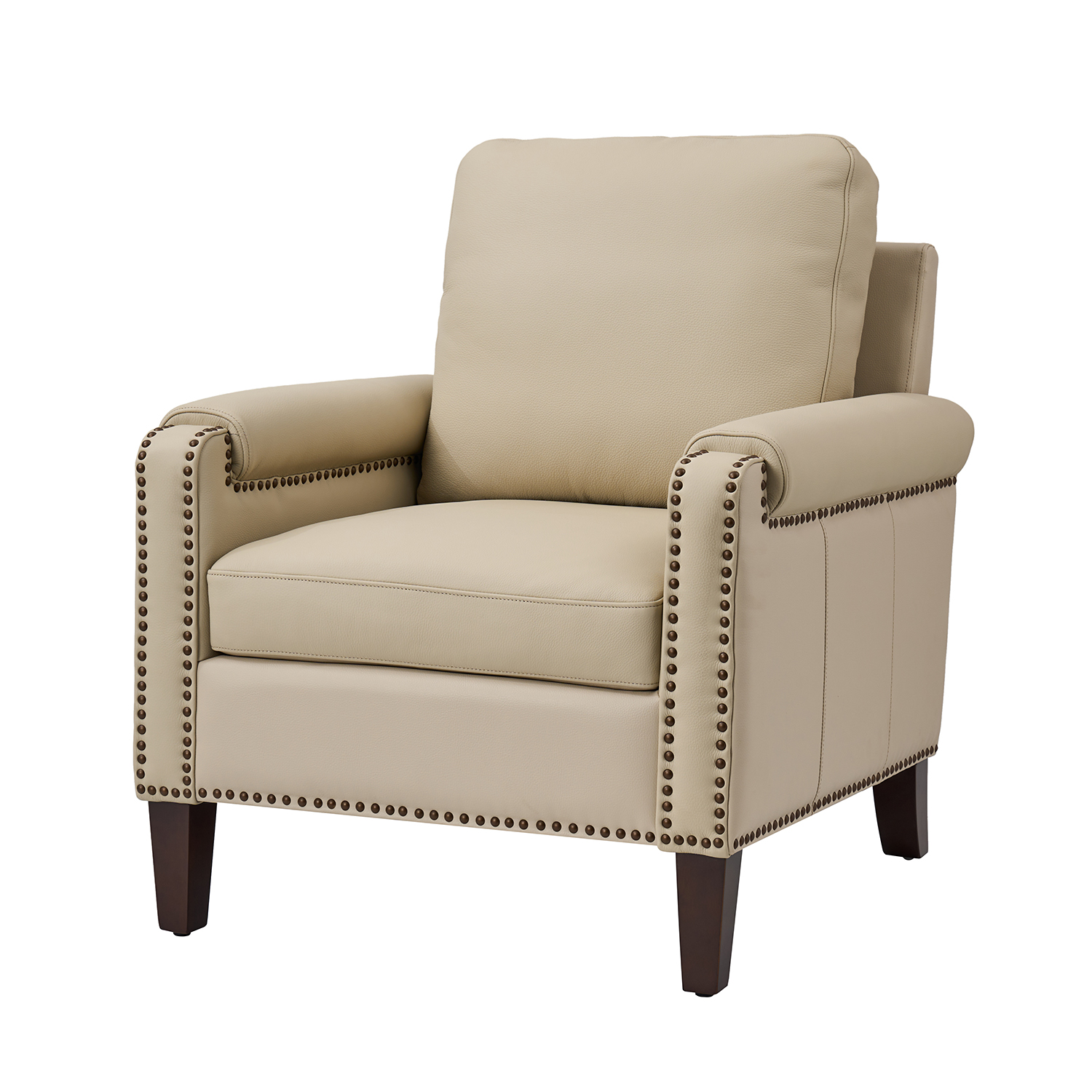 The Raimund Beige Genuine Leather Nailhead Trim Armchair is the perfect blend of comfort, style, and sophistication. This armchair is more than just a seat; it’s a statement piece that will elevate any room. Sink into the supple leather upholstery and experience unparalleled relaxation, while the meticulously crafted nailhead trims add a touch of classic elegance. With its unique arm design and versatile placement options, this armchair seamlessly combines style and functionality, making it the perfect addition to your home.