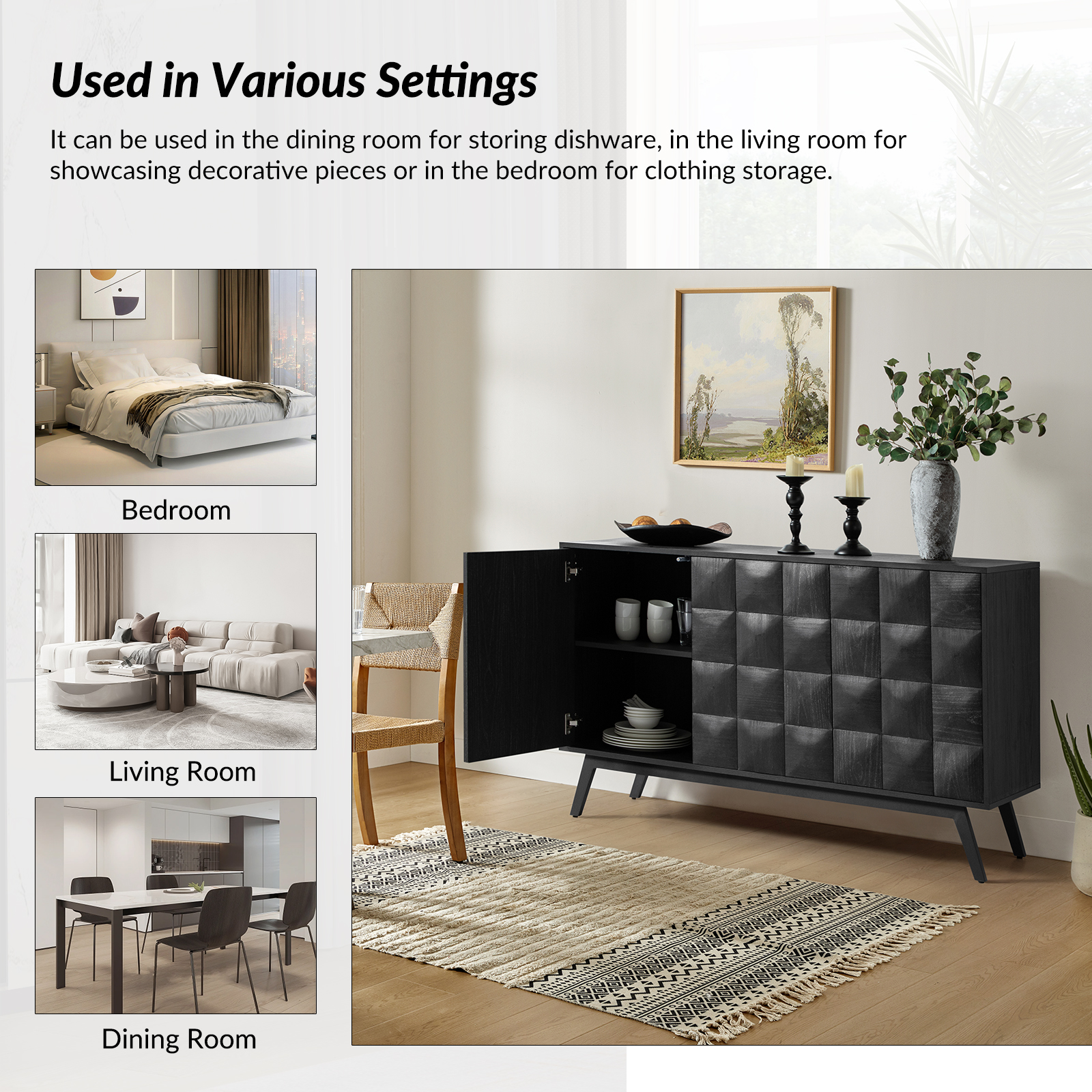 This Mid-Century Modern Sideboard is a seamless fusion of aesthetic appeal and practical design. Its standout feature is the unique square-patterned cabinet doors, offering a visually striking element. Inside, discover a wealth of organizational possibilities with divided drawers and adjustable shelves, tailored to accommodate your storage needs. Designed for the modern home, it includes integrated cable management for your electronic devices, ensuring a clutter-free setup. The sleek, handle-free aesthetic is enhanced by a push-to-open mechanism, adding a touch of contemporary elegance to any space. Supported by sturdy metal legs with adjustable feet, this sideboard guarantees stability on any surface.