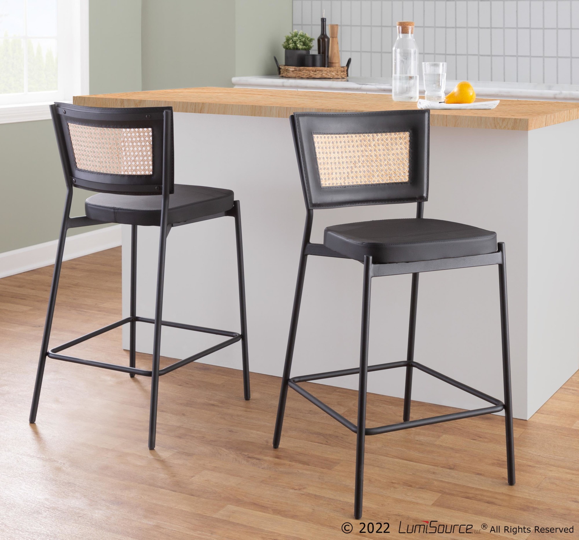 Add a touch of style to your counter area with this contemporary counter stool. This stool features a unique rattan accent and comfortable faux leather upholstery. It has a comfortable padded seat and a convenient footrest. The sleek black metal frame adds a modern touch. The counter stool has a fixed counter height and is priced and sold in pairs. Each stool can hold up to 250 pounds. Some assembly is required. The color is black metal, black faux leather, and rattan. The material is faux leather, woven fabric, foam, and metal.