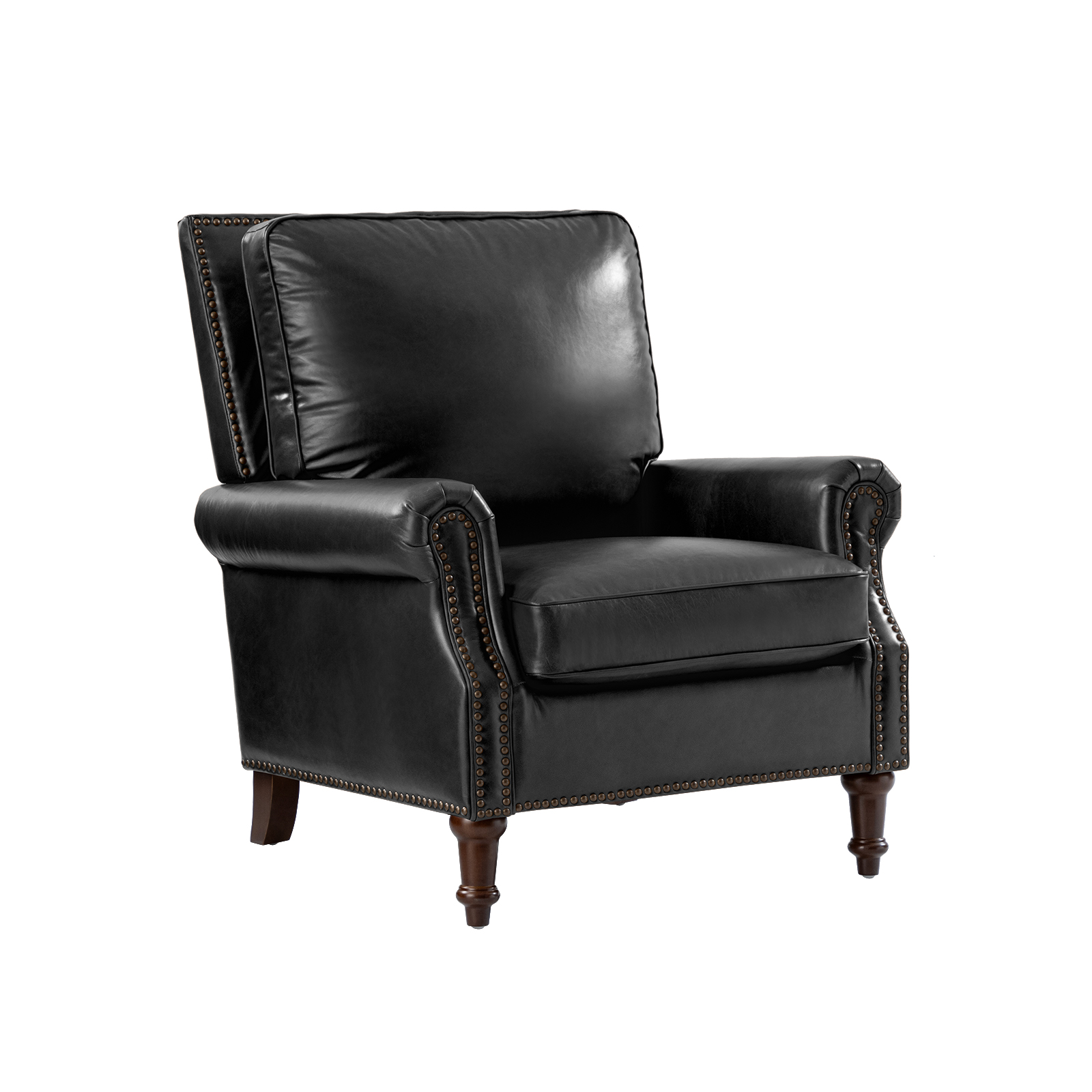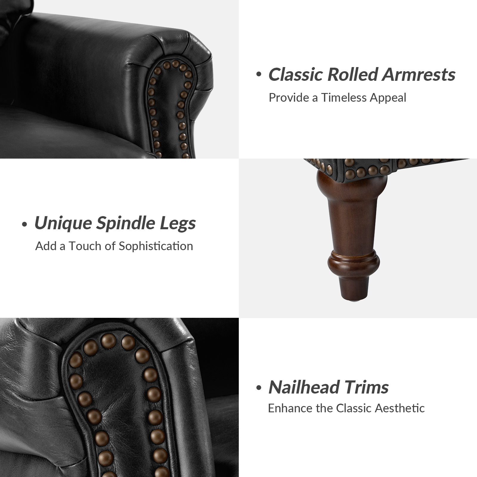 Experience timeless elegance with this genuine leather accent chair. This chair exudes luxury and sophistication. The classic rolled armrest design, complemented by copper nailhead trim, adds a touch of vintage charm. The spindle legs provide sturdy support while enhancing the overall aesthetic. Suitable for any living space, this chair combines comfort and style, offering a soft seating experience that you can enjoy for years to come. Indulge in the durable leather and the meticulous craftsmanship that make this piece a standout addition to your home.