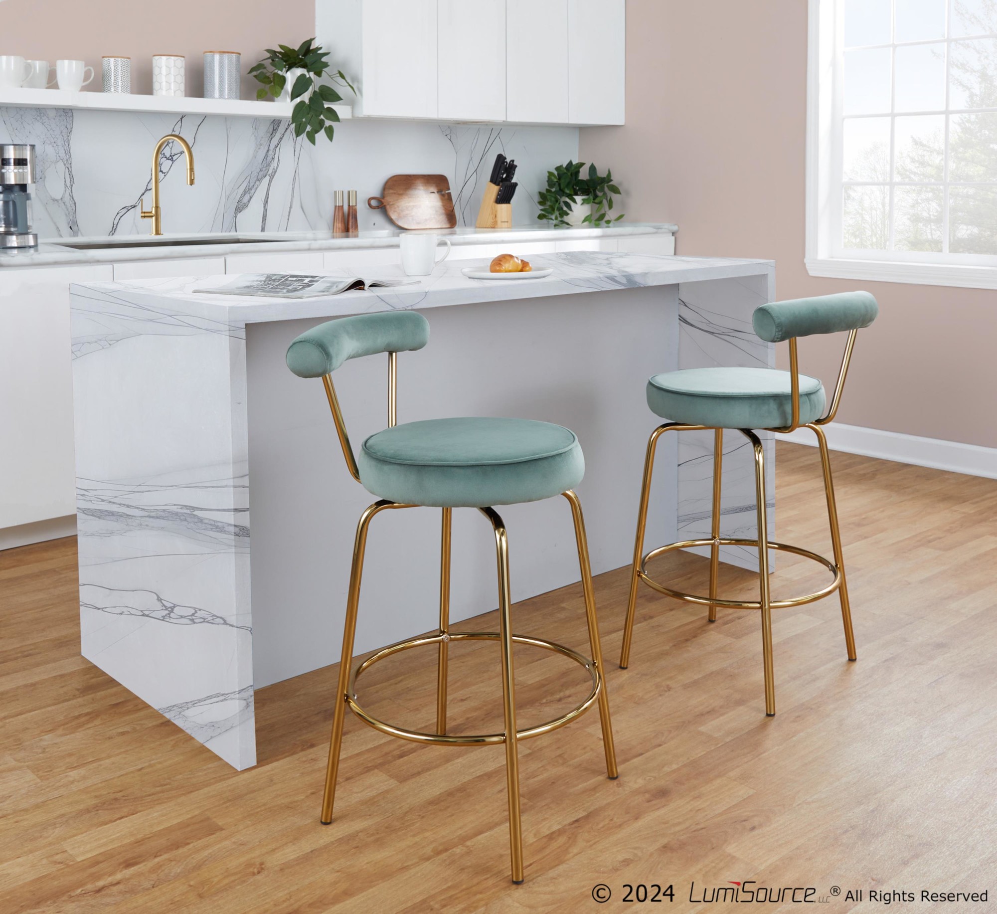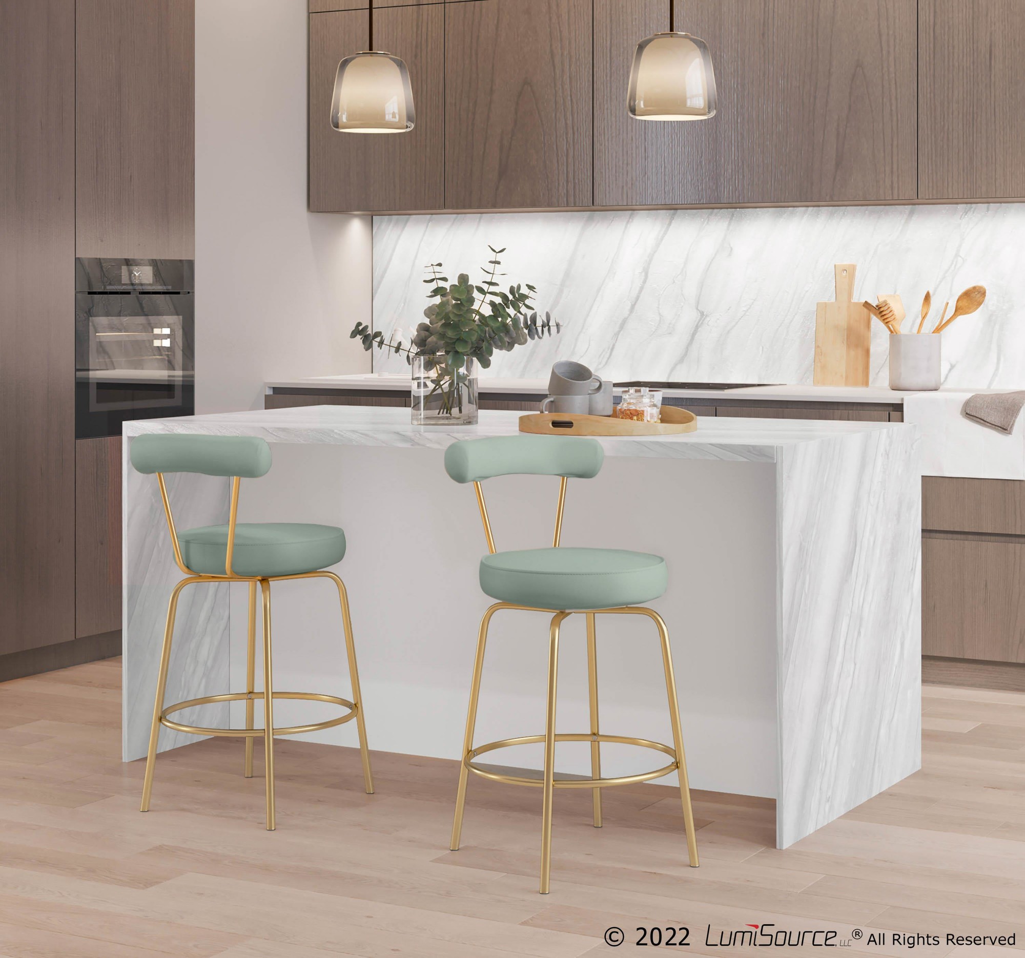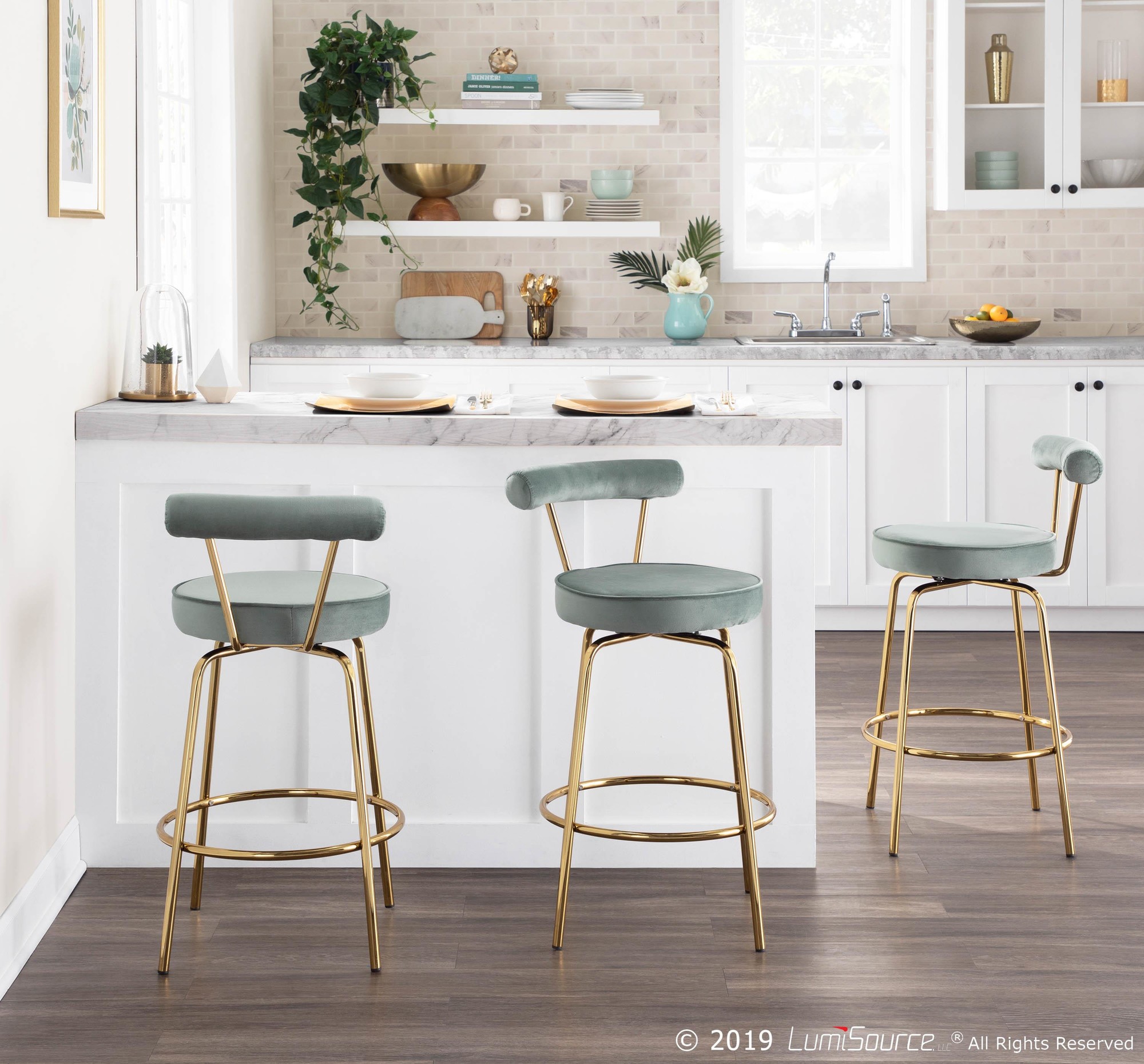 The Rhonda Gold and Green Art Deco Counter Stools bring an opulent and striking vibe to your space! These stools feature a sleek metal frame with tapered legs and a luxurious gold finish, complemented by plush velvet upholstery. Perfect for adding a touch of glam to your dining or counter area.