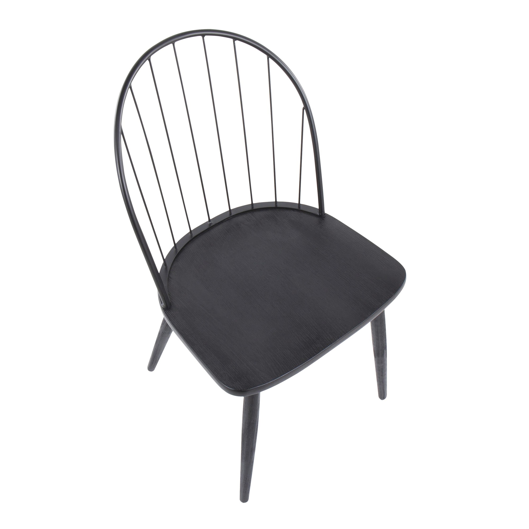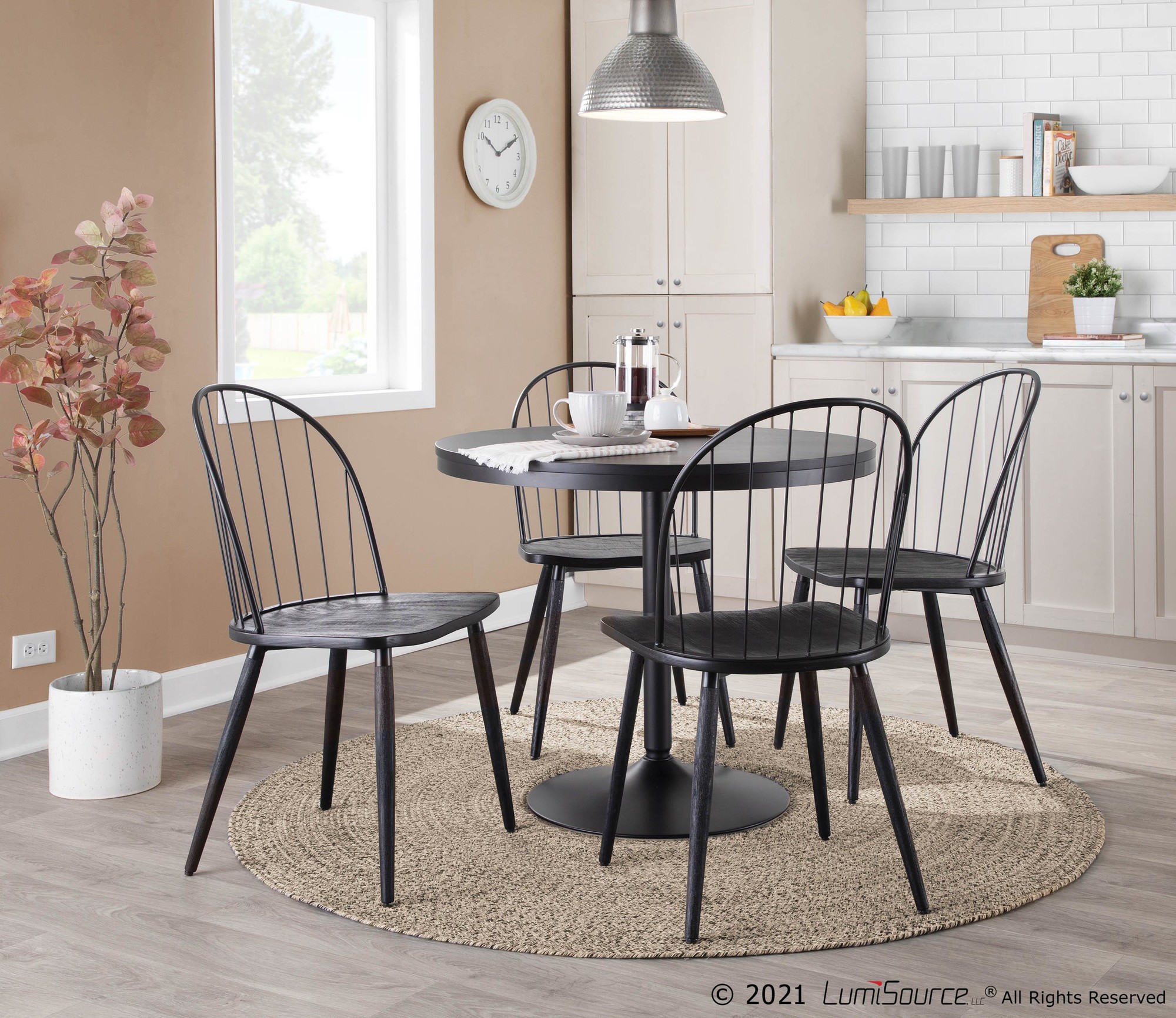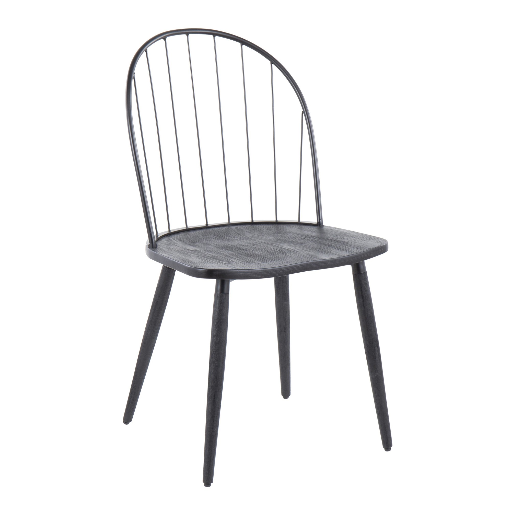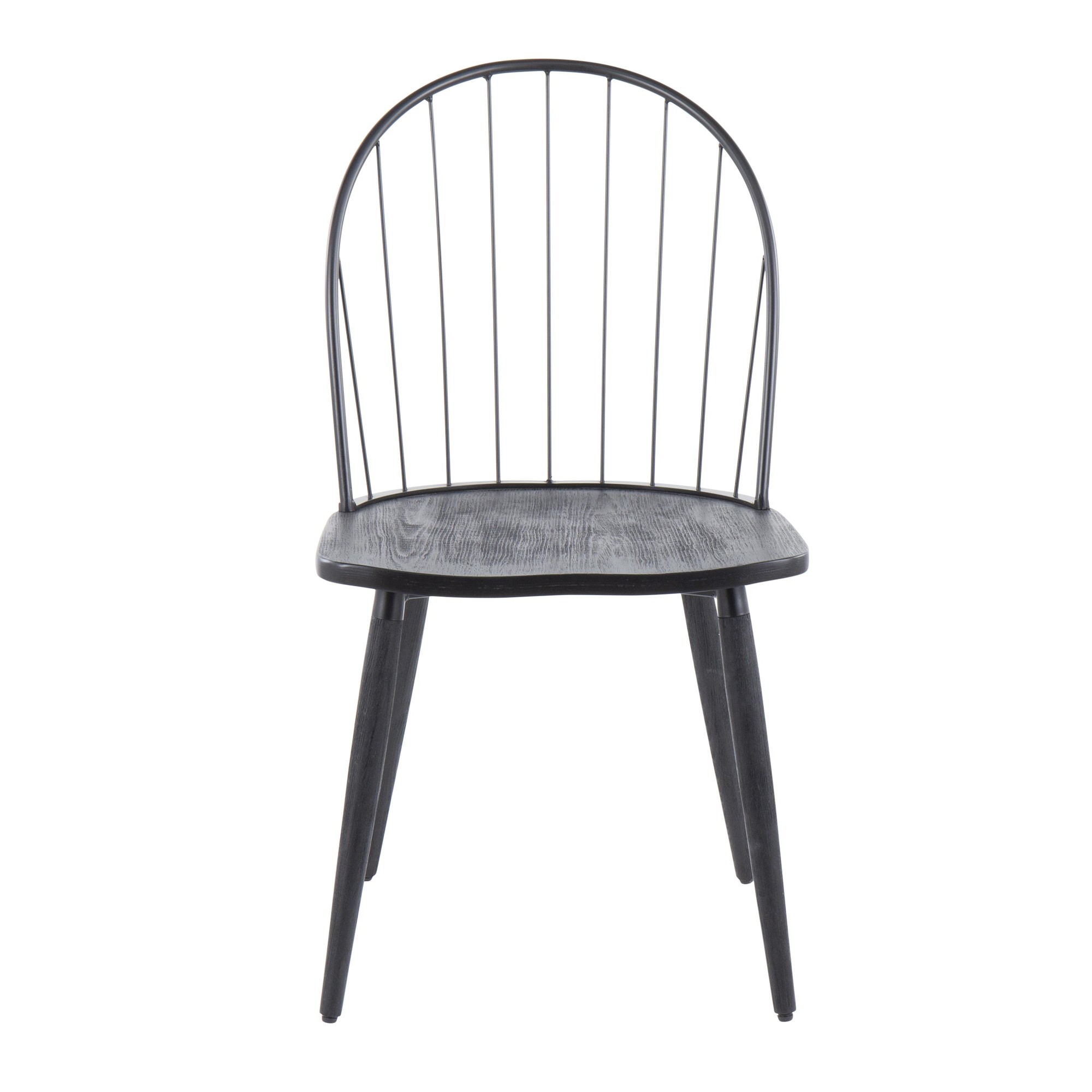 Add some edge to your dining space with these Riley Industrial Black Metal Wood High Back Chairs. This updated version of a traditional chair brings an industrial style to any room. Featuring a comfortable wood seat and a unique metal spindle backrest, these armless chairs are perfect for your dining table or as extra seating. Each chair has a weight limit of 250 lbs. These chairs are priced and sold in pairs. Dimensions: 21.25″L × 19″W × 35″H. Assembly Required: Yes. Material: Painted Steel, Bent Wood. Color: Black Metal, Black Wood.