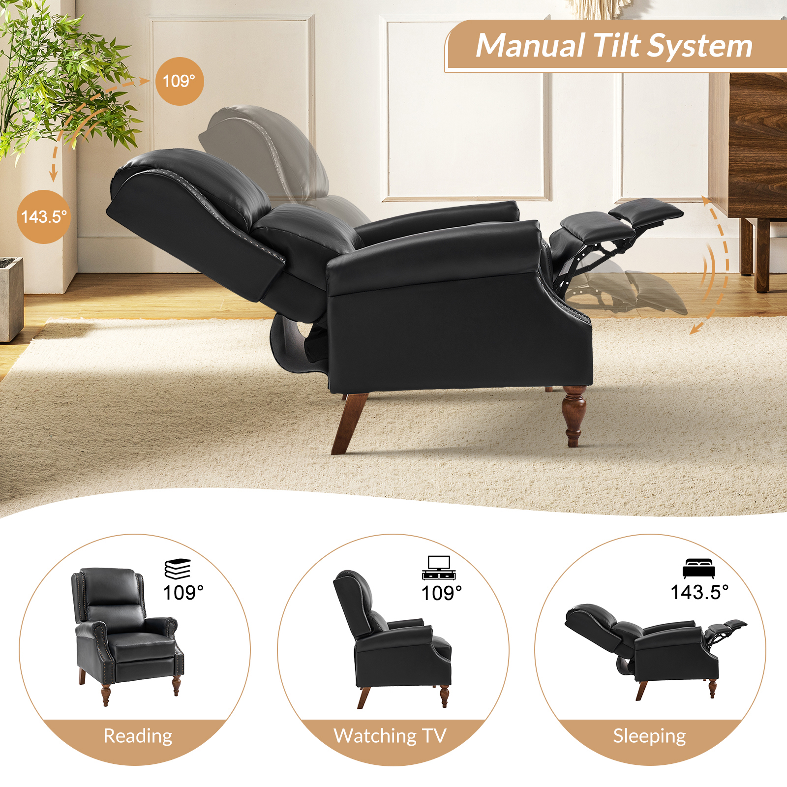 This recliner combines high-quality vegan leather with elegant details, like the roll arm design and nailhead accents, to create a piece that’s both beautiful and functional. The sturdy solid wood spindle legs ensure durability, while the distinctive wingback provides extra support and a touch of traditional charm.