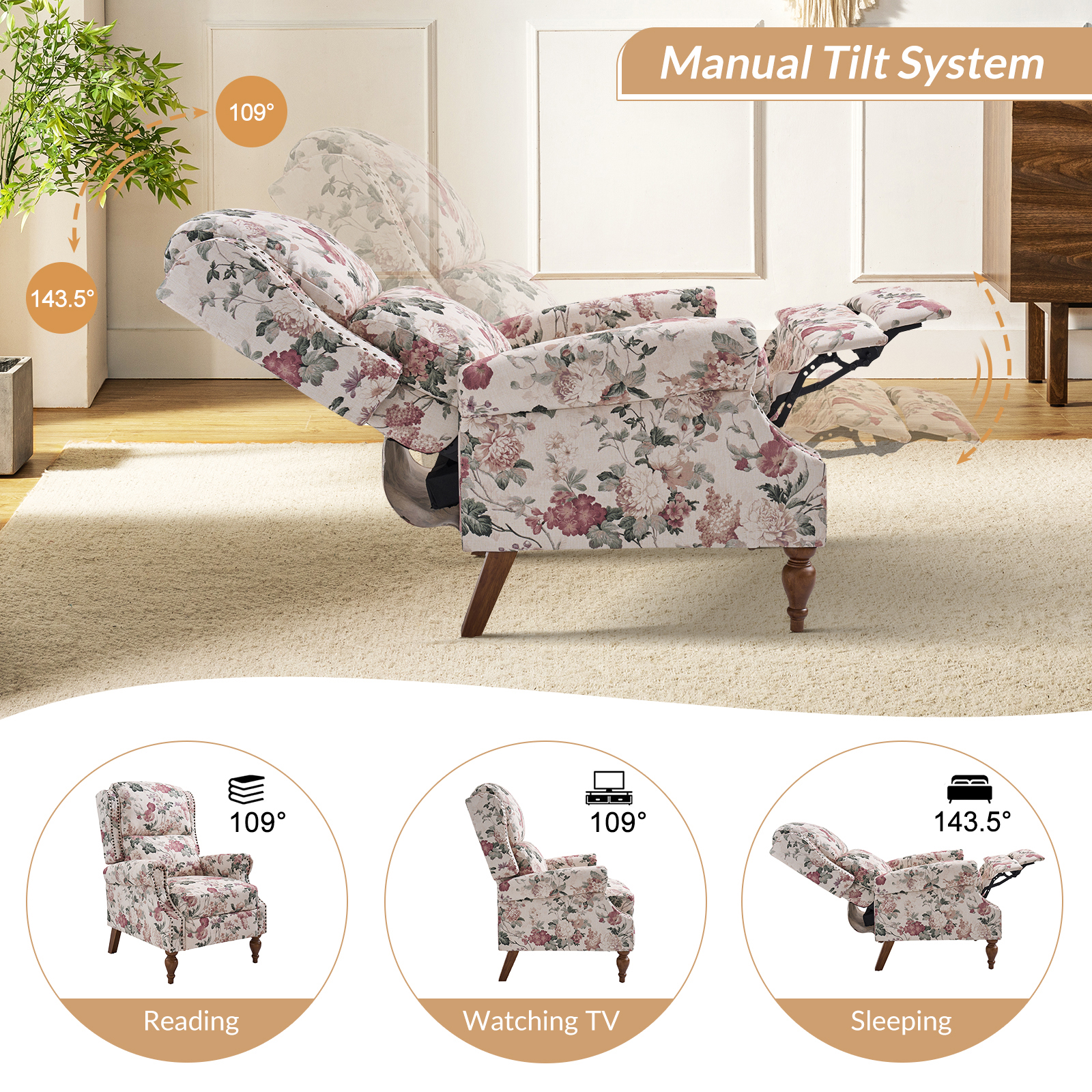 This traditional manual recliner is your ideal companion for relaxation! With captivating fabric patterns to personalize your space, a roll arm design, vintage nailhead trims, and a supportive wingback silhouette, it redefines comfy living. The effortless manual reclining mechanism invites you to unwind in any room after a long day.