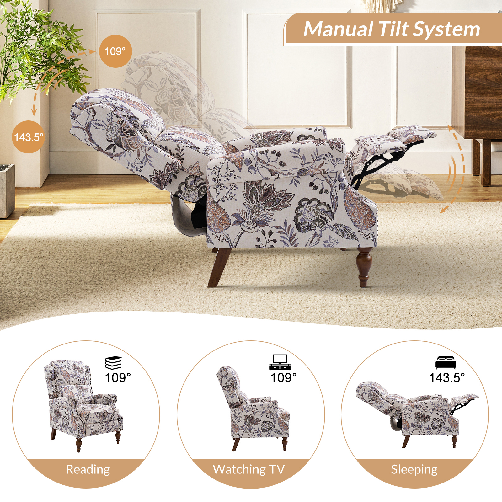 Enjoy the unique charm and personalized touch this recliner brings to your space. With its roll arm design, vintage nailhead trims, and supportive wingback silhouette, it’s designed for both comfort and long-term use. Experience relaxation redefined in your living room, bedroom, or office with its easy-to-use manual reclining mechanism.