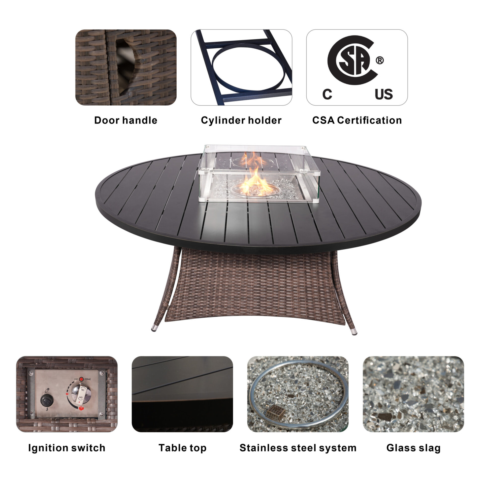Transform your outdoor space into a stylish and functional retreat with the Round Brown Wicker Outdoor Fire Pit Dining Set, Seats 4. This versatile set combines the warmth of a gas firepit with the comfort of dining furniture, making it perfect for entertaining guests or enjoying cozy evenings outdoors. Featuring a durable wicker design, tempered glass, and comfortable cushions, this set offers both elegance and practicality.