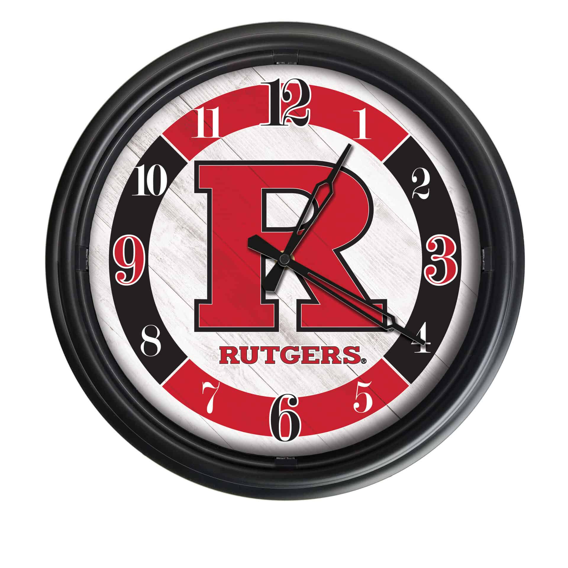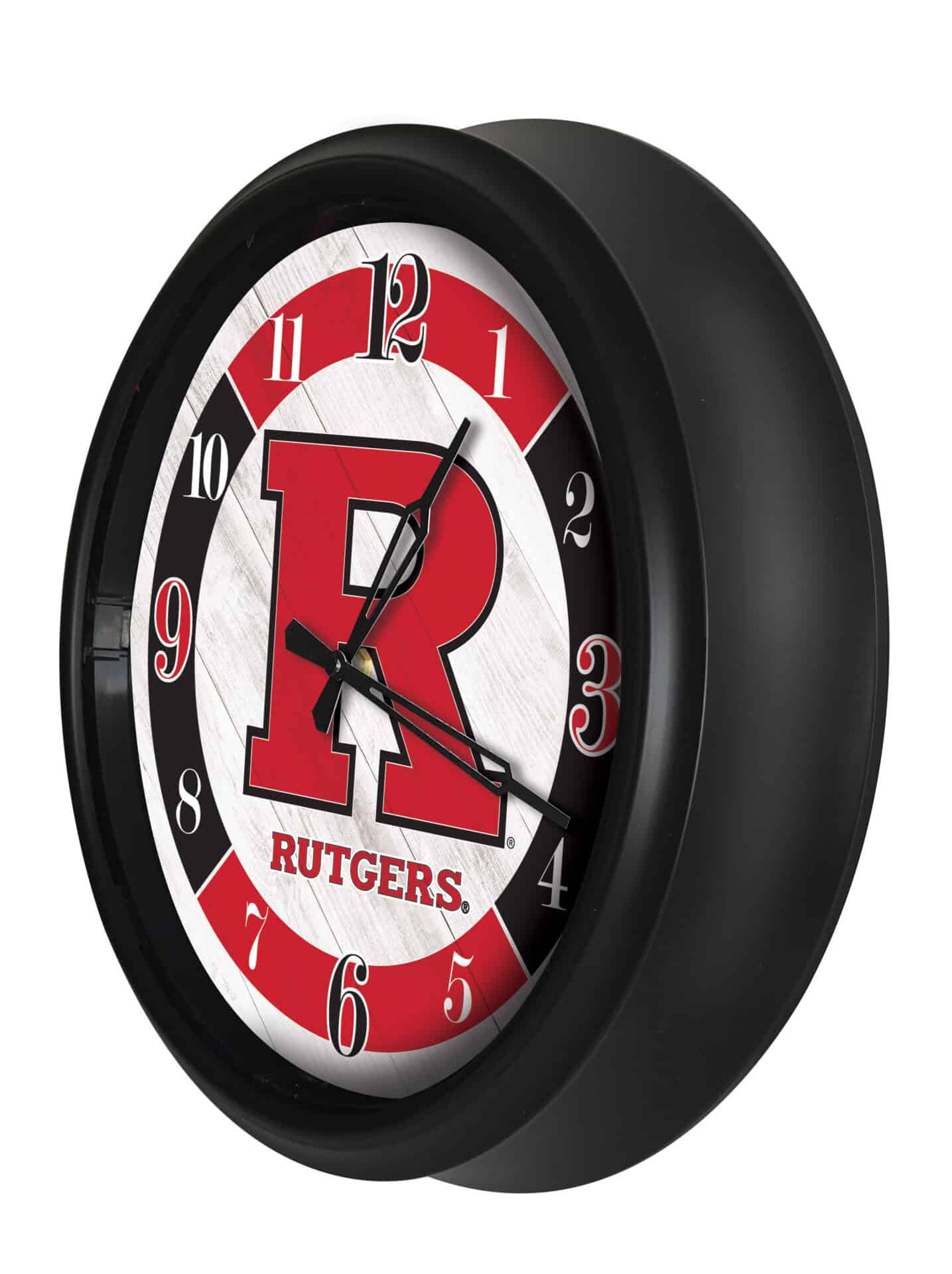 The “Rutgers 14-Inch Indoor/Outdoor LED Wall Clock in Black combines functionality with vibrant school spirit. This weather-resistant clock is designed to endure outdoor conditions while showcasing your pride. Featuring a durable UV resistant casing and a glass face lens sealed with a rubber gasket, it protects the inner clock from the elements. The clock face is illuminated by four LED lights that activate automatically in low light, ensuring visibility at all times. With its fade-free, vibrant digital artwork and accurate quartz movement, this clock is not just a timepiece but a statement piece for any space.
