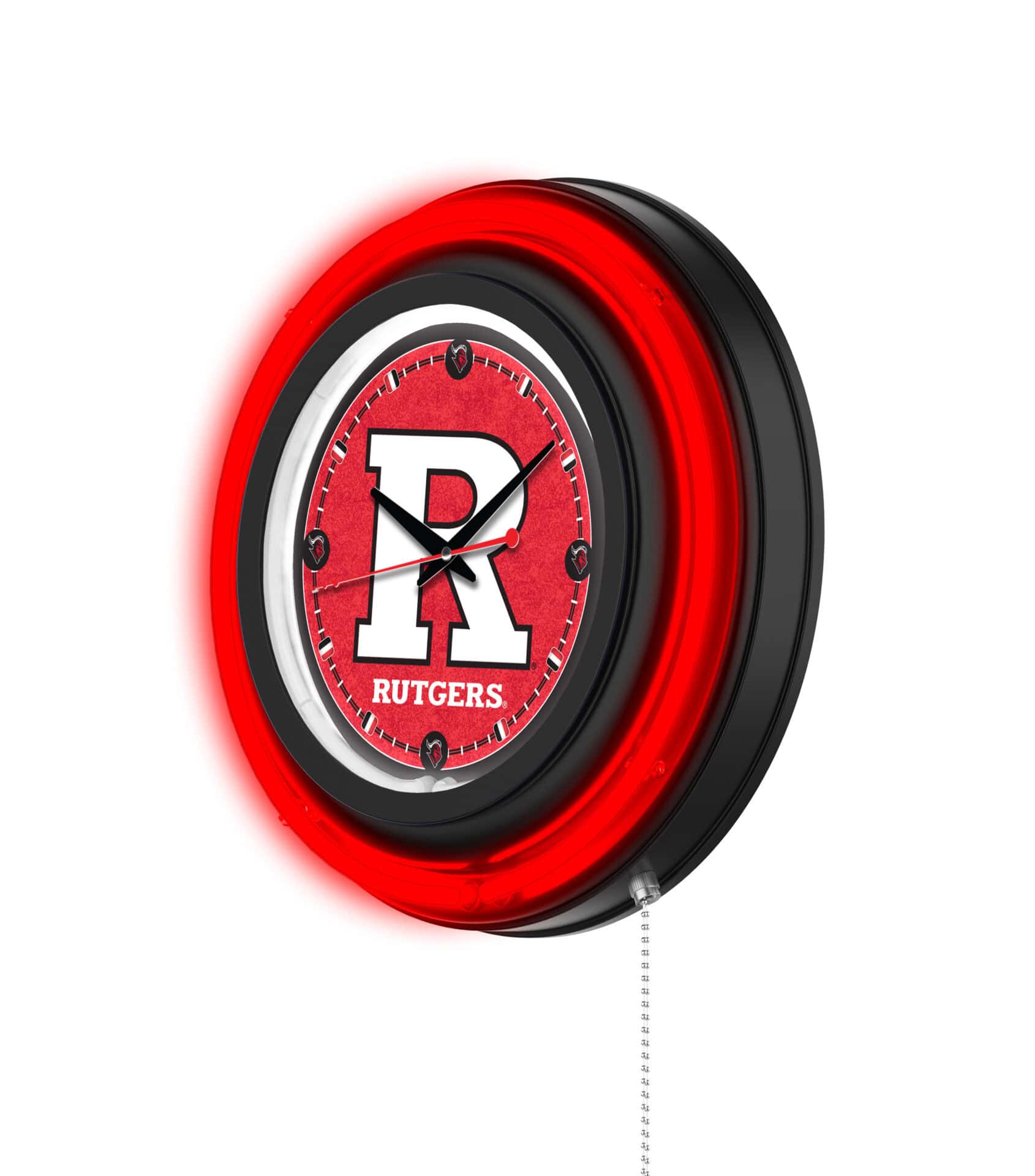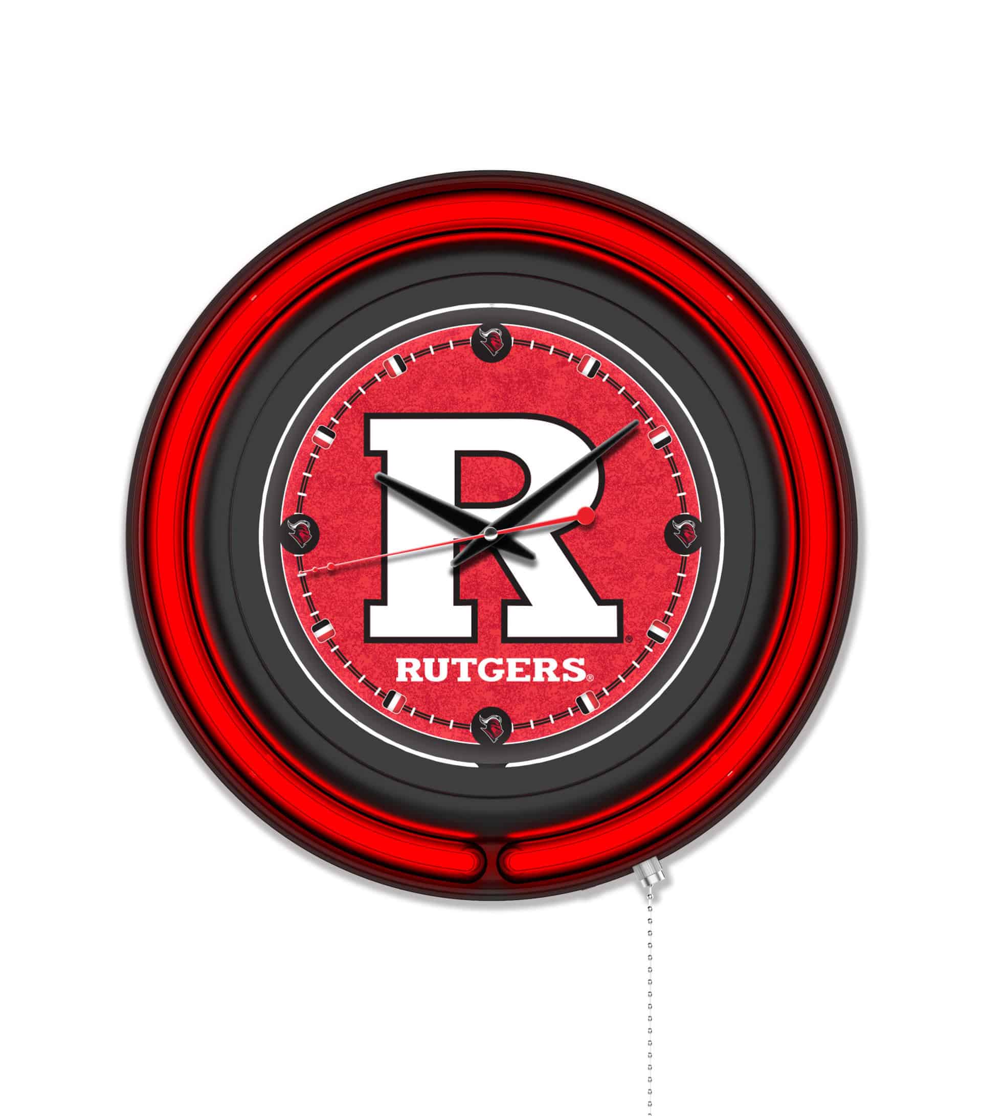 The “Rutgers 15-Inch Neon Logo Clock in Black is the ideal addition to your man cave, showcasing your school pride with vibrant, officially licensed artwork. This clock features a sleek black casing and a stunning neon outer ring that complements the custom-printed clock face, illuminated by a brilliant white inner neon ring. The neon rings can be easily switched on and off with a convenient pull chain located at the bottom of the clock. Powered by a UL Listed transformer, this clock connects to any standard 120V outlet, while the accurate quartz movement ensures precise timekeeping, requiring just a single AA battery (not included). Perfect as a gift for graduates, sports enthusiasts, or for personal use, this clock combines functionality with a stylish design.