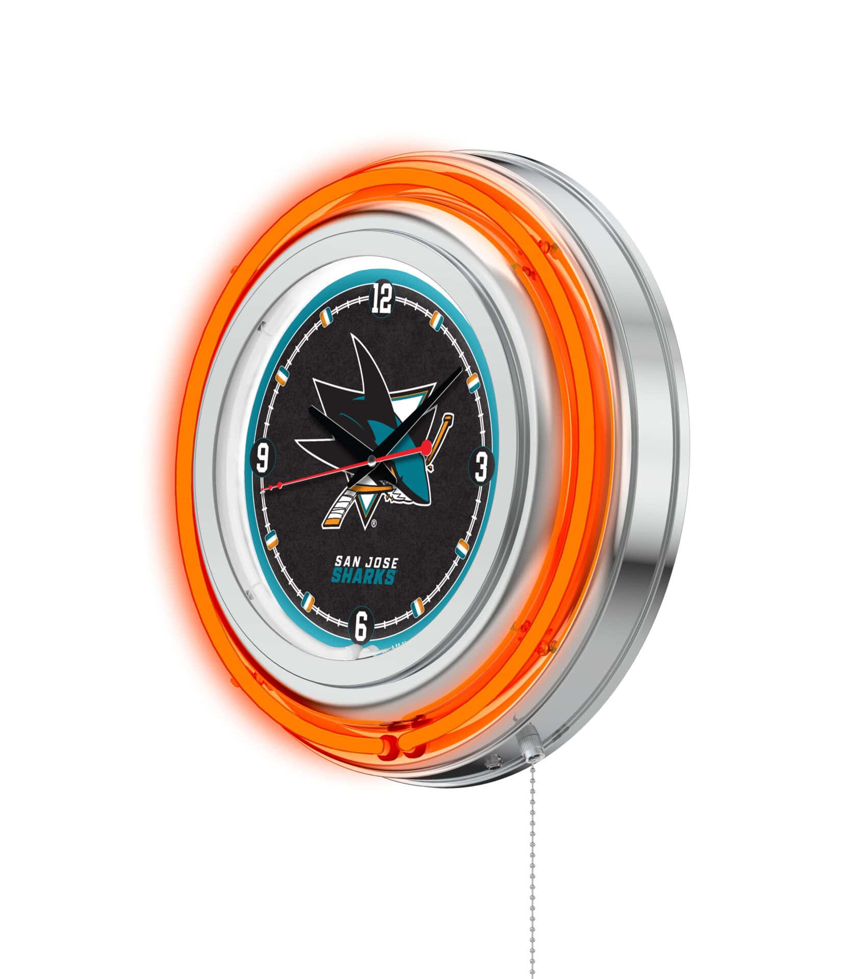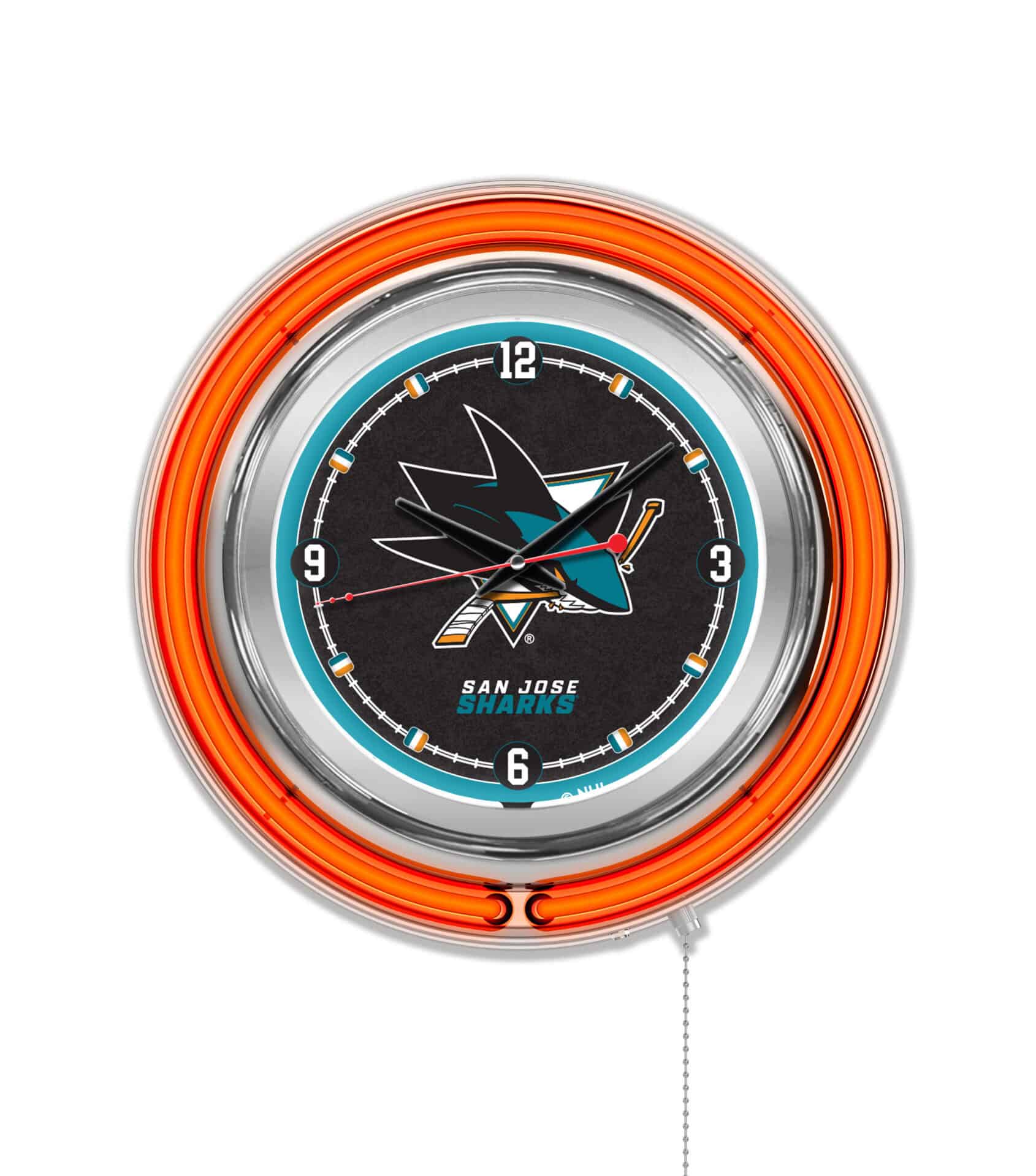 The San Jose Sharks 15-Inch Neon Logo Clock in Chrome combines vibrant design and functionality, making it the perfect addition to any man cave. With its stunning neon accents and chrome casing, this clock not only keeps you on time but also showcases your team pride. The brilliant white inner neon ring illuminates the custom printed clock face, while the outer neon ring comes in your team’s colors. A convenient pull chain allows for easy on/off operation, ensuring that you can enjoy the neon glow whenever you want. Powered by a standard 120V outlet and featuring accurate quartz movement, this clock is a must-have for sports enthusiasts.
