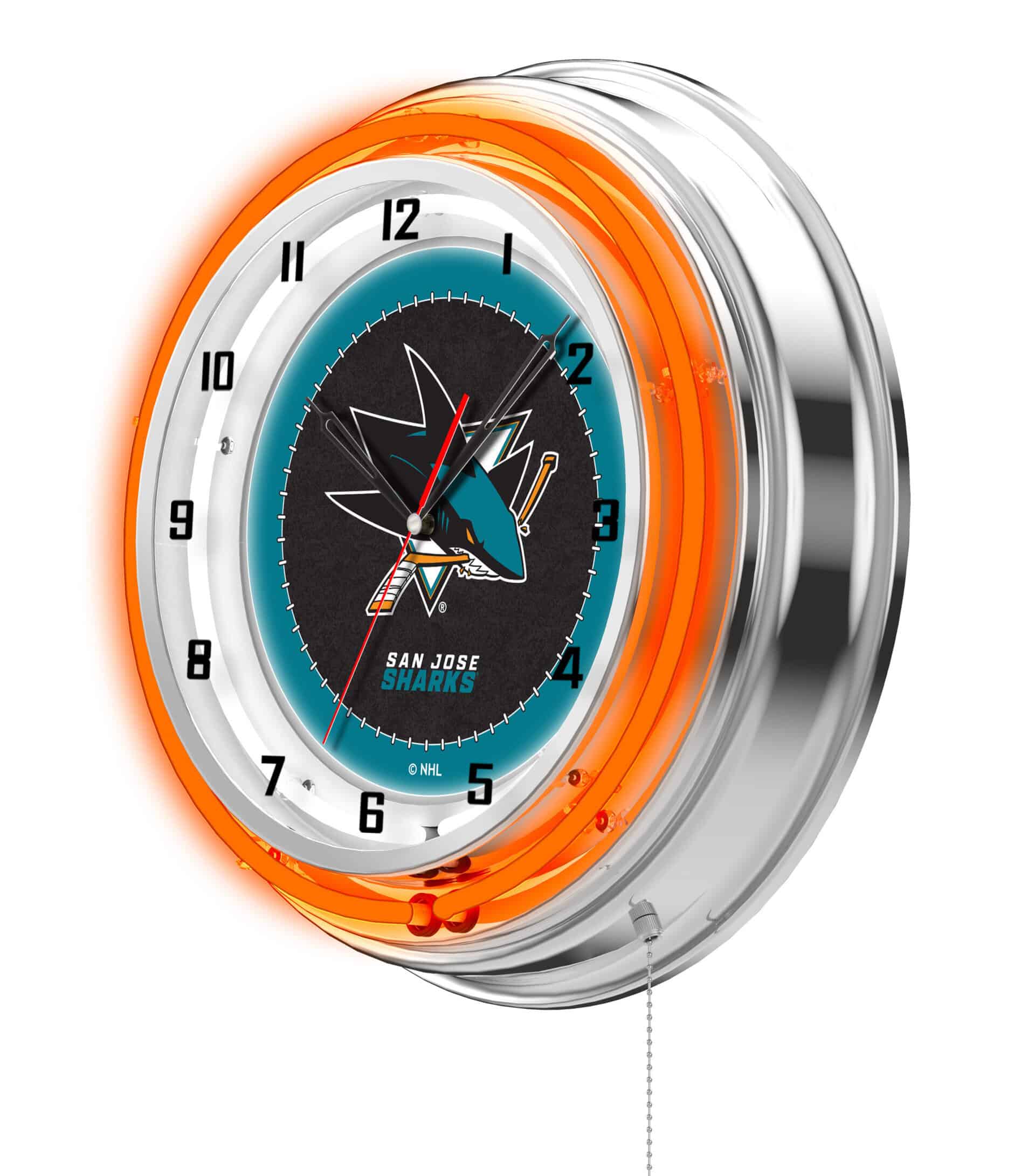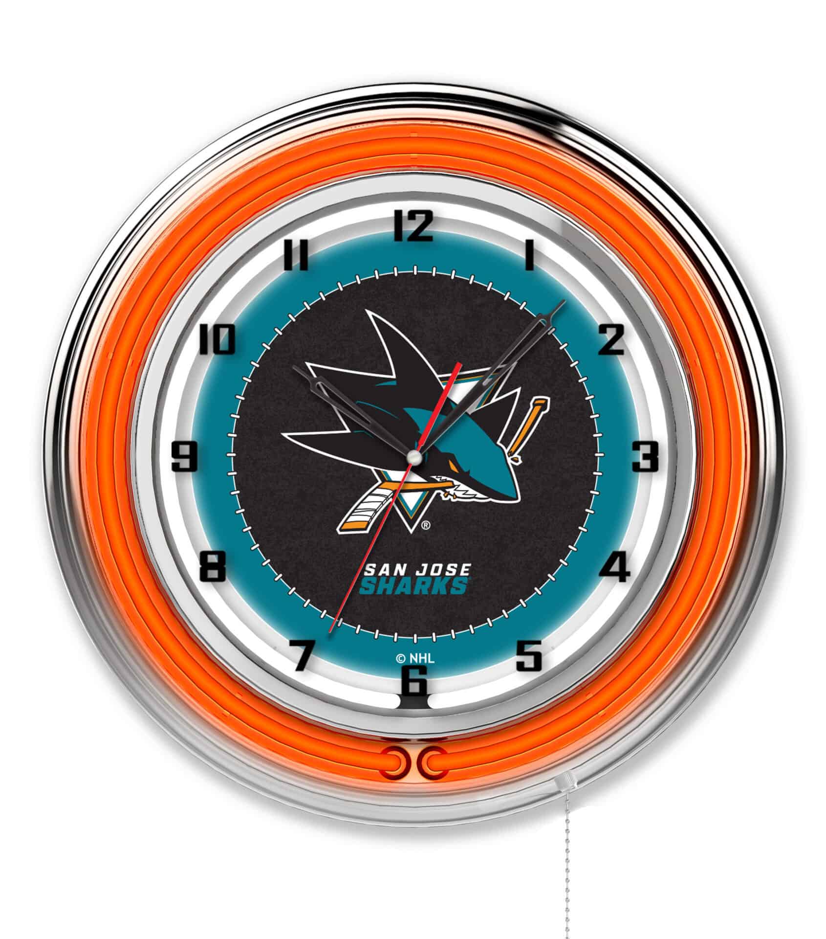The San Jose Sharks 19-Inch Neon Logo Clock in Chrome is the ultimate statement piece for any sports enthusiast’s man cave. This striking clock features a chrome casing and a color-specific neon outer ring that beautifully highlights the custom printed clock face. The clock is illuminated by a brilliant white inner neon ring, creating a vibrant display that showcases your team pride. With a convenient pull chain for easy on/off operation and a UL Listed power transformer, this clock is both functional and stylish. Accurate quartz movement ensures you always have the correct time, powered by a single AA battery (not included). It’s the perfect gift for any sports super fan or a fantastic addition to your own collection.