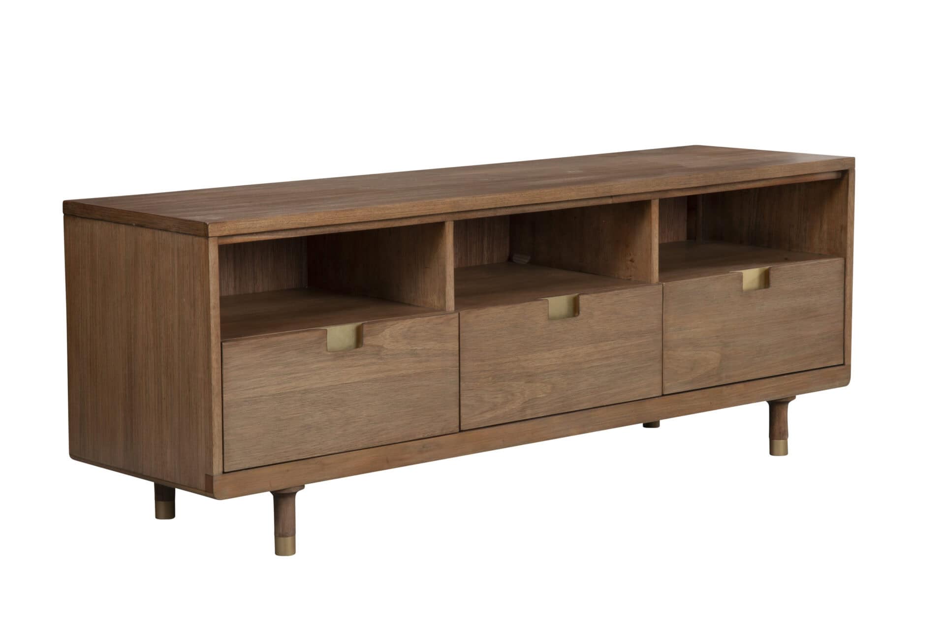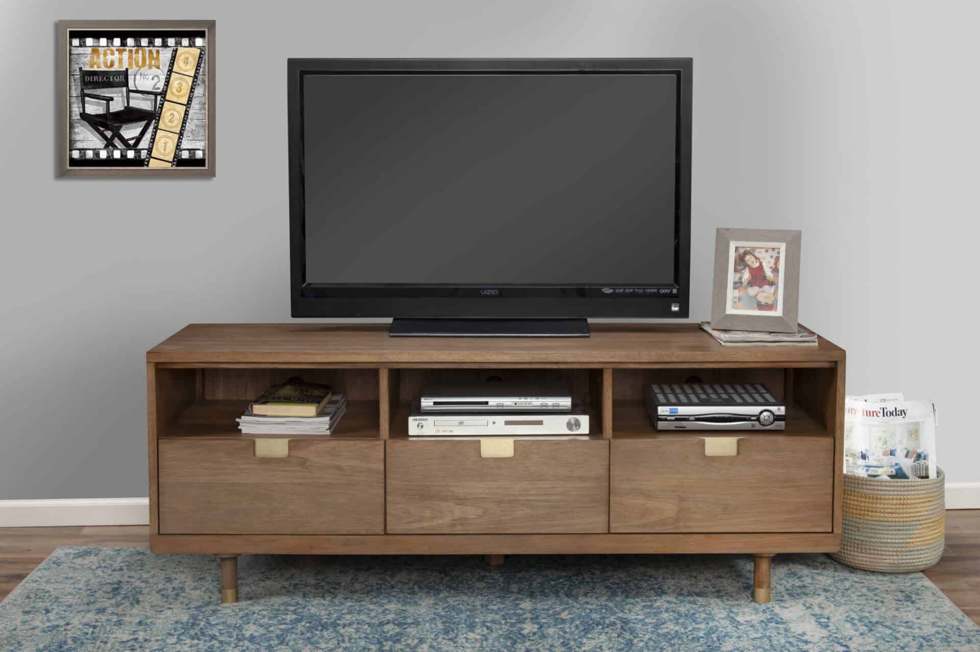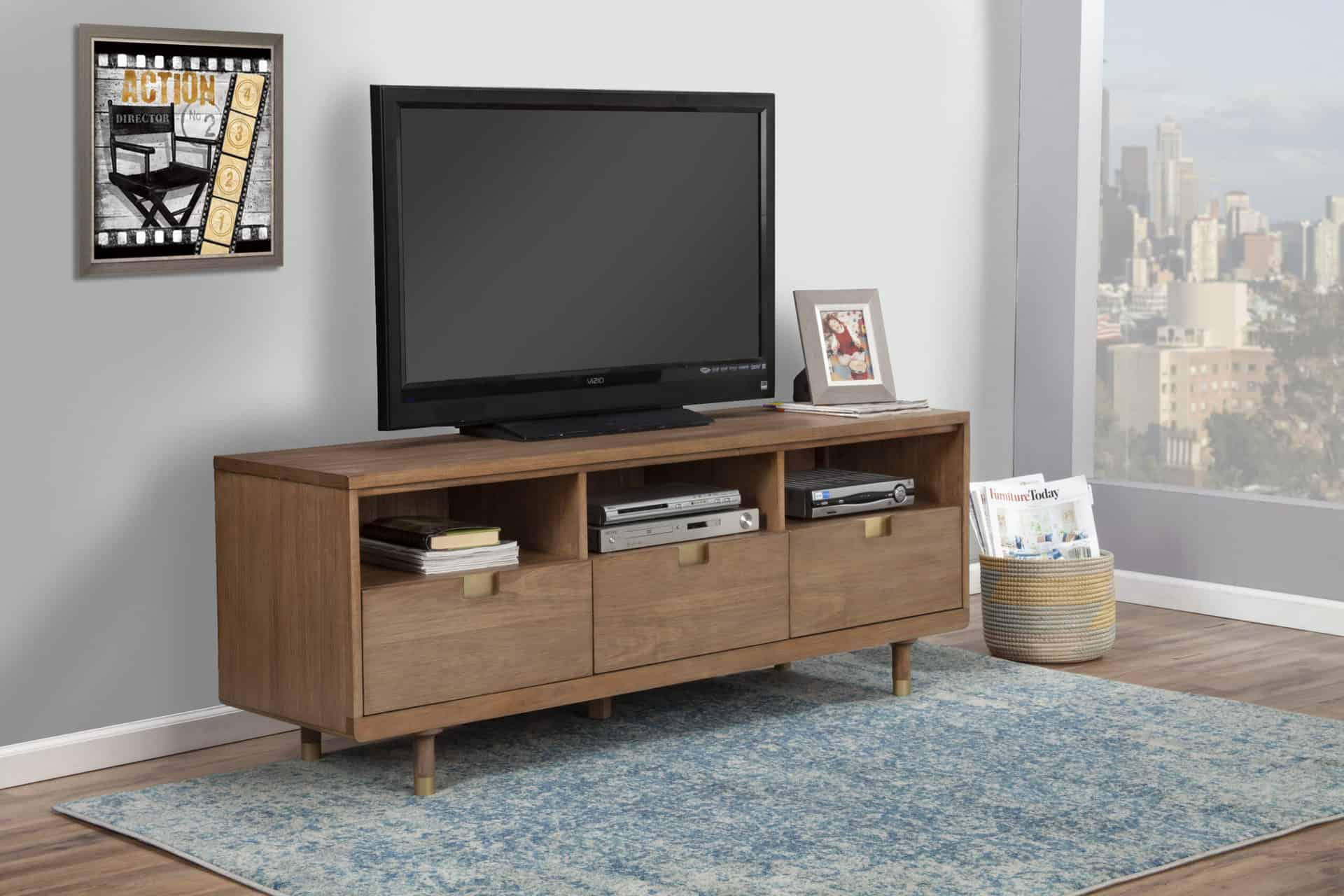Whether it’s movie night or time for the big game, your TV becomes the focal point of your home. The Sand Mahogany Contemporary TV Console With Storage and Cord Management features a clean-lined rectangular silhouette crafted from beautiful mahogany. Designed for both style and functionality, it offers three storage drawers and open shelving with integrated cord management. This console accommodates TVs up to 70 inches, making it the perfect centerpiece for your living space.