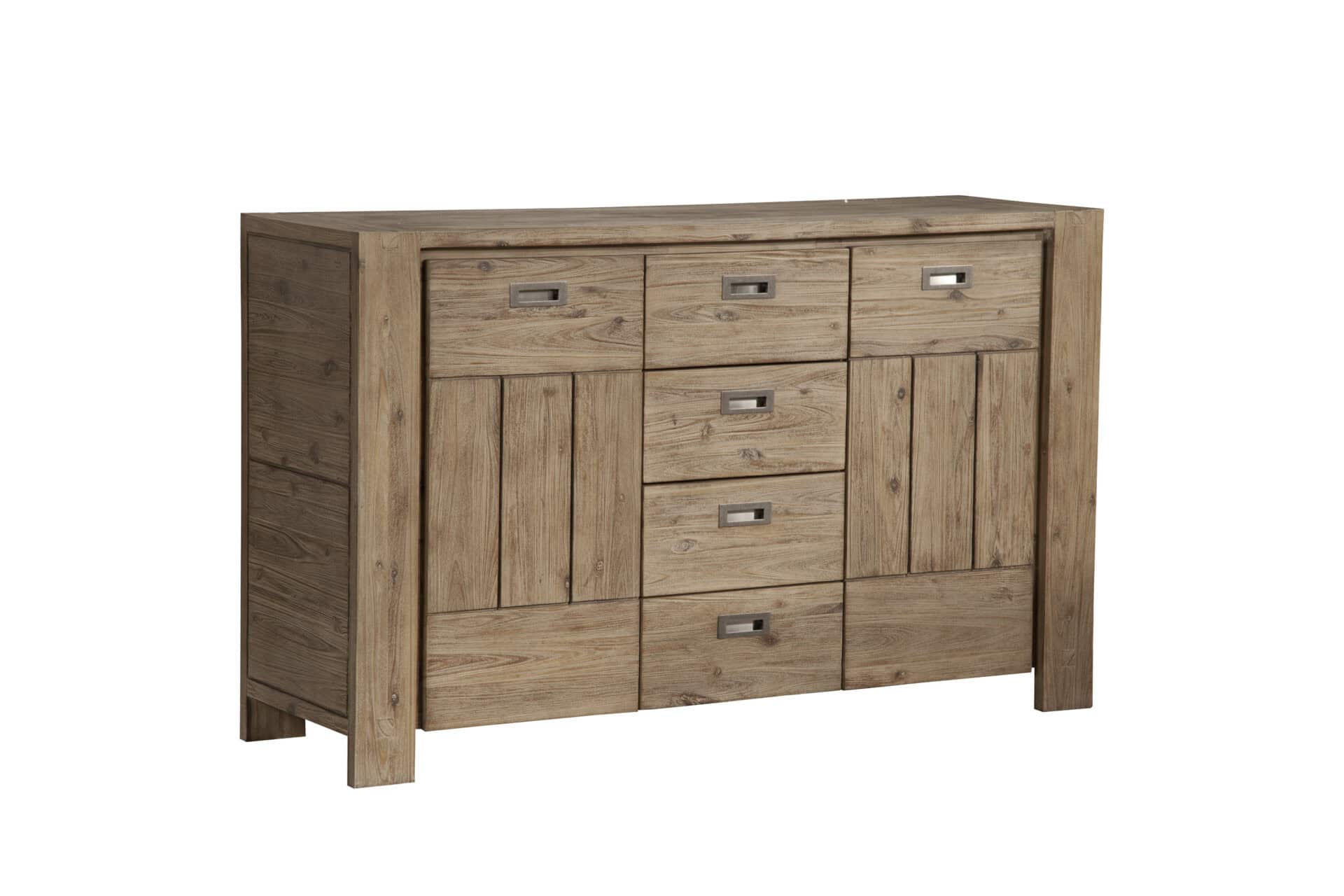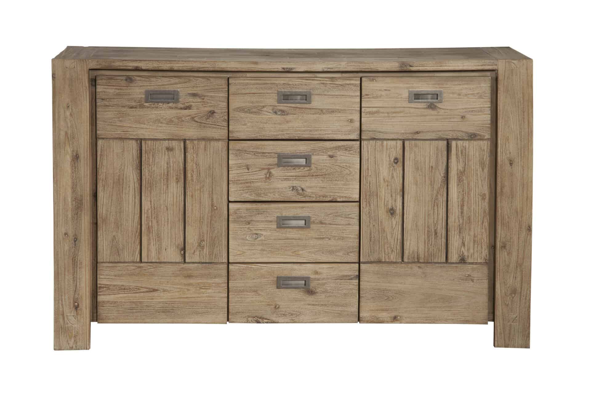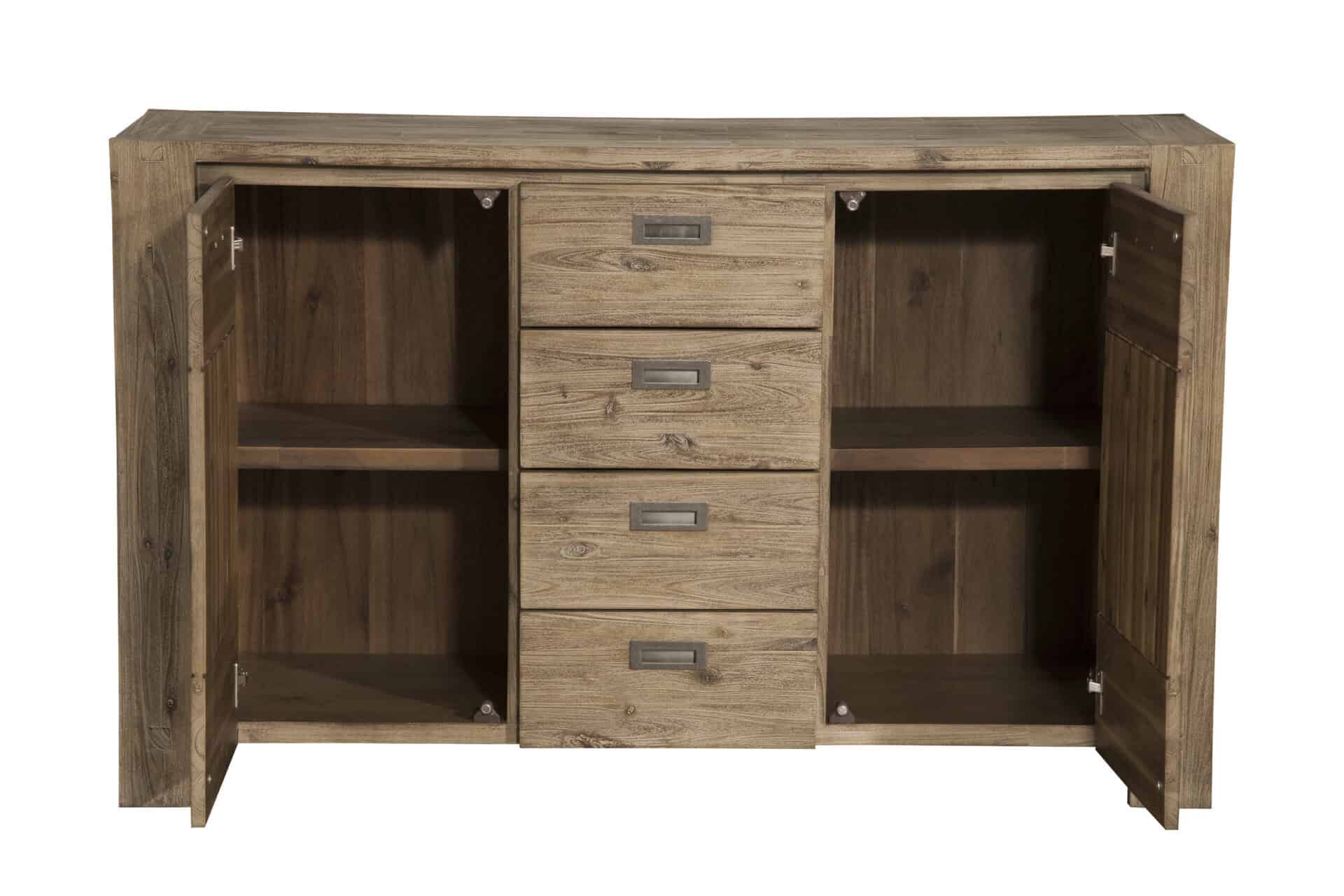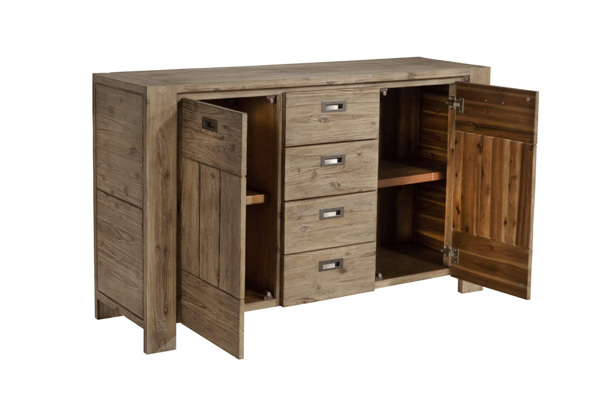 The Sandblasted Antique Natural Acacia Sideboard with Brass Hardware is a versatile and elegant addition to any rustic or contemporary dining space. Featuring a sandblasted antique natural finish, this sideboard is crafted from solid acacia wood and complemented by brass hardware, delivering a blend of durability and timeless design. Fully assembled for your convenience, it offers ample storage with four spacious drawers and cabinets equipped with adjustable shelves.
