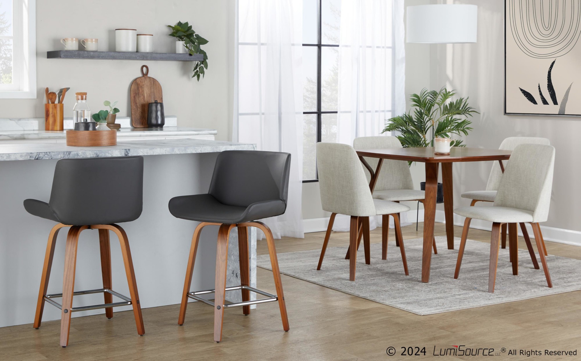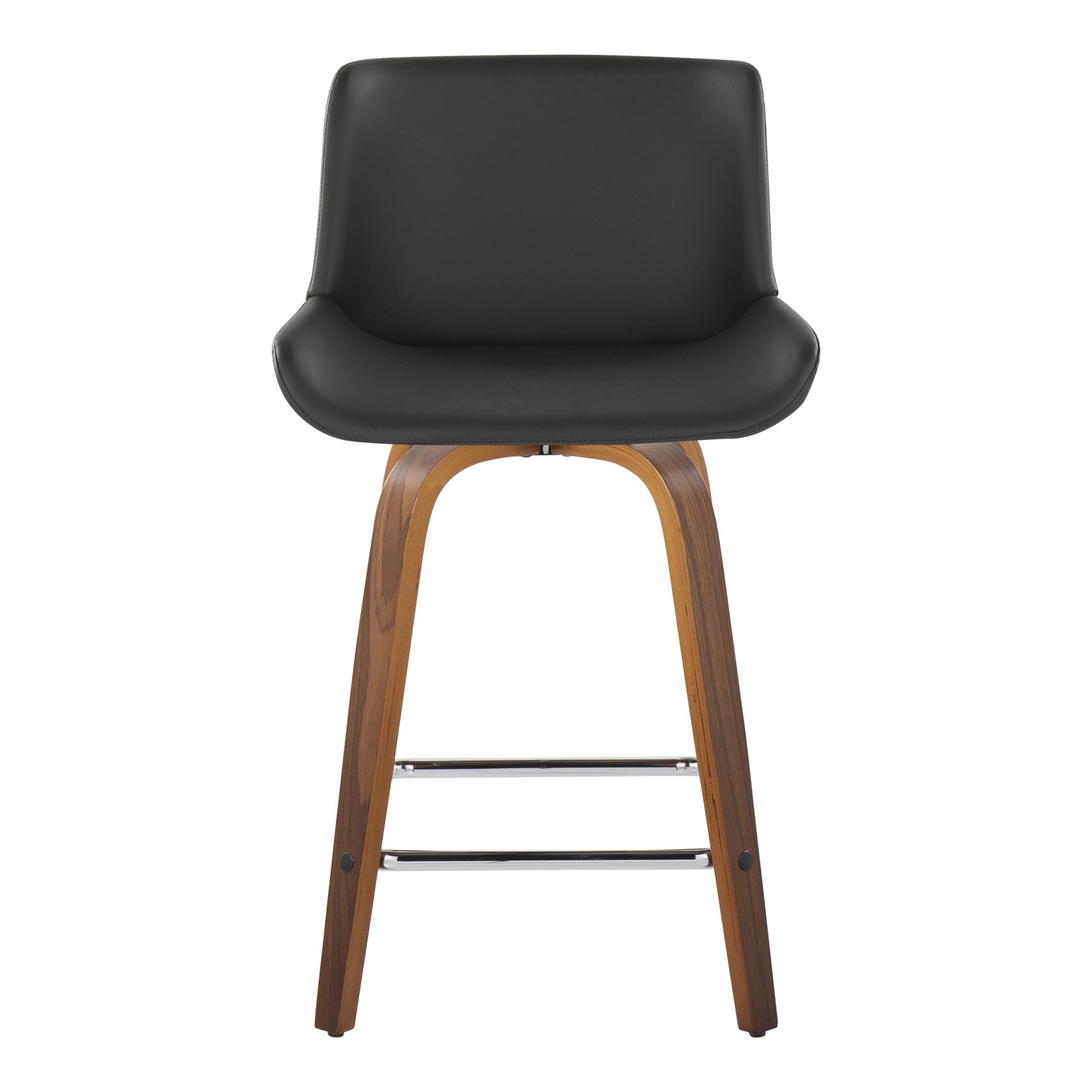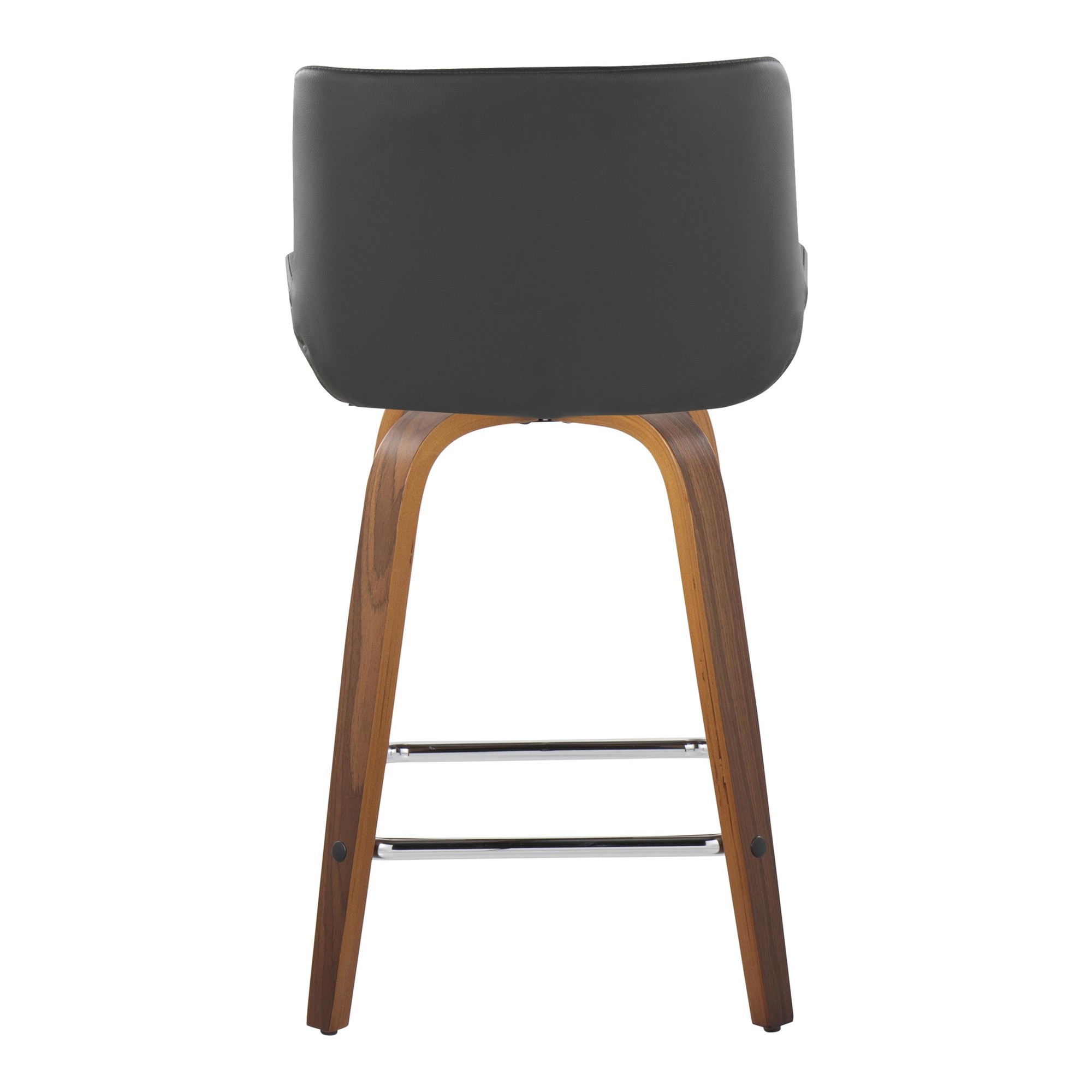 These stools are designed to provide a comfortable seating experience. The 360-degree swivel function adds convenience, allowing you to turn and engage with your surroundings effortlessly. The combination of the walnut wood finish, chrome footrest, and grey faux leather upholstery creates a sophisticated and inviting look.