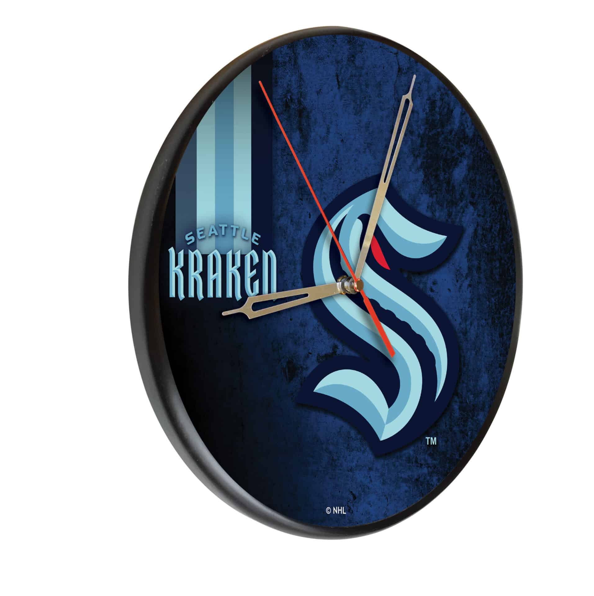 The Seattle Kraken 13-Inch Solid Wood Clock in Black (Alternate) is an ideal addition to any fan cave, showcasing your team pride while providing functionality. This clock features first surface, digitally printed graphics made with UV inks that resist fading over time. With accurate quartz movement, this clock ensures you always know the time, powered by a single AA battery (not included). The recessed keyhole hanger allows for easy installation, providing a sleek look on your wall. Whether for yourself or as a gift for a sports enthusiast, this clock is a perfect choice.