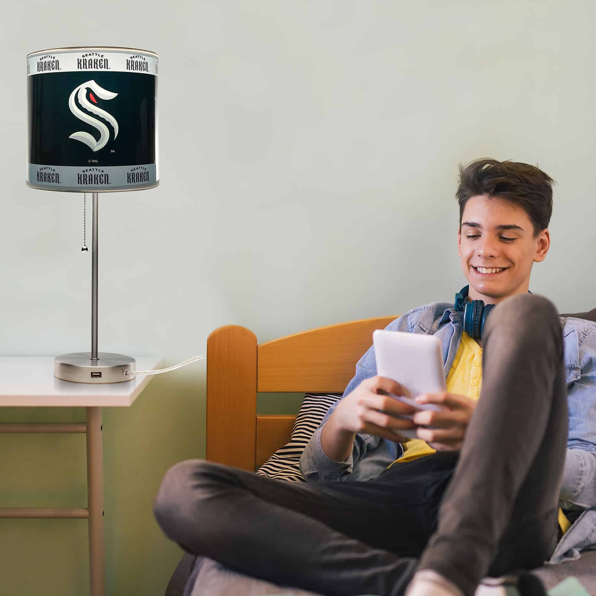 This sleek Seattle Kraken Chrome Lamp with USB Charging Station is the perfect addition to any room in your home or office. The lamp features a stylish design, a USB charging station, and a unique patented lampshade program that allows you to change your room décor quickly and affordably. The lampshade insert is printed with a high-resolution Seattle Kraken design and is officially licensed by the NHL. Stay charged and show your team pride!