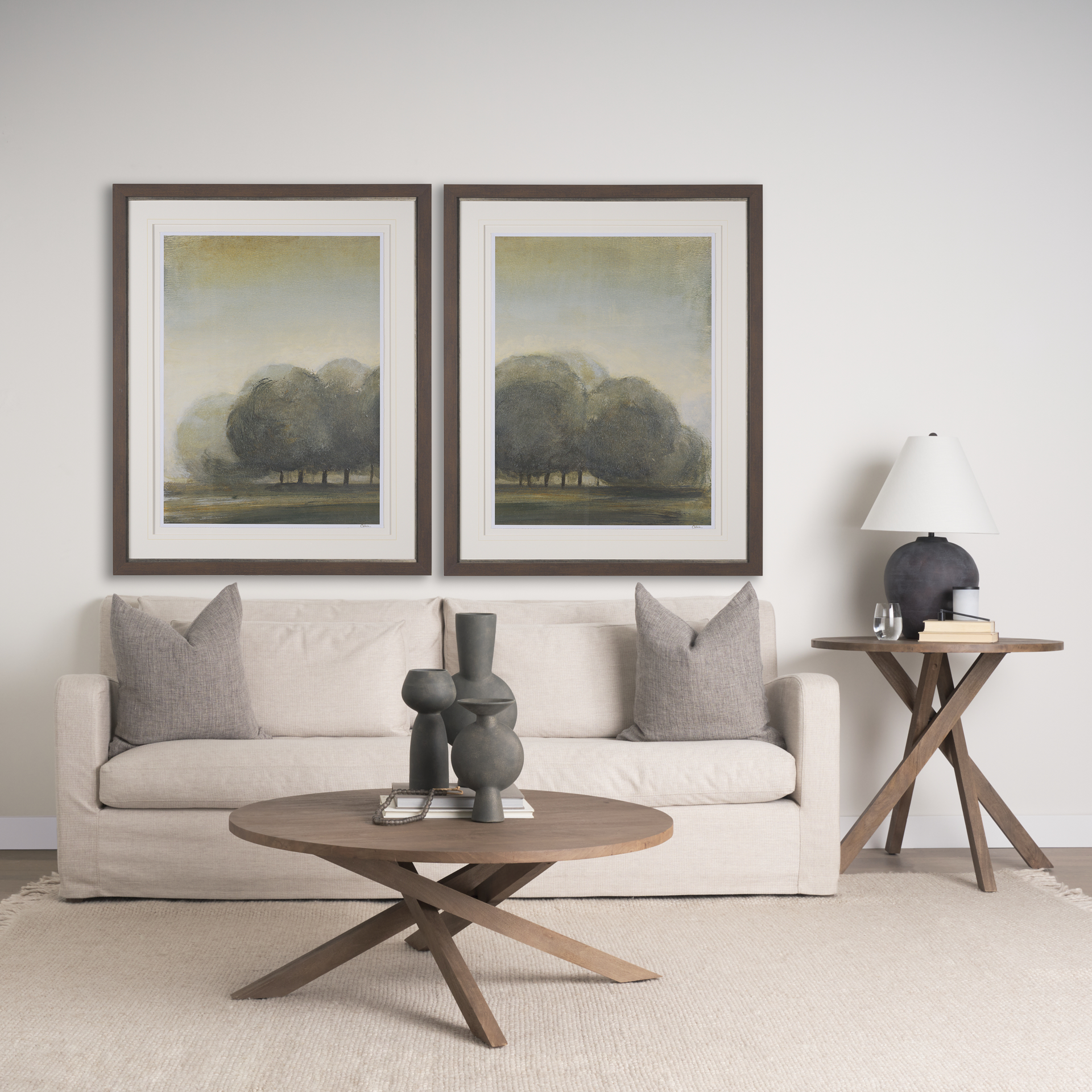 This captivating treescape, born from the imagination of an in-house artist, depicts a serene treescape silhouette shrouded in the mists of an early fall morning. Each piece is hand-embellished, featuring high gloss accents on the tree trunks and semi-gloss highlights on the treetops and grass. The varying gloss levels create a stunning effect, mimicking the way sunlight filters through the fog.