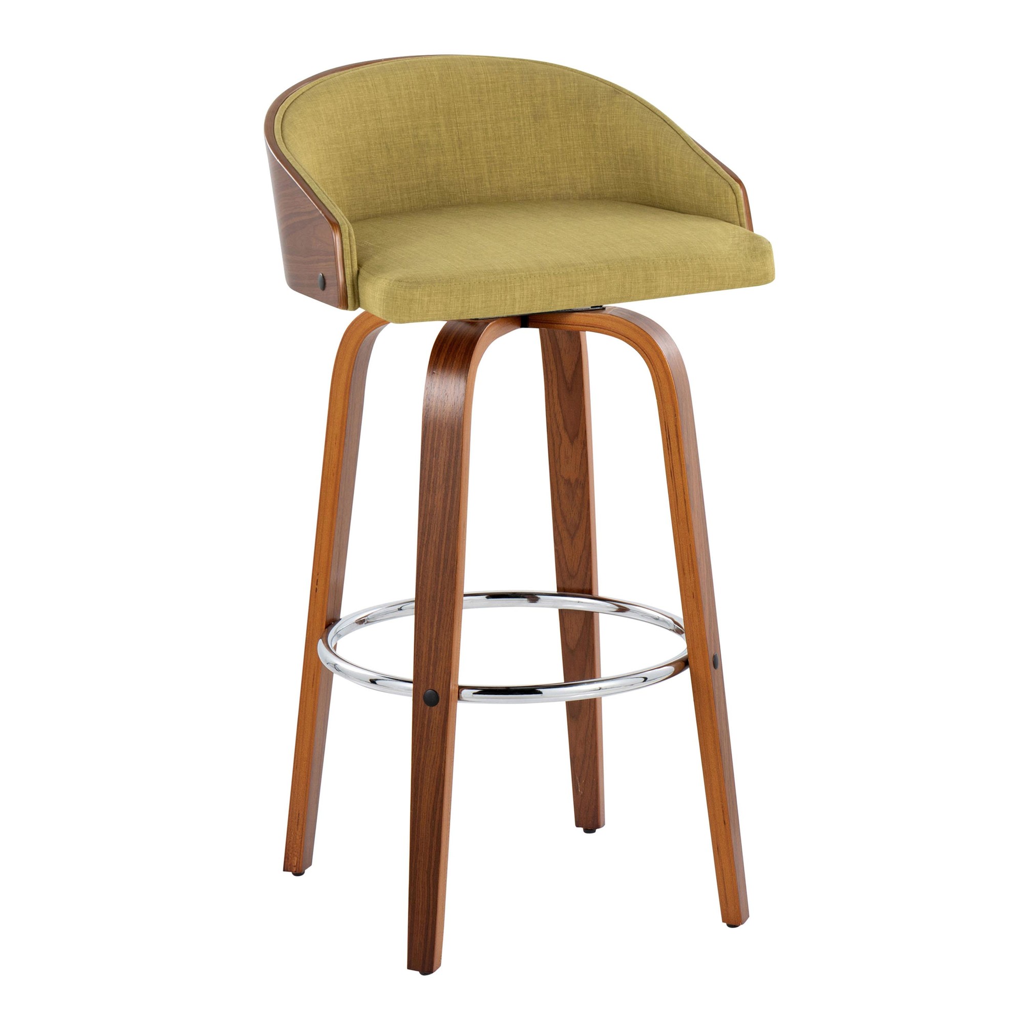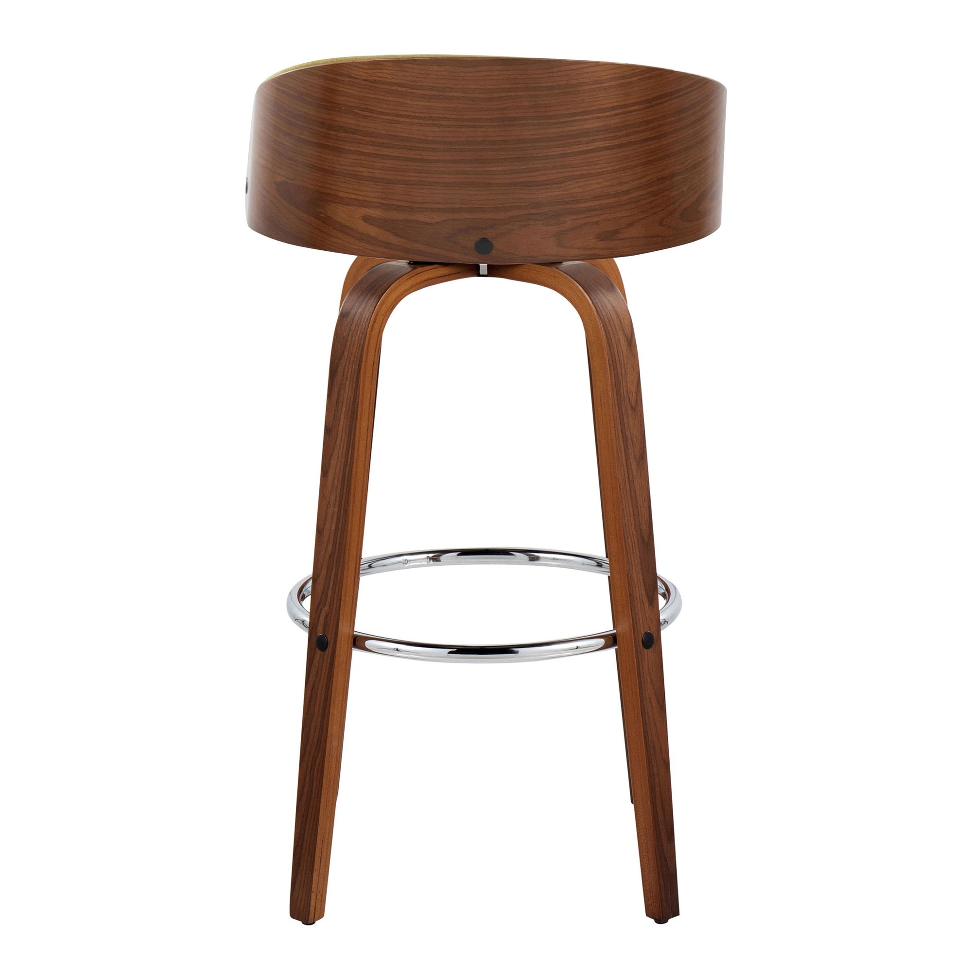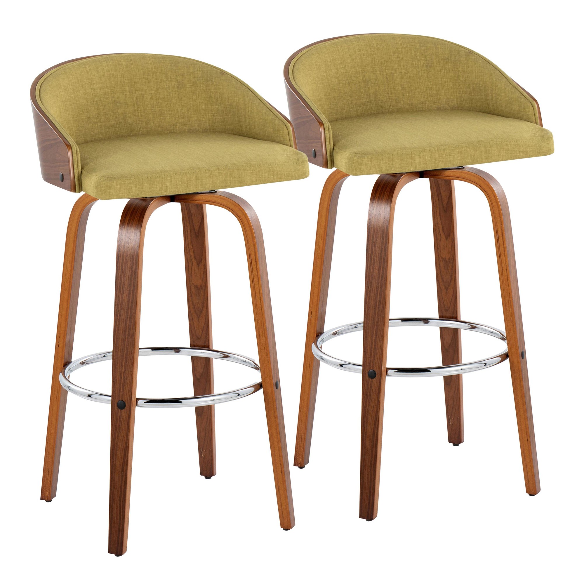 The Shiraz 30-Inch Mid-Century Green Swivel Barstools are designed to introduce a dynamic twist to your space. These barstools combine stylish woven fabric upholstery with walnut-finished bent wood, creating a mid-century modern aesthetic. The swivel seat and built-in footrest offer both style and functionality, making these stools a perfect addition to any bar or counter area. Sold in pairs.