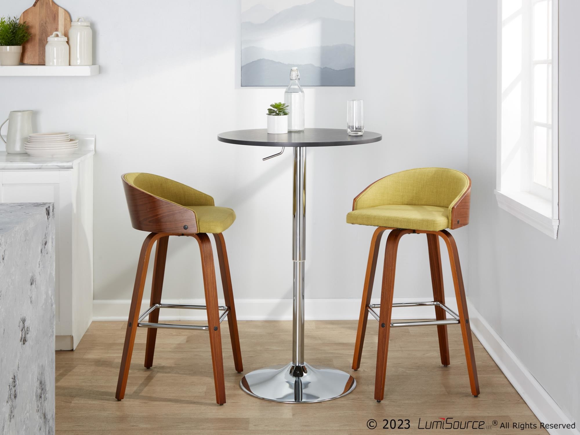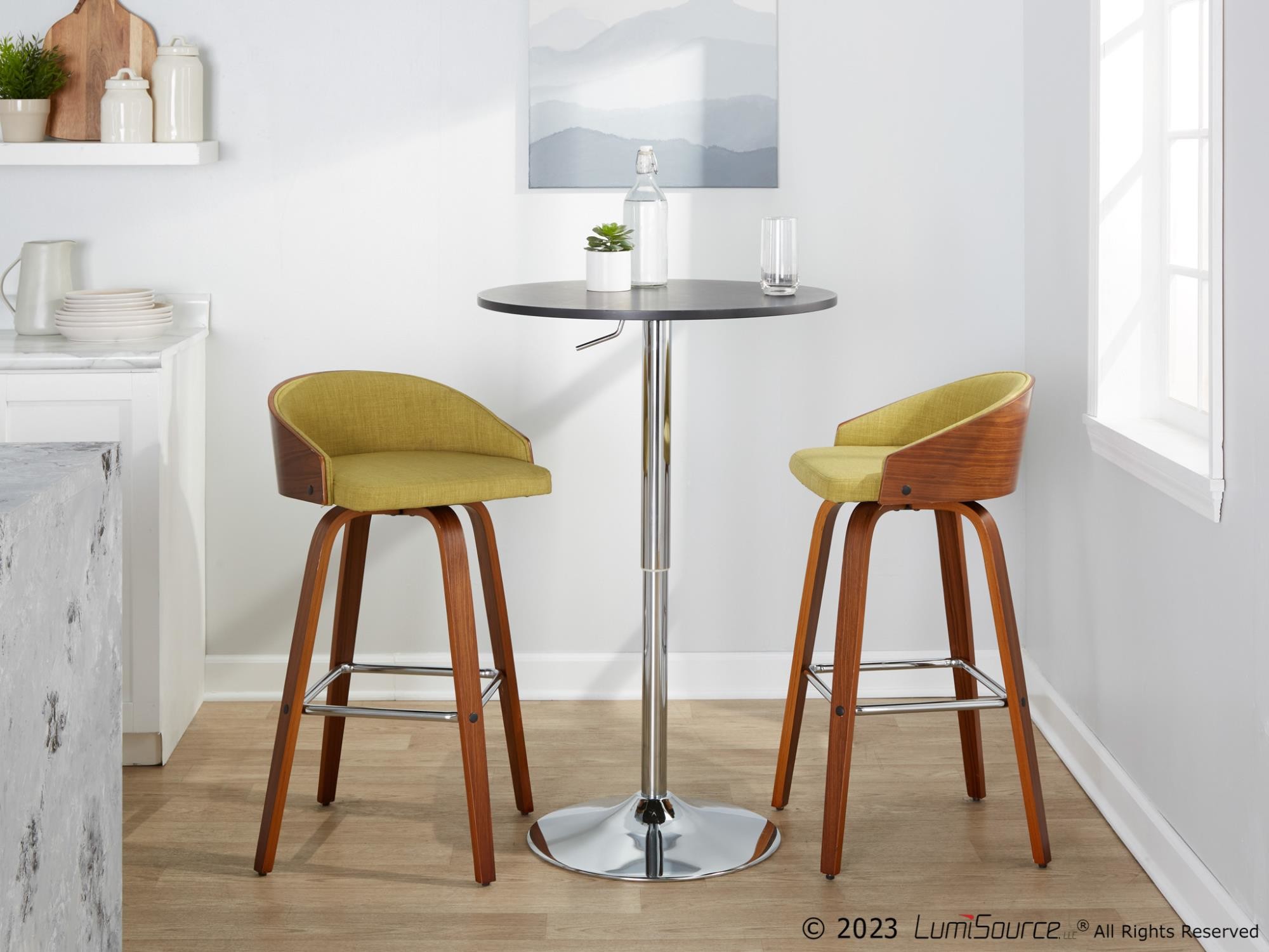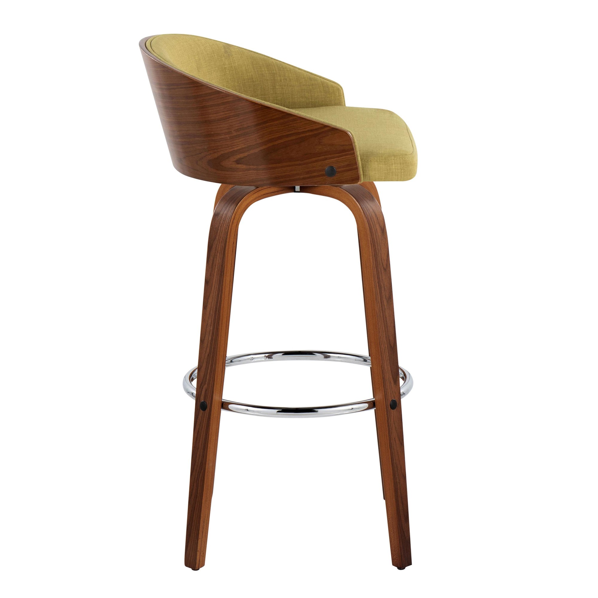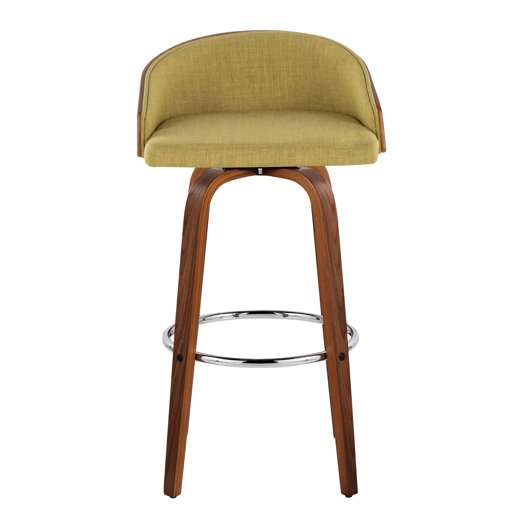 The Shiraz 30-Inch Mid-Century Green Swivel Barstools are designed to introduce a dynamic twist to your space. These barstools combine stylish woven fabric upholstery with walnut-finished bent wood, creating a mid-century modern aesthetic. The swivel seat and built-in footrest offer both style and functionality, making these stools a perfect addition to any bar or counter area. Sold in pairs.