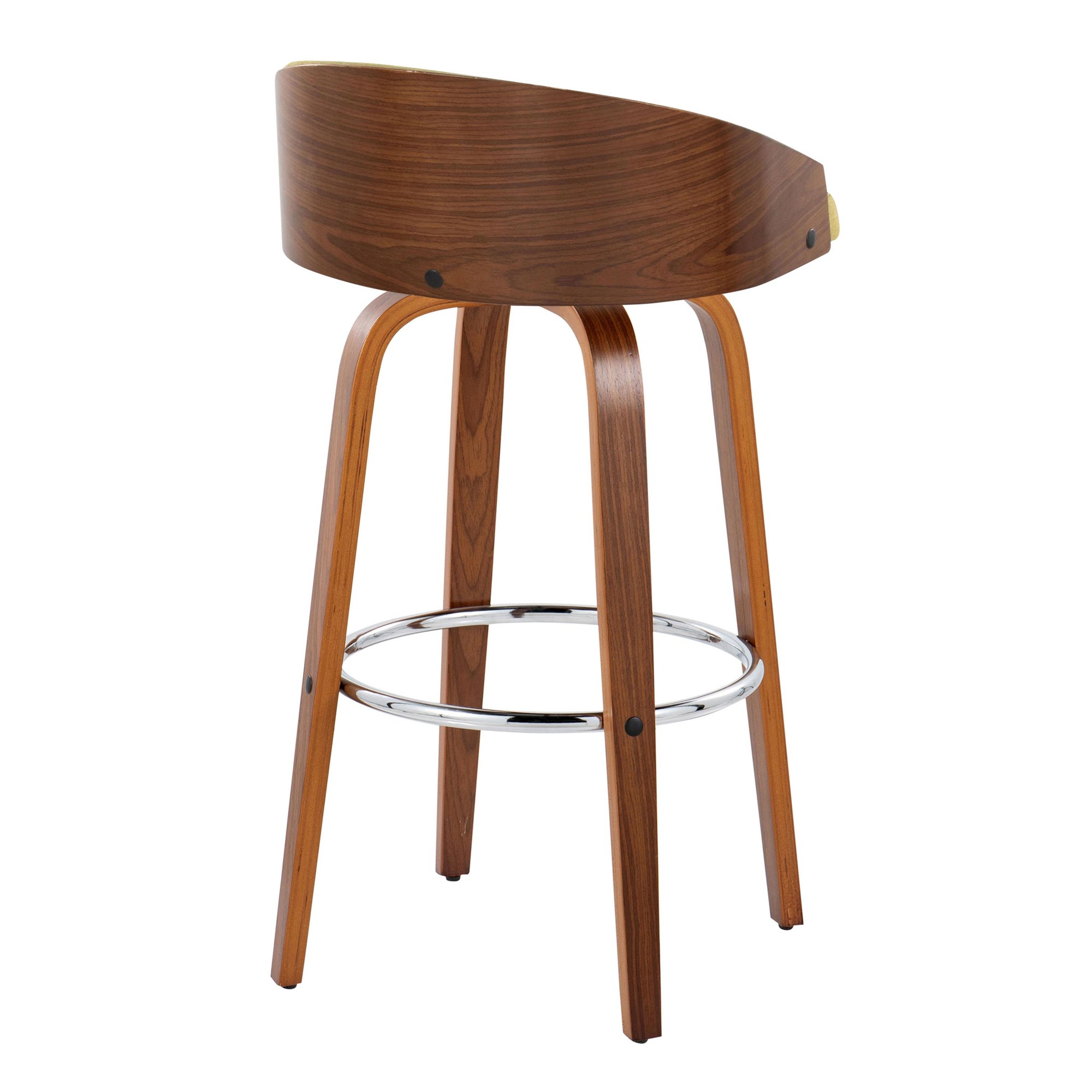Enjoy the comfort and convenience of these stylish barstools. The woven fabric upholstery provides a comfortable seating surface, while the walnut-finished bent wood legs add a touch of elegance. The square chrome metal footrest offers additional support and comfort. The 360-degree swivel function allows for easy movement and conversation.