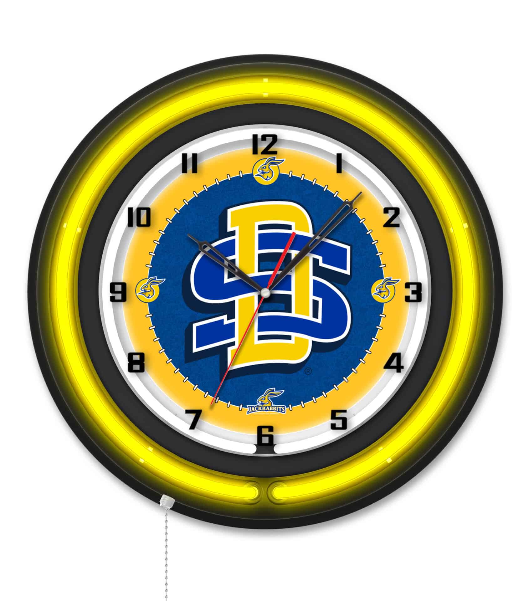 The South Dakota State University 19-Inch Neon Logo Clock in Black is the perfect addition to your man cave, showcasing your school pride with its vibrant neon accents. This clock features a striking black casing with a team color specific neon outer ring, illuminating the custom printed clock face with a brilliant white inner neon ring. The neon rings can be easily activated or deactivated using a pull chain located at the bottom, and the clock is powered by a UL Listed transformer for standard 120V outlets. With accurate quartz movement and powered by a single AA battery (not included), this clock is not just a stylish decor piece but also a reliable timekeeper. Ideal as a gift for graduates, sports enthusiasts, or for personal use, this clock combines functionality with fanfare.