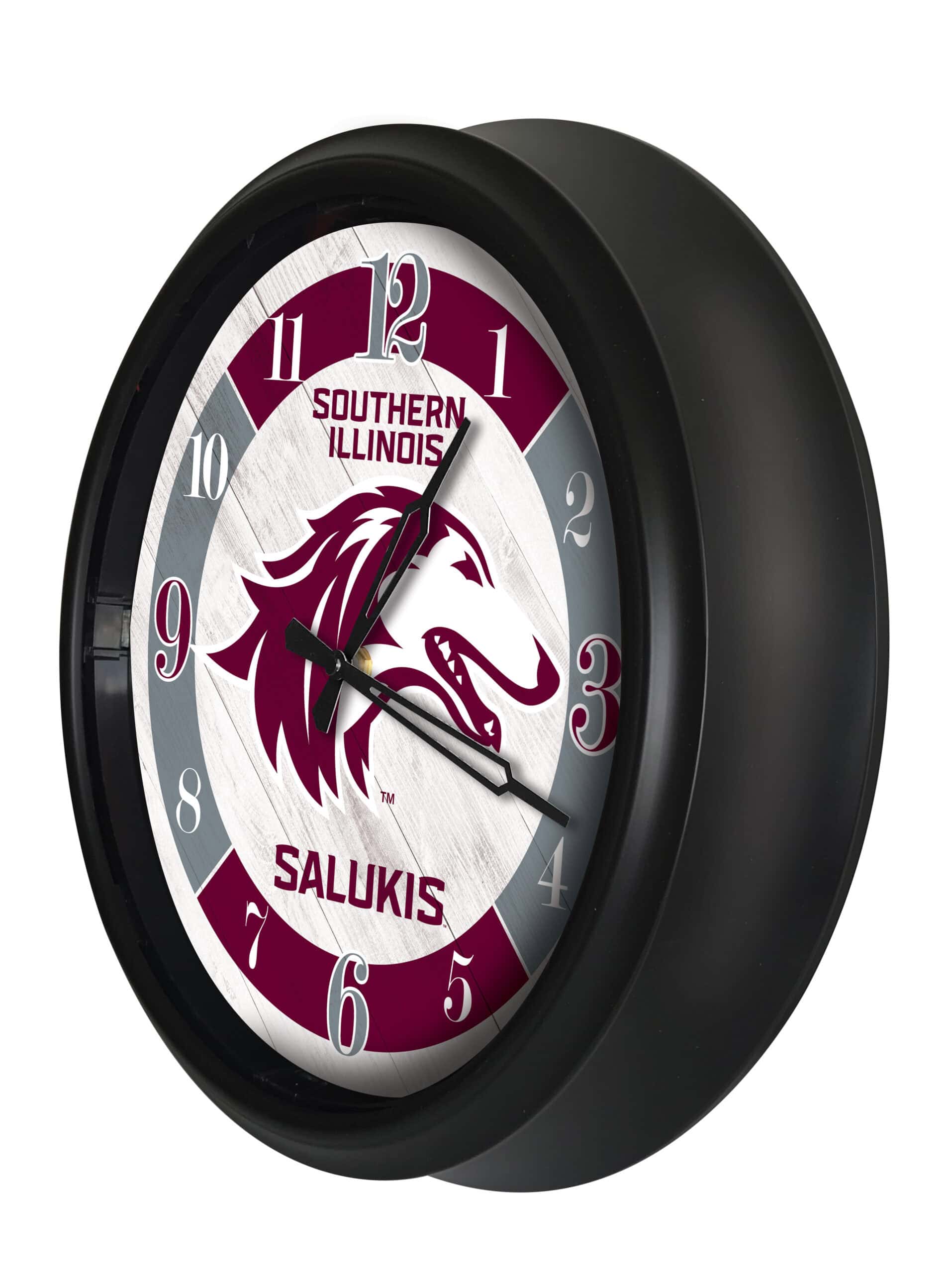 The Southern Illinois University 14-Inch Indoor/Outdoor LED Wall Clock in Black is the perfect addition to any man cave, showcasing your school pride while providing functionality. With a robust design made for both indoor and outdoor use, this clock features a UV resistant black ABS plastic casing and a glass face lens with a rubber gasket, ensuring durability against the elements. The clock is equipped with four LED lights that automatically illuminate the clock face when it gets dark, powered by four D batteries (not included). The artwork is digitally printed with UV inks for vibrant colors that resist fading over time. An accurate quartz movement ensures precise timekeeping, powered by a single AA battery (not included). This clock makes an excellent gift for graduates or sports fans, or a stylish addition to your own collection.