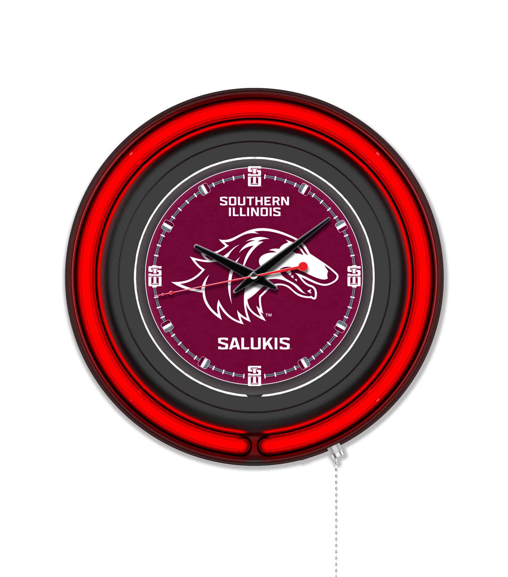 The Southern Illinois University 15-Inch Neon Logo Clock in Black is the ideal addition to your man cave, showcasing your school pride with vibrant colors and stylish design. This clock features a striking black casing and a neon outer ring that highlights a custom printed clock face illuminated by a brilliant white inner neon ring. Designed for easy operation, the neon rings can be turned on and off with a convenient pull chain. With accurate quartz movement powered by a single AA battery, this clock ensures you’ll always be on time. Perfect as a gift for graduates, sports enthusiasts, or as a personal treat, this clock stands out as a centerpiece in any space.