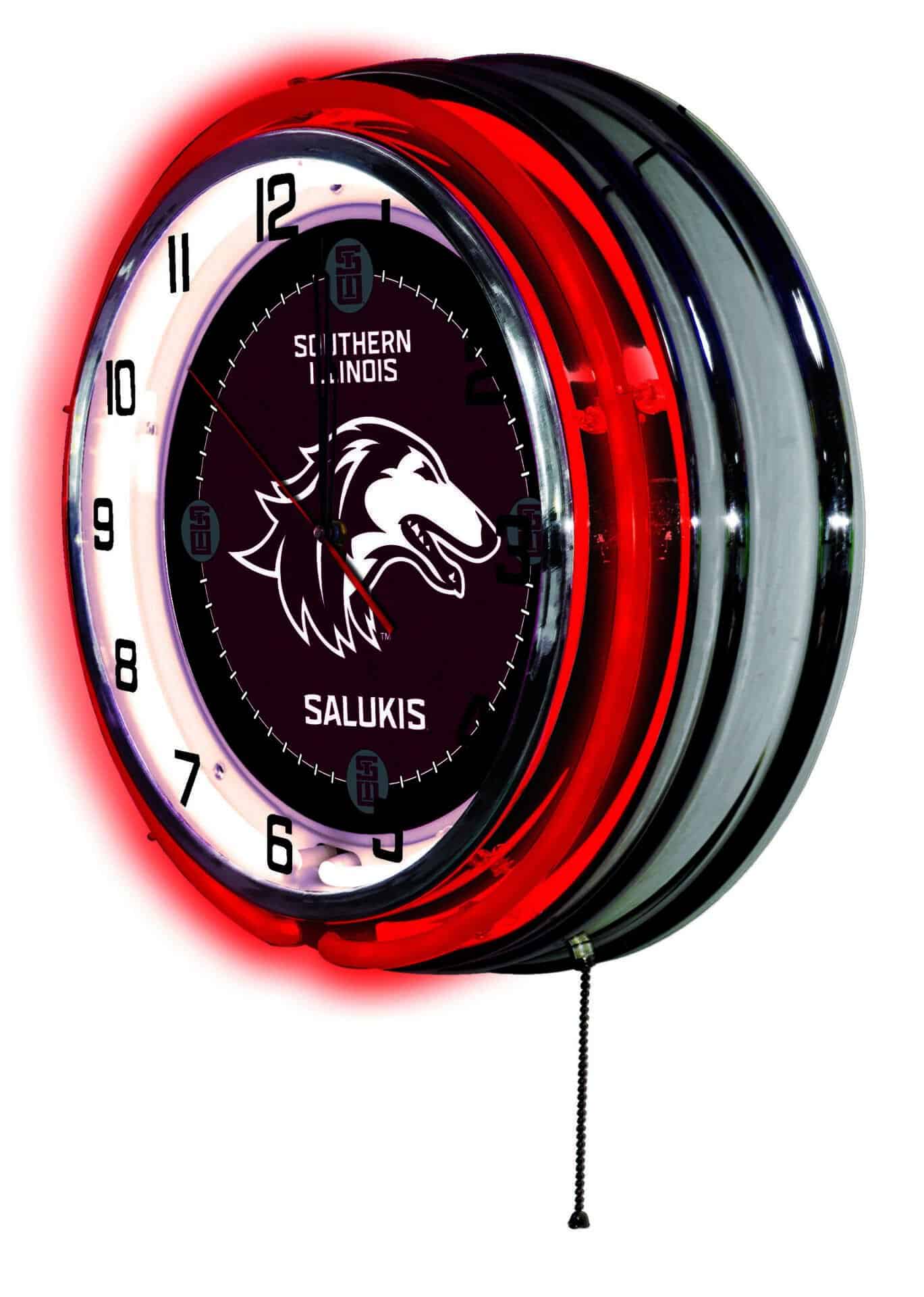 The Southern Illinois University 19-Inch Neon Logo Clock in Chrome is an eye-catching piece of decor that showcases your school pride. With its vibrant neon accents and sleek chrome casing, this clock not only tells time but also adds a striking visual element to any room. The custom printed clock face is illuminated by a brilliant white inner neon ring, making it a stunning addition to your man cave or any space. The neon rings can be easily turned on and off with a convenient pull chain, and the clock is powered by a UL Listed transformer for standard 120V outlets. Accurate quartz movement ensures you’re always on time, powered by a single AA battery (not included).