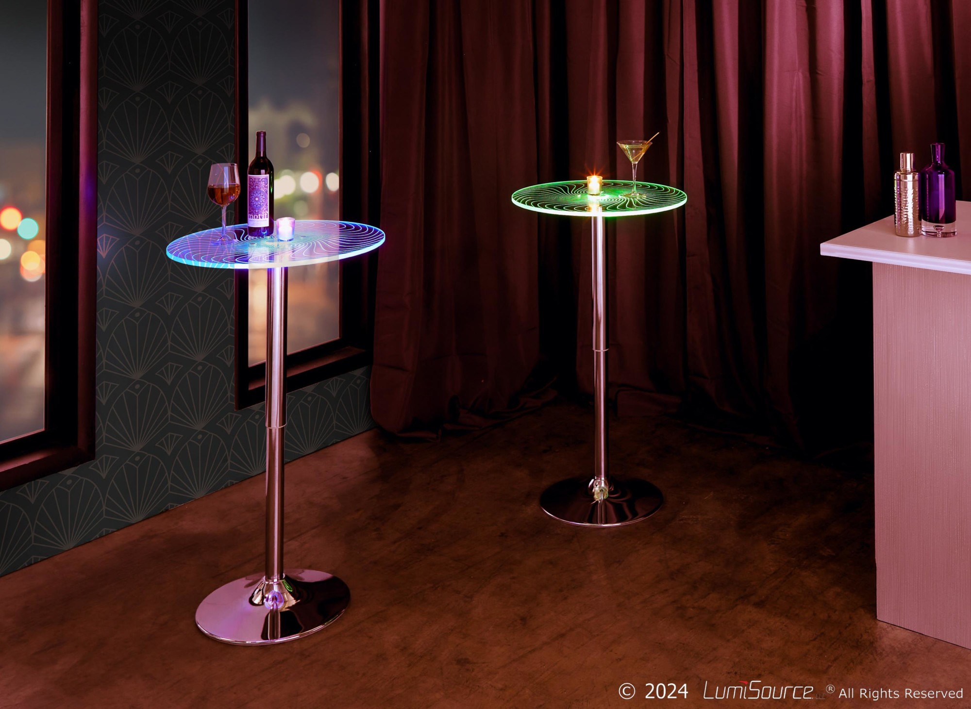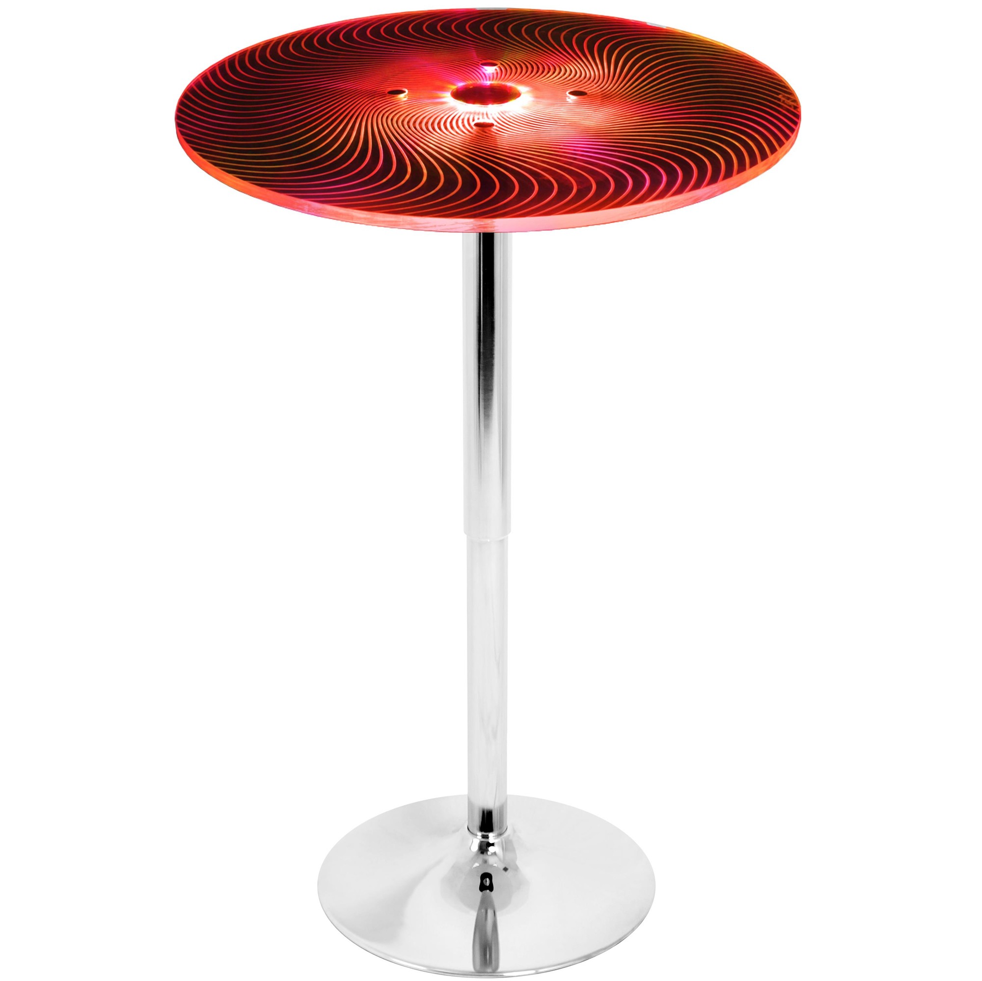 The Spyra Bar Table brings a burst of color and contemporary style to any gathering! Featuring a clear acrylic top with etched swirl details, this table transforms into a mesmerizing light show with its multi-colored LEDs. The adjustable height and sleek chrome base make it a perfect addition to your man cave or entertainment space. Get ready to light up your night!