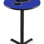 This 42-inch pub table with a 36-inch top is designed to elevate your bar, game room, or man cave with a touch of class and exceptional functionality. Featuring a sublimated, full-color, scratch-resistant laminate top, it ensures vibrant and lasting design that resists wear and tear. The commercial-quality base, constructed with cast iron and steel, is finished with a sleek black wrinkle powder coating for durability and style. With adjustable feet to accommodate various floor surfaces and easy assembly, this pub table is a practical and stylish choice for any space.