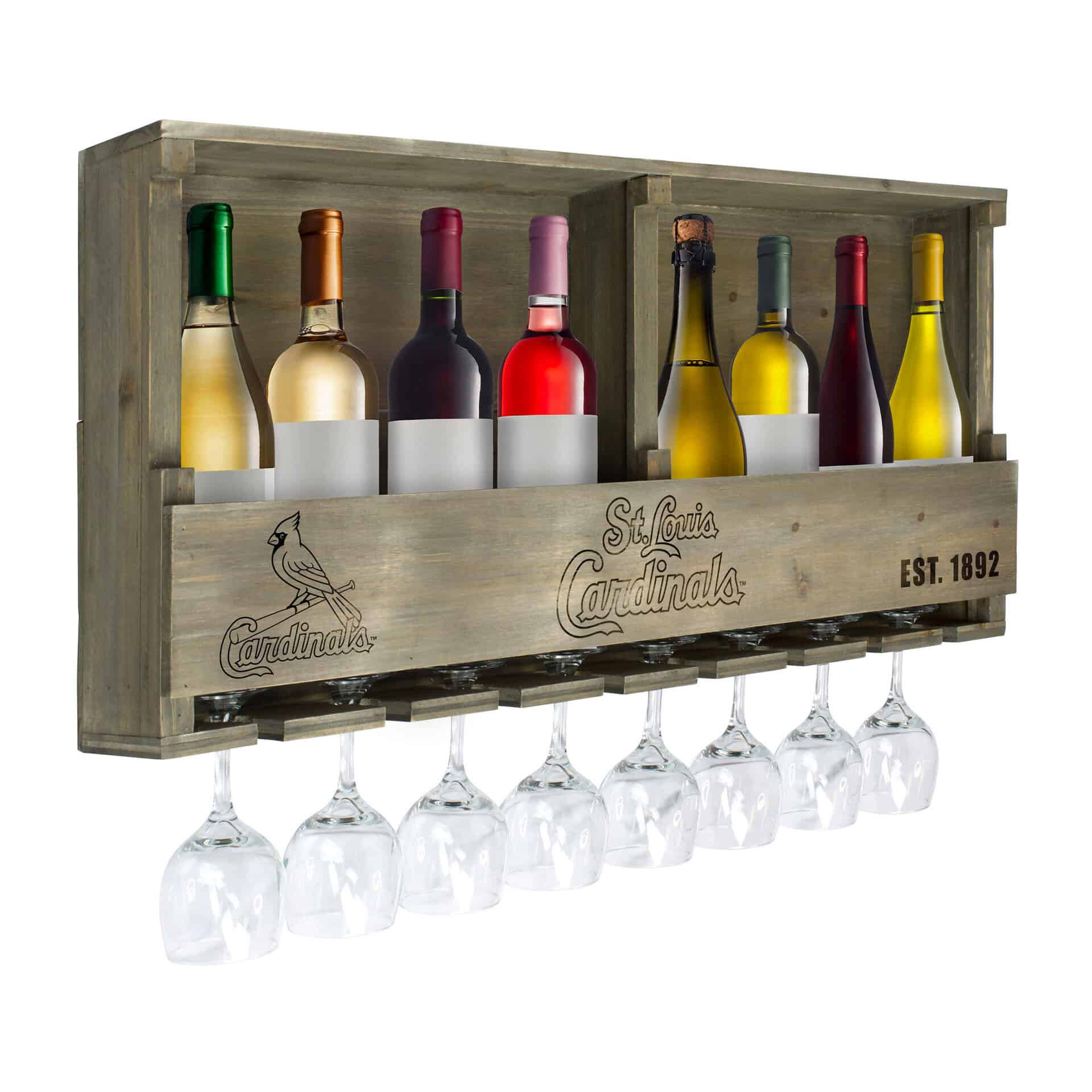 This reclaimed wood bar shelf is a fantastic way to show off your team pride! It holds up to 8 bottles and 8 stemmed glasses, so you can easily display your favorite beverages. The vintage, reclaimed look will fit perfectly in any room where you gather with friends and family. This shelf is lightweight, easy to hang, and makes a great gift for the ultimate fan!
