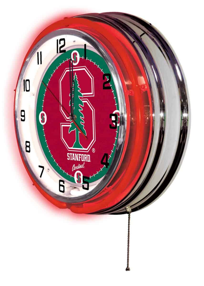 The “Stanford University 19-Inch Neon Logo Clock in Chrome is the ultimate addition to any man cave, showcasing your school pride in style. This clock features a stunning chrome casing and a vibrant neon outer ring that complements the custom printed clock face, illuminated by a brilliant white inner neon ring. With easy on/off functionality via a pull chain, this clock is not only visually appealing but also practical. The accurate quartz movement ensures you always have the correct time, powered by a single AA battery (not included). Perfect as a gift for graduates, sports enthusiasts, or for personal use, this clock is a proud emblem of school spirit.