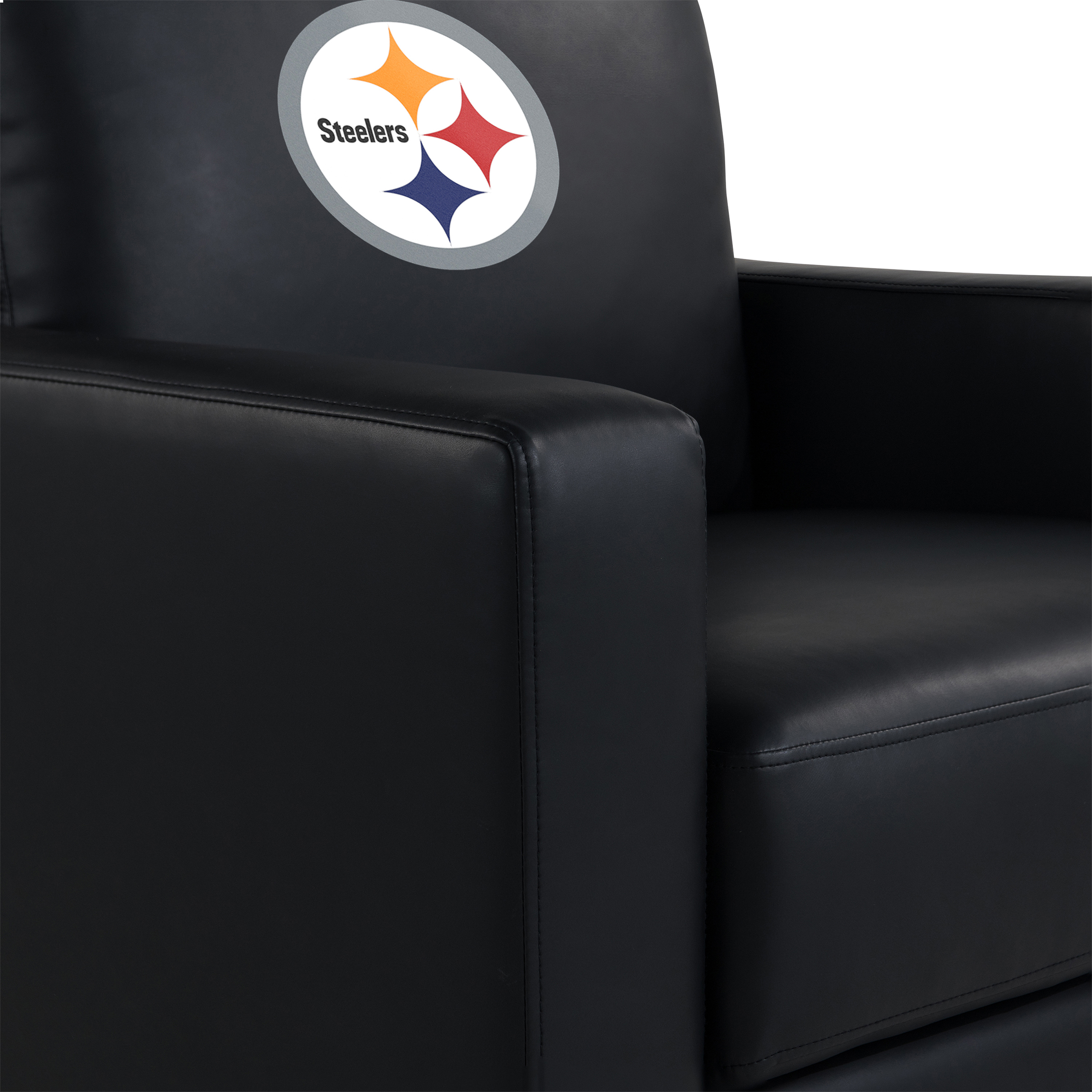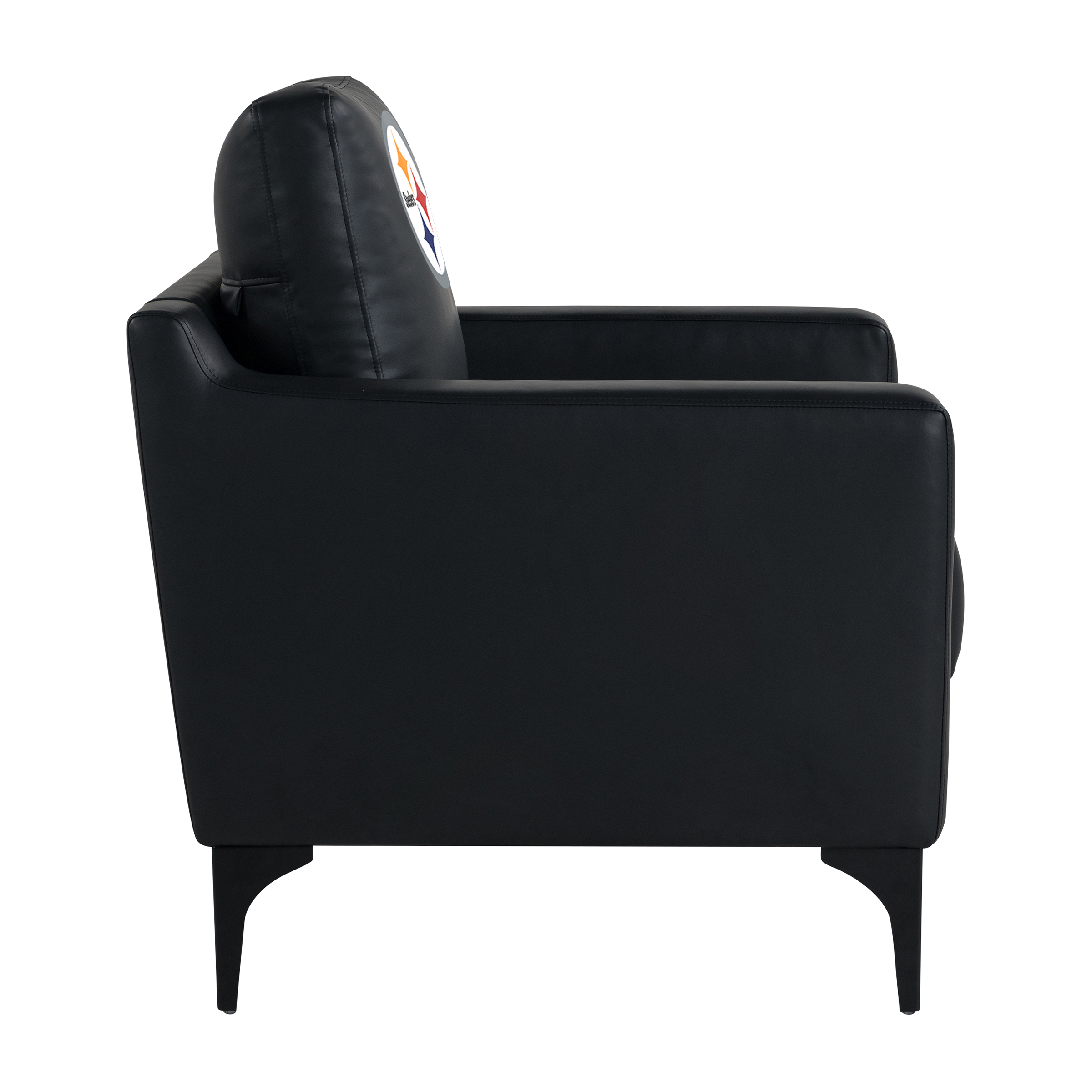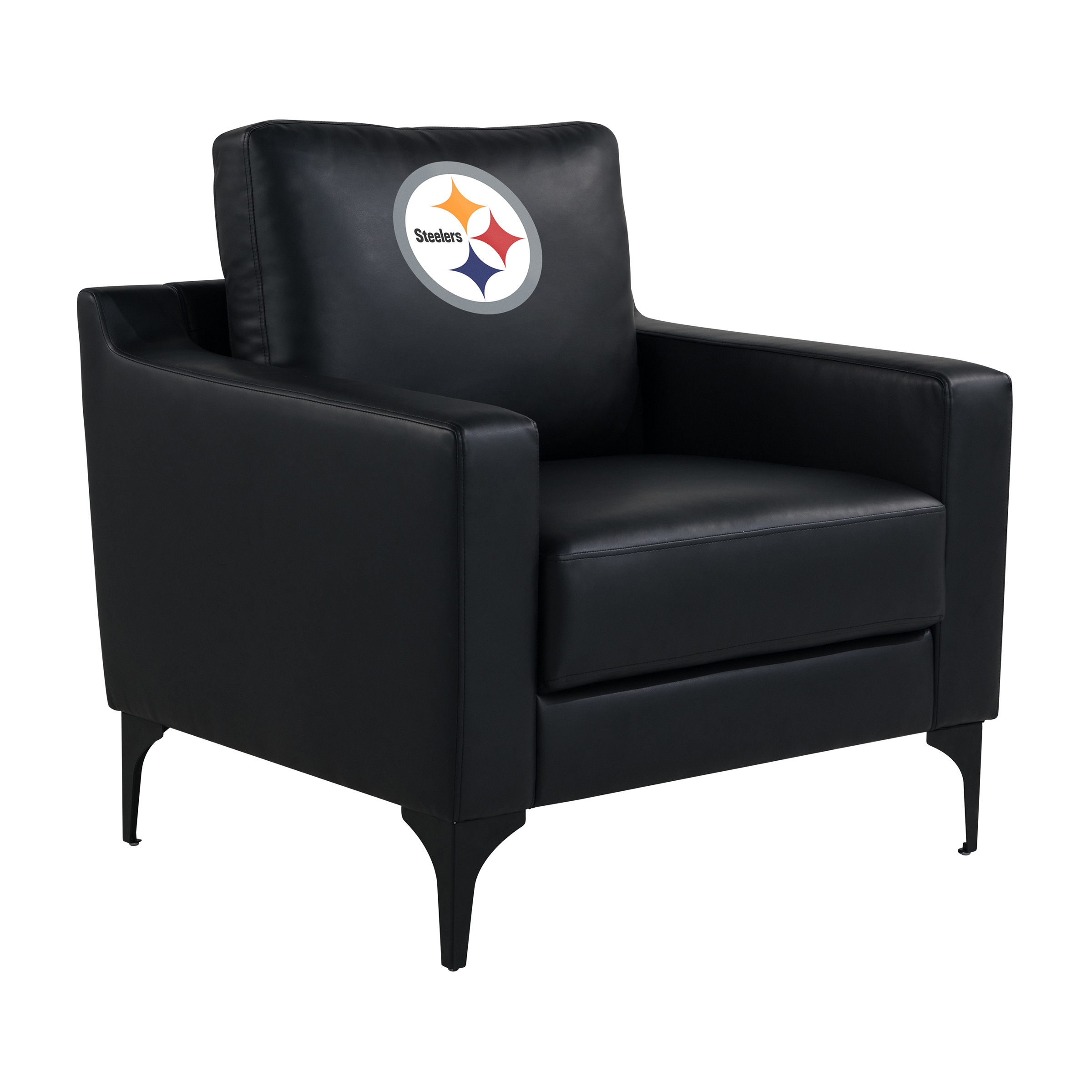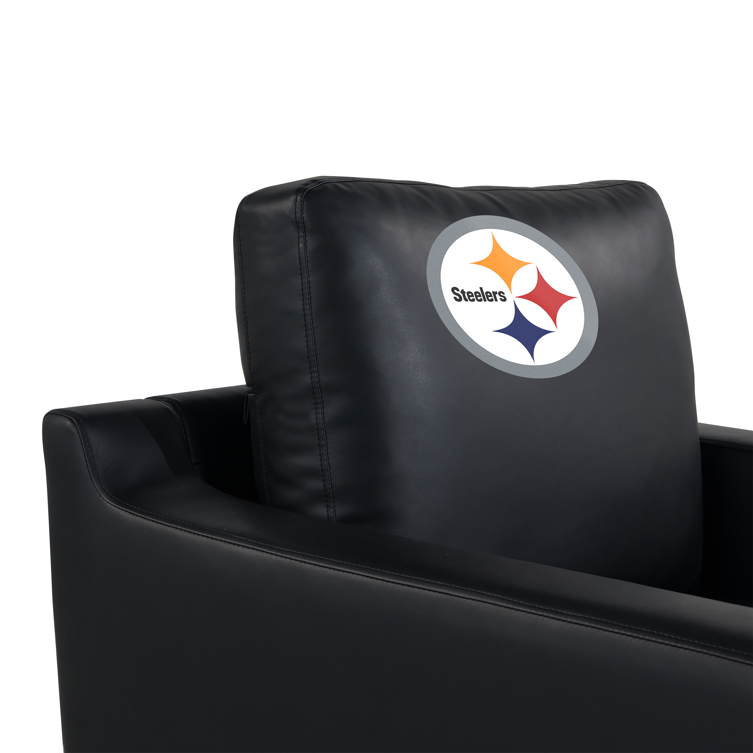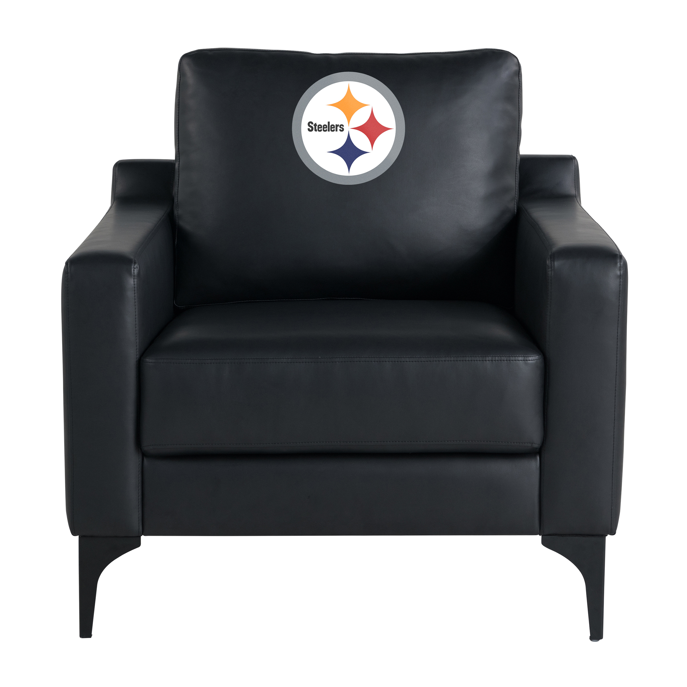 Add team pride to your space with the Steelers Embroidered Faux Leather Game Day Chair! This comfortable and durable chair is great for your gameroom, office, or living room. It features a embroidered logo on high quality faux leather fabric. You get two back cushion covers: one with the logo for game day and one without for everyday use. Enjoy the high density foam and pocket coil seating. The chair has a wood framed base and ships UPS, so it’s easy to assemble. Dimensions (LxWxH): 34.5 x 33.5 x 35 inches. Product Weight: 72 lbs. Material: Wood, Polyester.