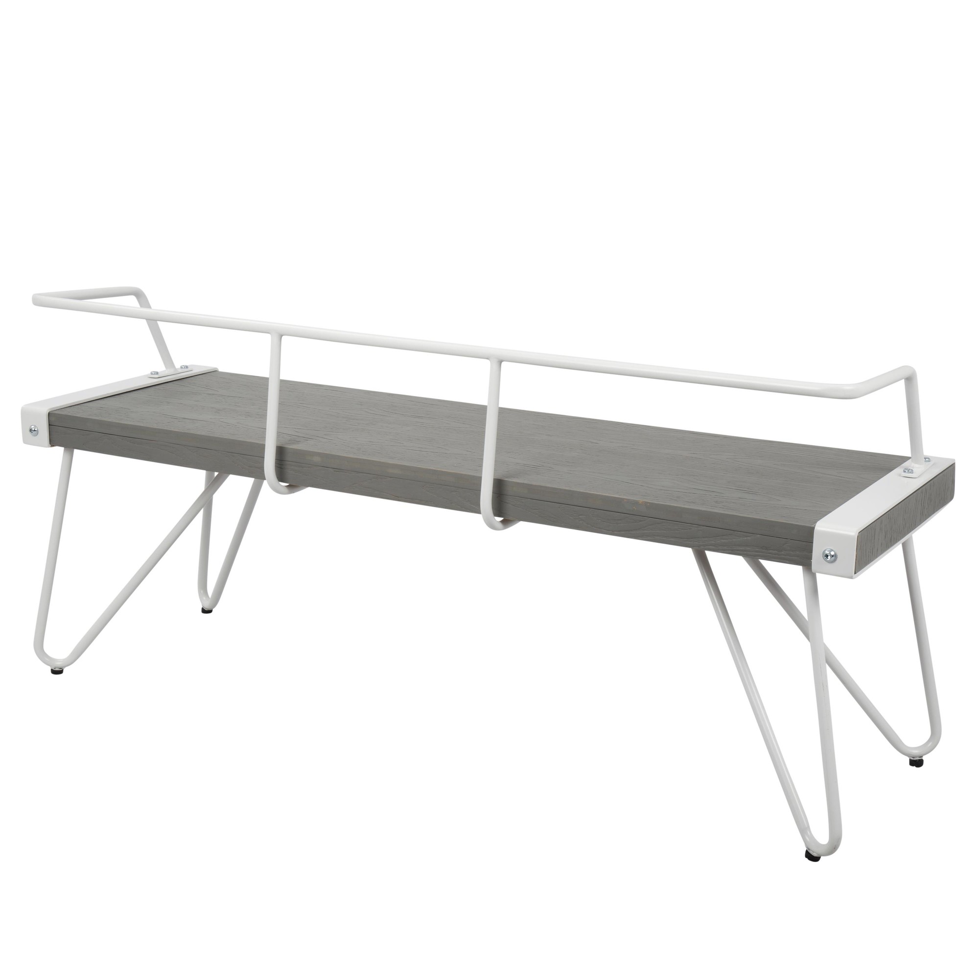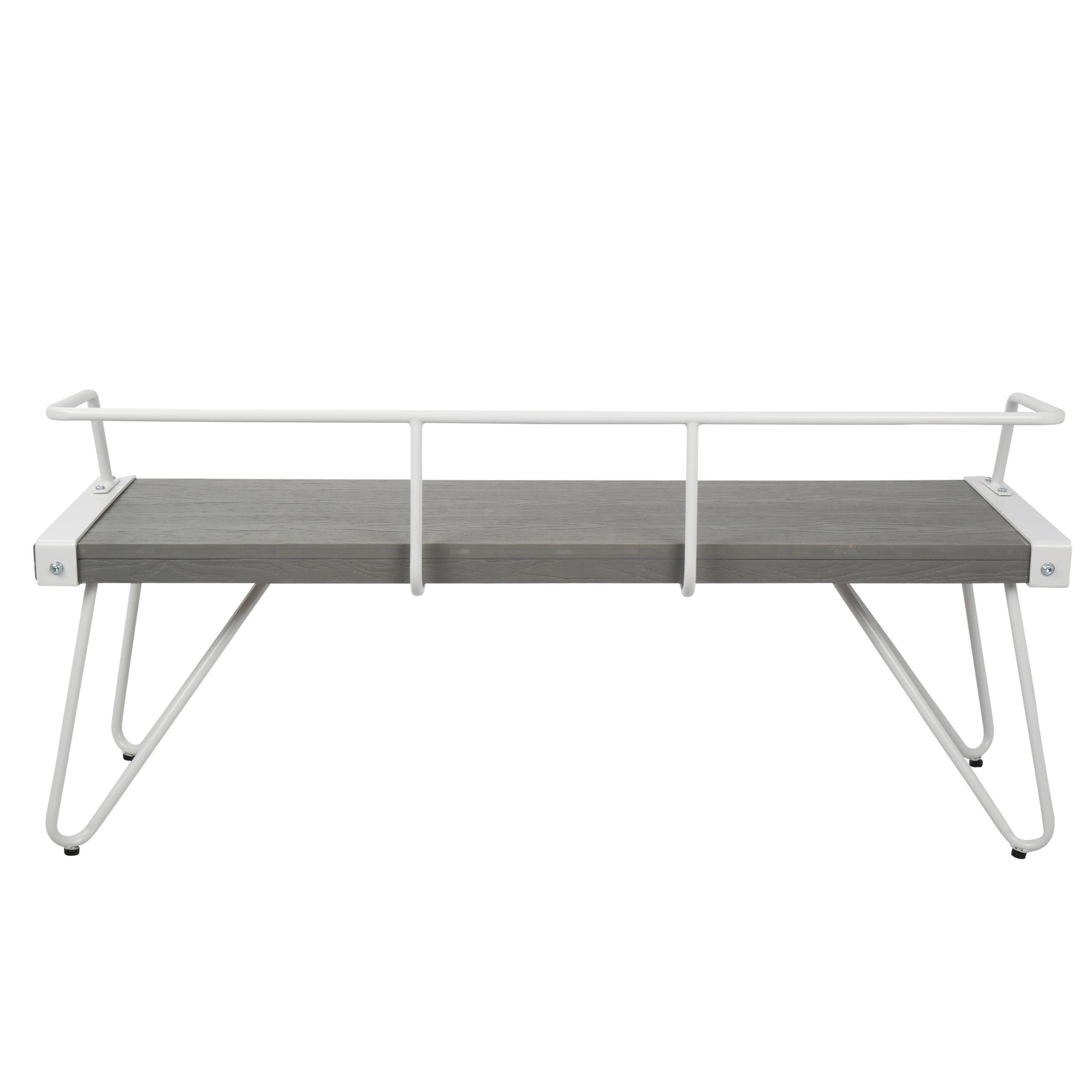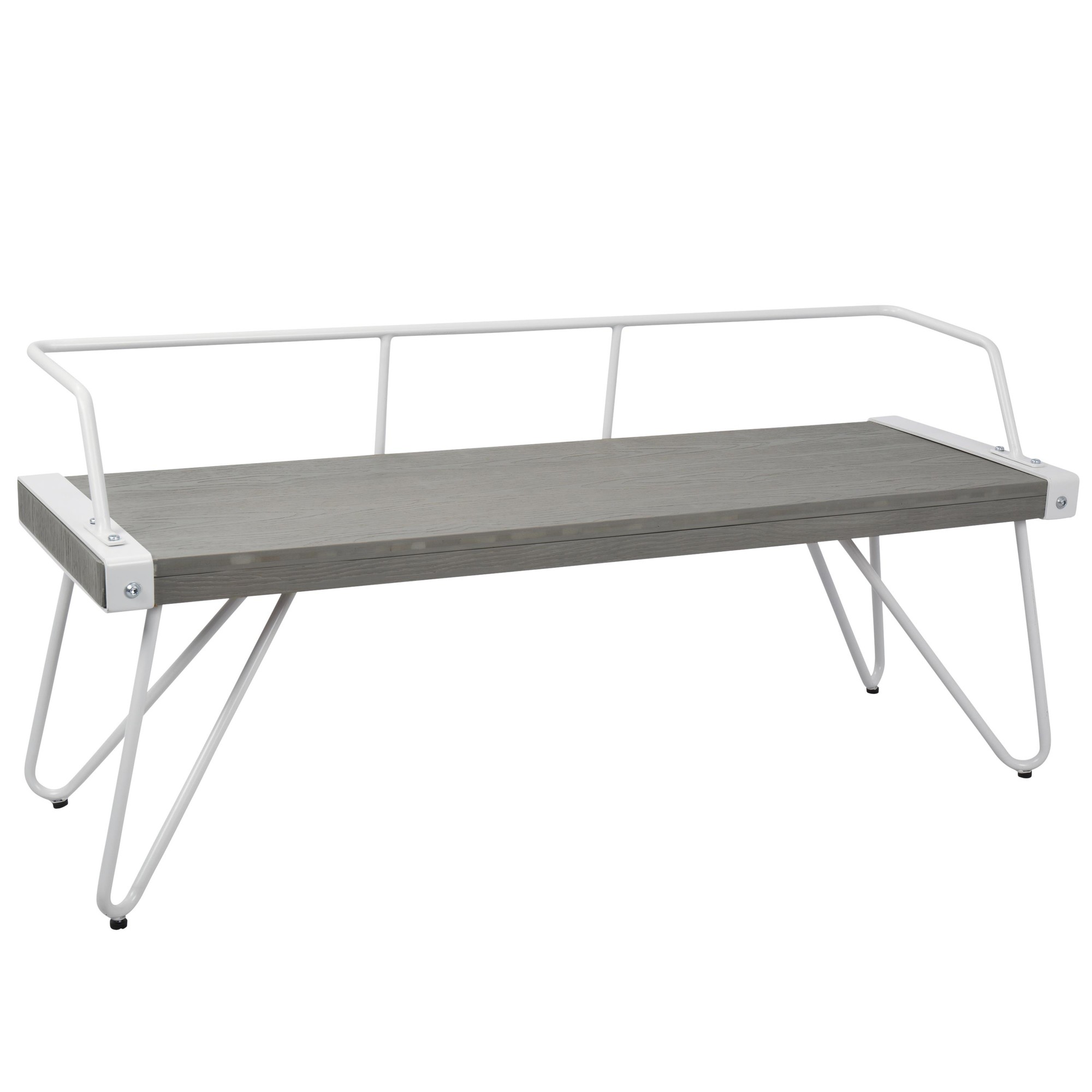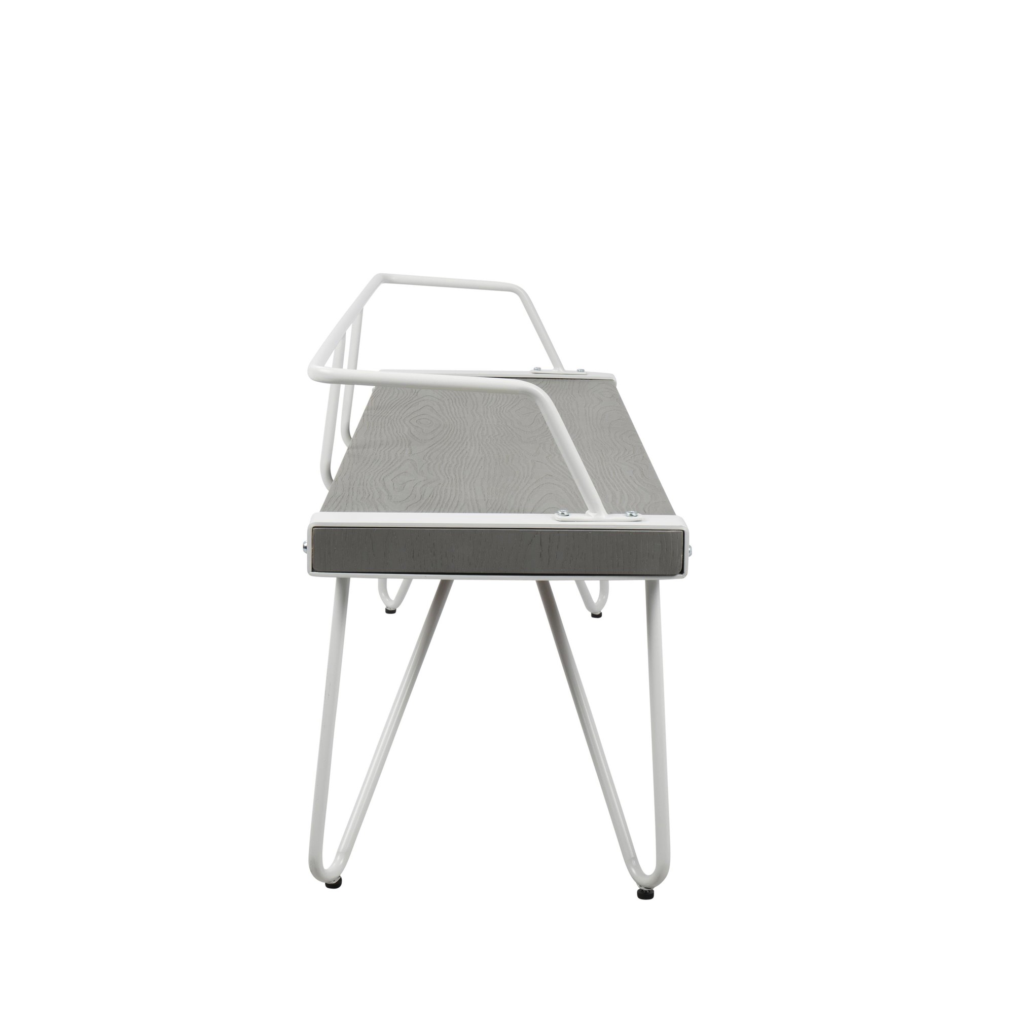 The distinctive flared hairpin legs add visual interest while providing sturdy support. The grey wood seat offers a comfortable place to sit, complementing the clean white metal frame.