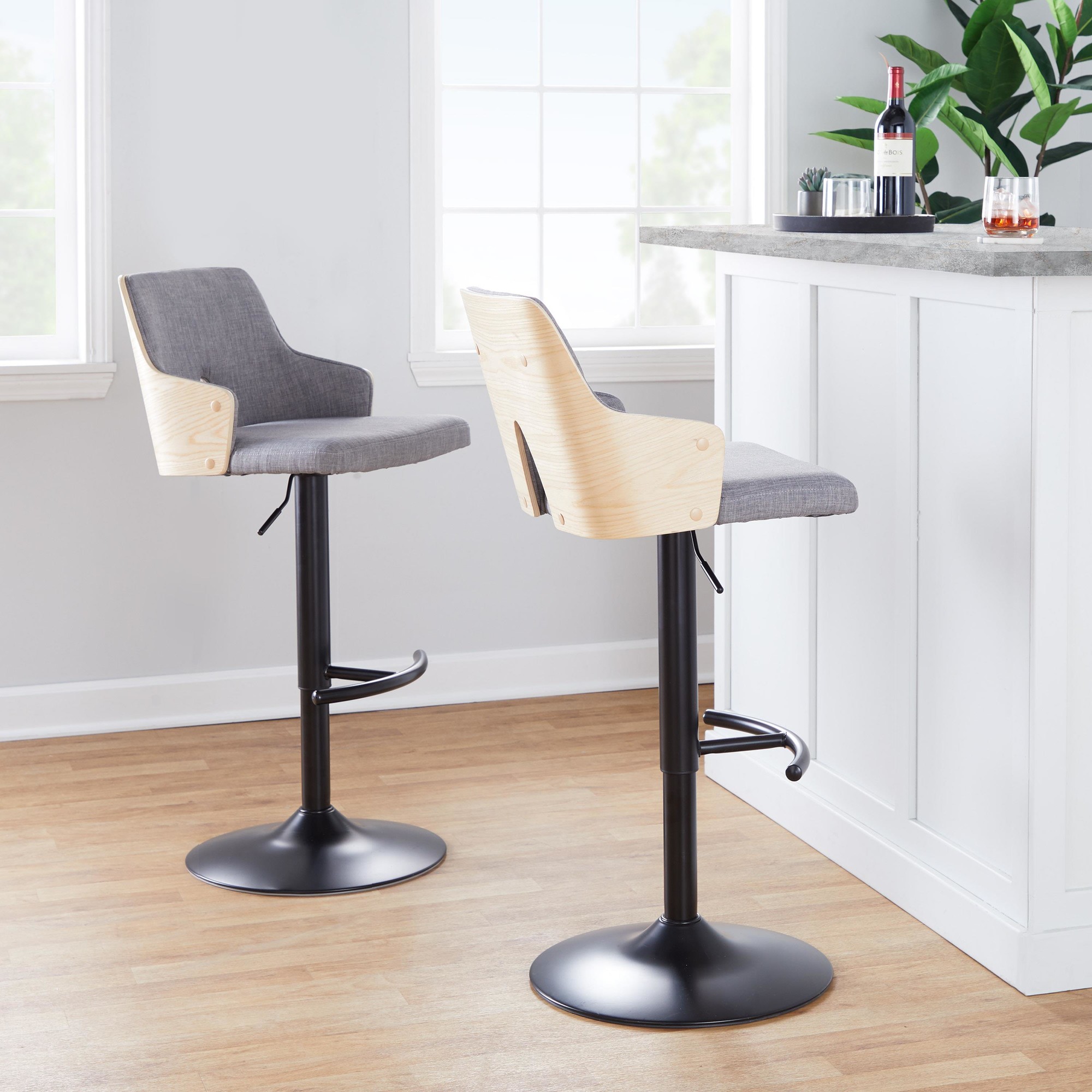 The Stella Light Grey Fabric Contemporary Swivel Barstools offer a playful yet refined design, perfect for elevating your man cave. These barstools feature a stylish fabric upholstery, a unique wood back, and an adjustable metal base, making them a versatile addition to any space.