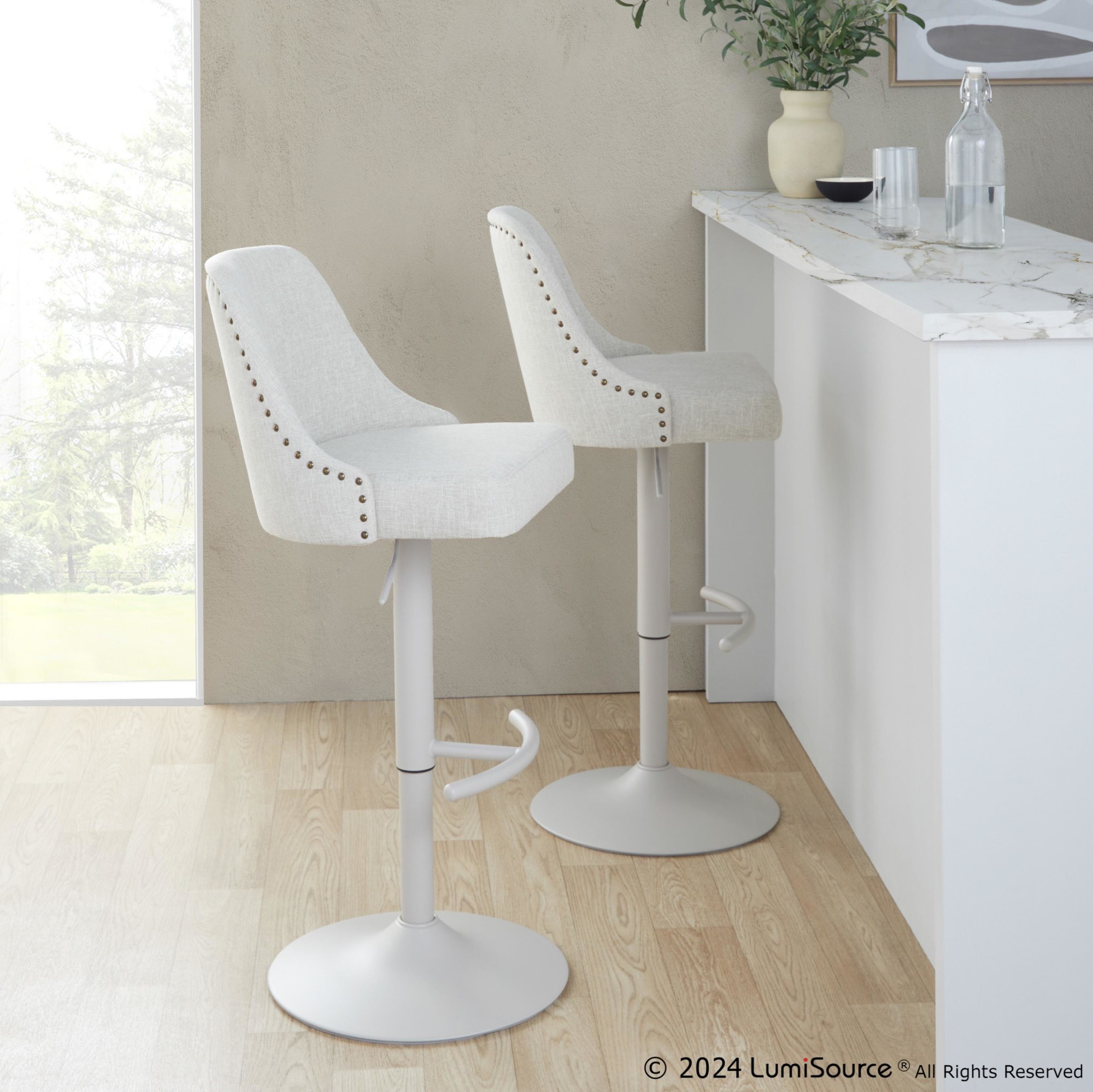 The Studded Marcel Adjustable Barstool is a stunning addition to any space, blending modern style with timeless charm. This stool features a plush, upholstered seat and a backrest accented with decorative studs, bringing a touch of elegance to your home bar or kitchen.