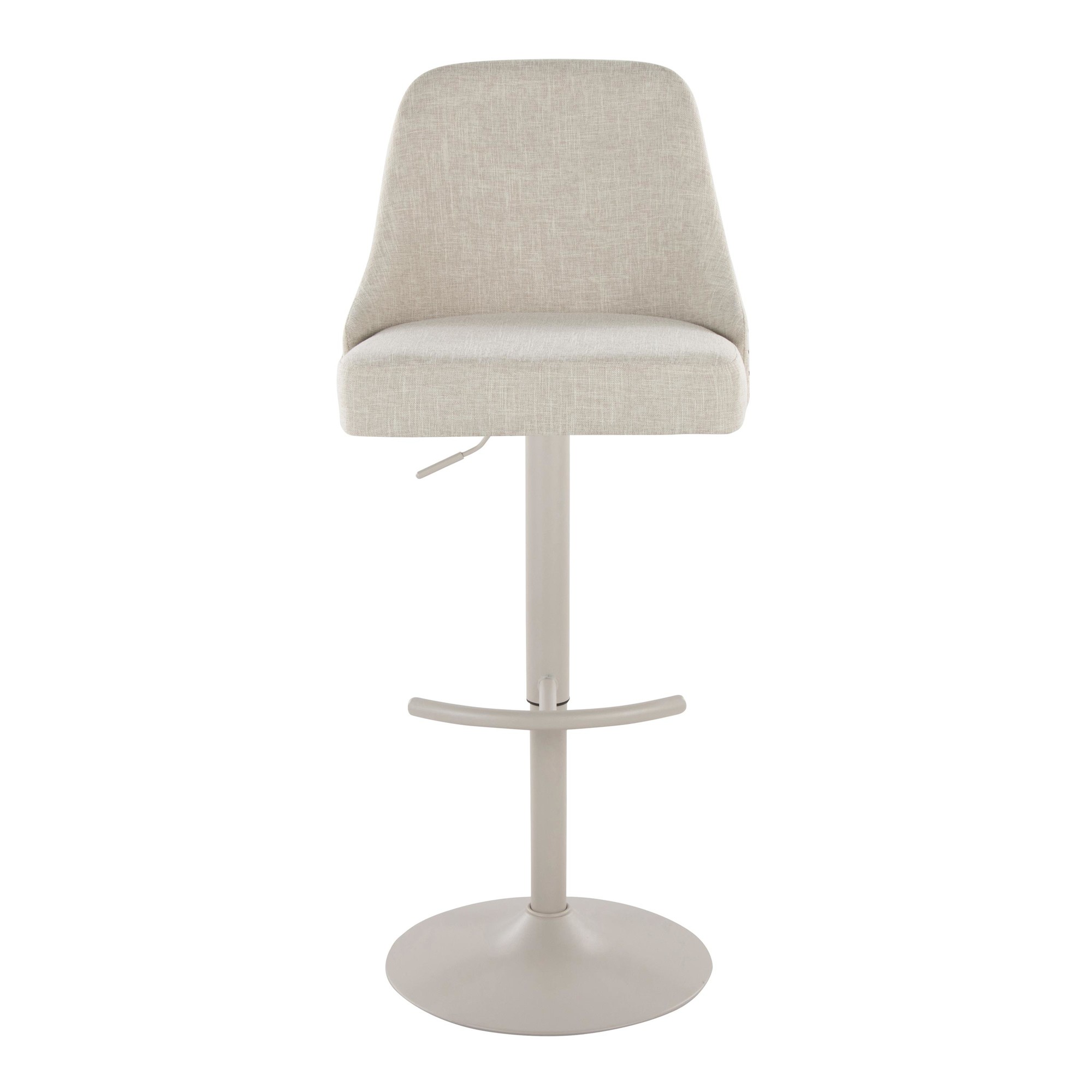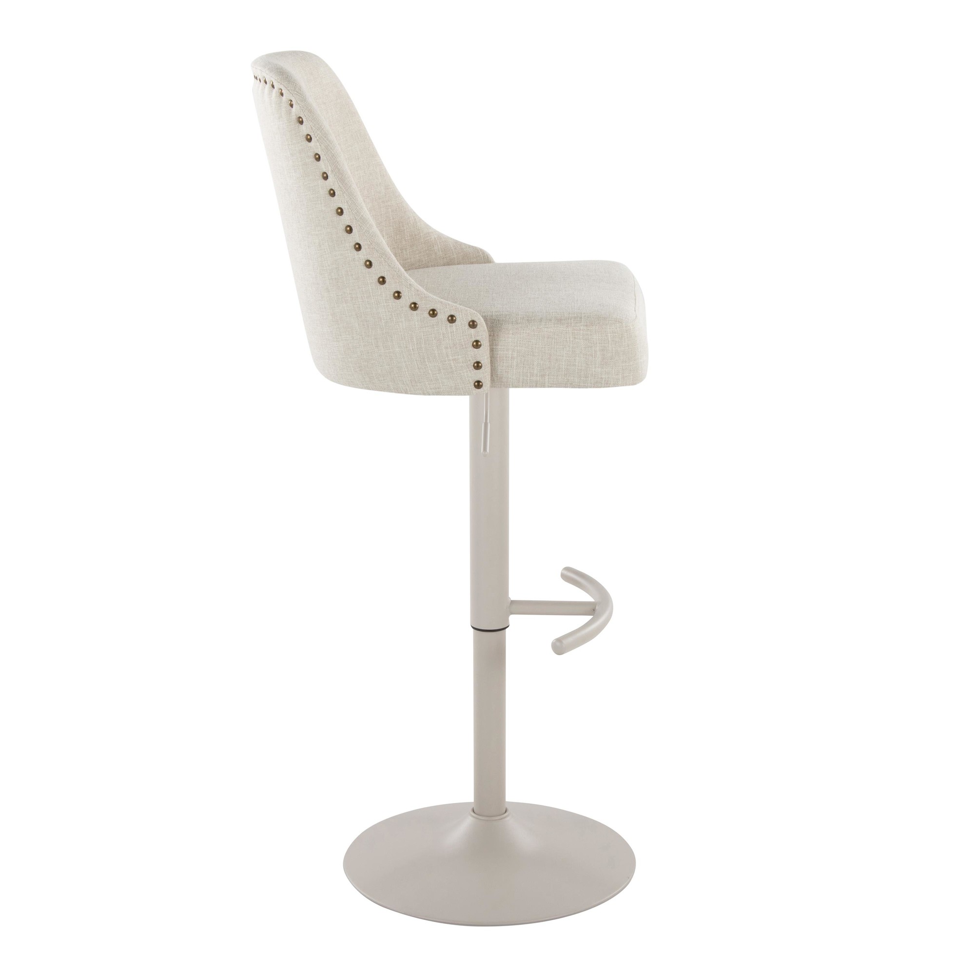 Add a touch of class to your cave with this Studded Marcel Cream Fabric Pearl Grey Contemporary Barstool. This modern stool features a cream fabric upholstered seat and full back, accented with stylish studs. It has an adjustable height with a 360-degree swivel, so you can always find the perfect position. The pearl grey metal base includes a convenient rounded T footrest. This stool is sold in pairs and requires assembly. Enhance your bar area with this comfortable and sophisticated seating option.