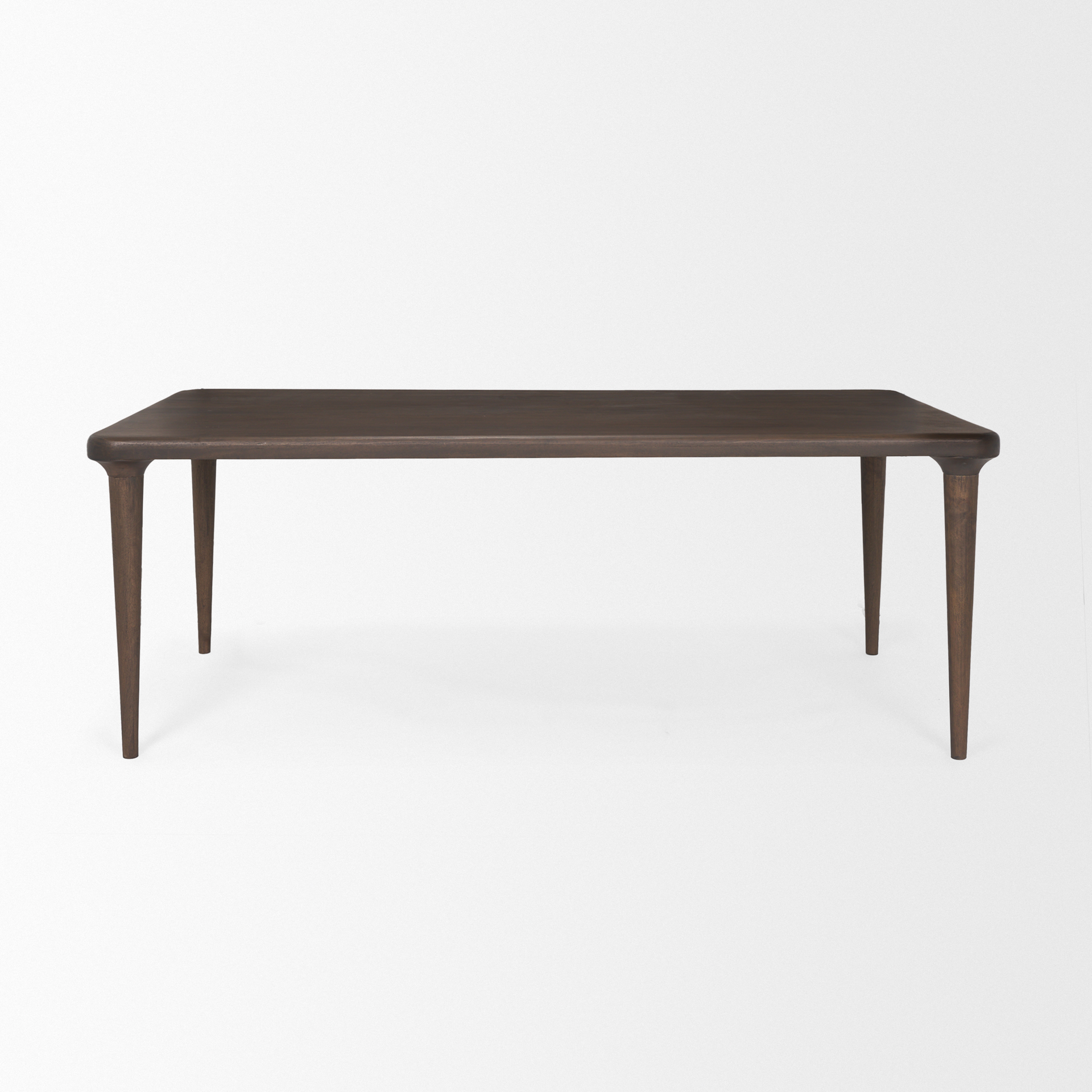 The Suvan Dining Table is a sleek and stylish addition to any dining space. Crafted from solid mango wood with a rich medium-dark brown stain, this rectangular table features slim, tapered legs and rounded edges for a welcoming atmosphere. Its minimalist design encourages a comfortable dining experience.