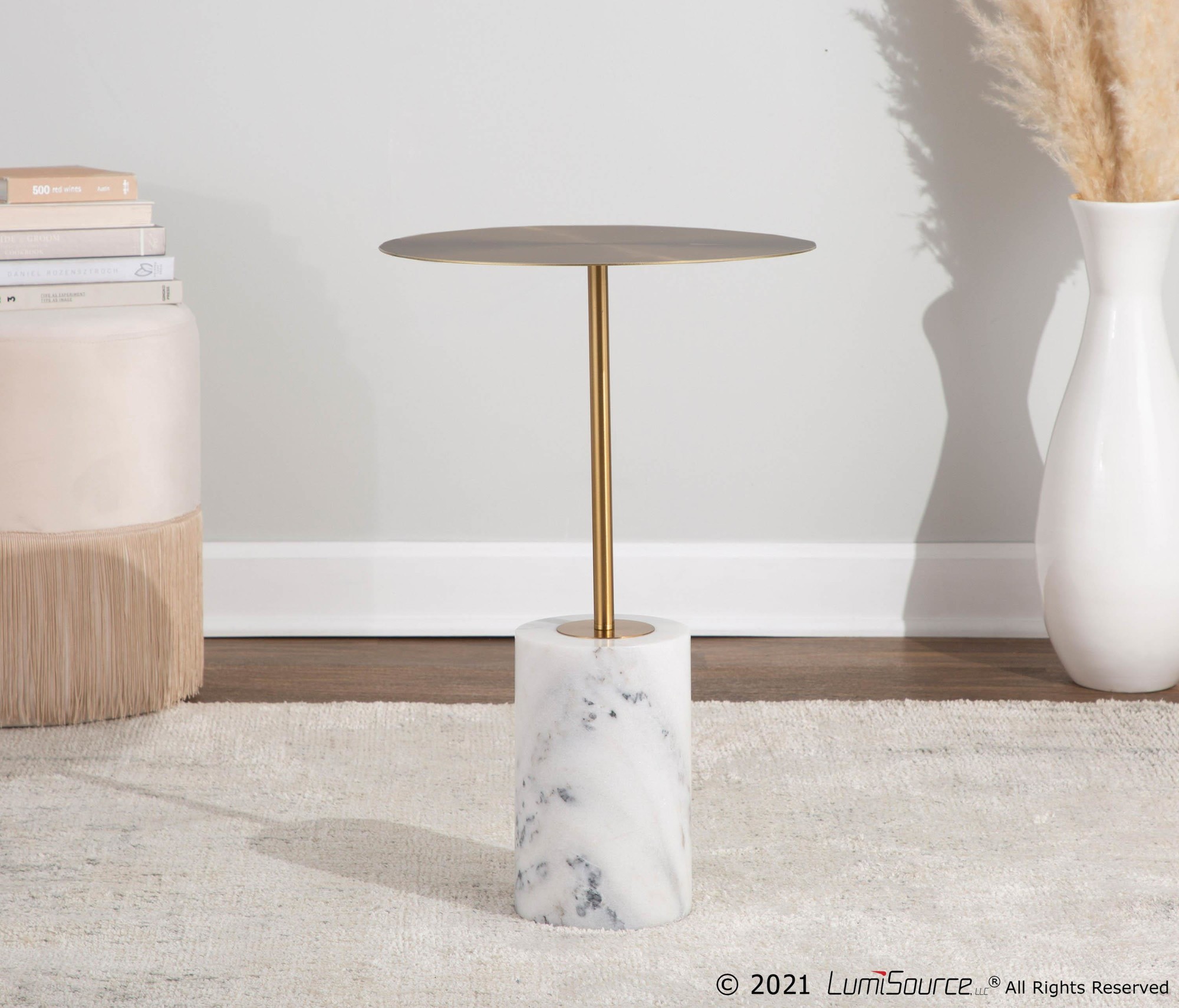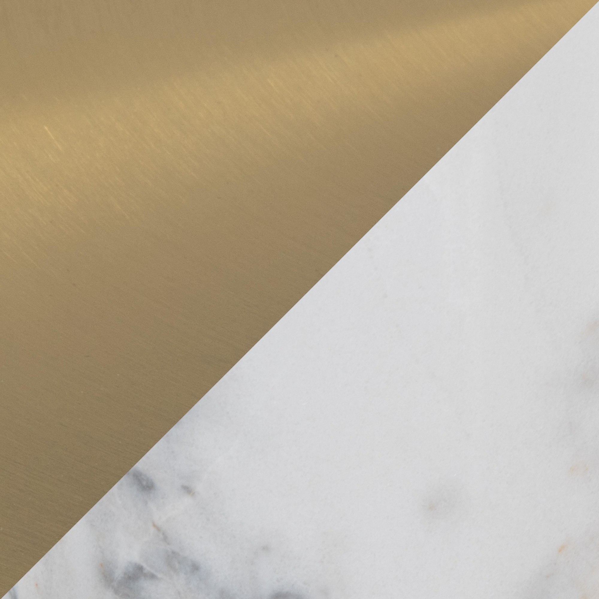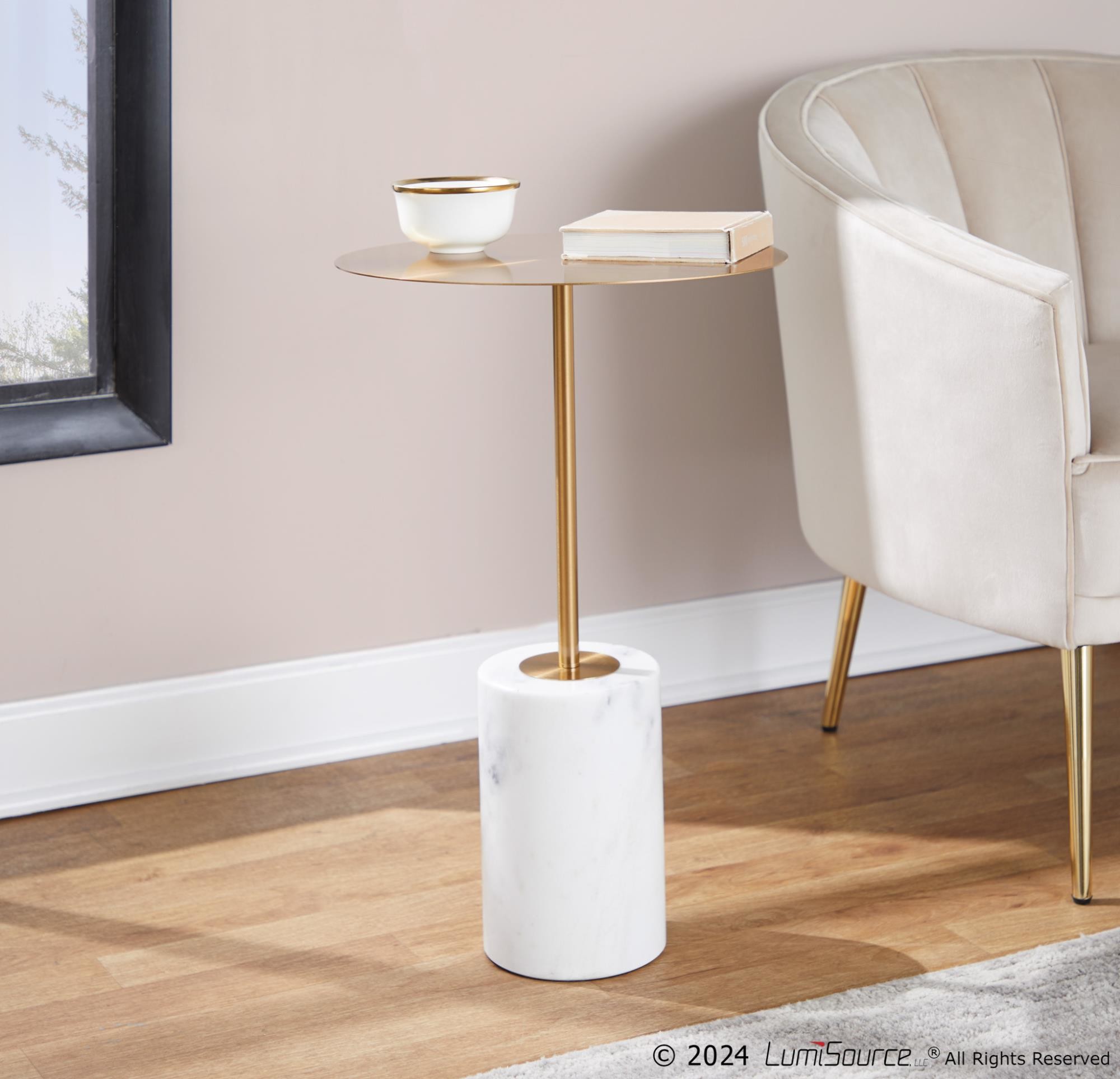 Featuring a gold metal top and a white marble base, this side table complements sofas, accent chairs, and bedrooms. The sleek gold finish and marble base create a sophisticated look.
