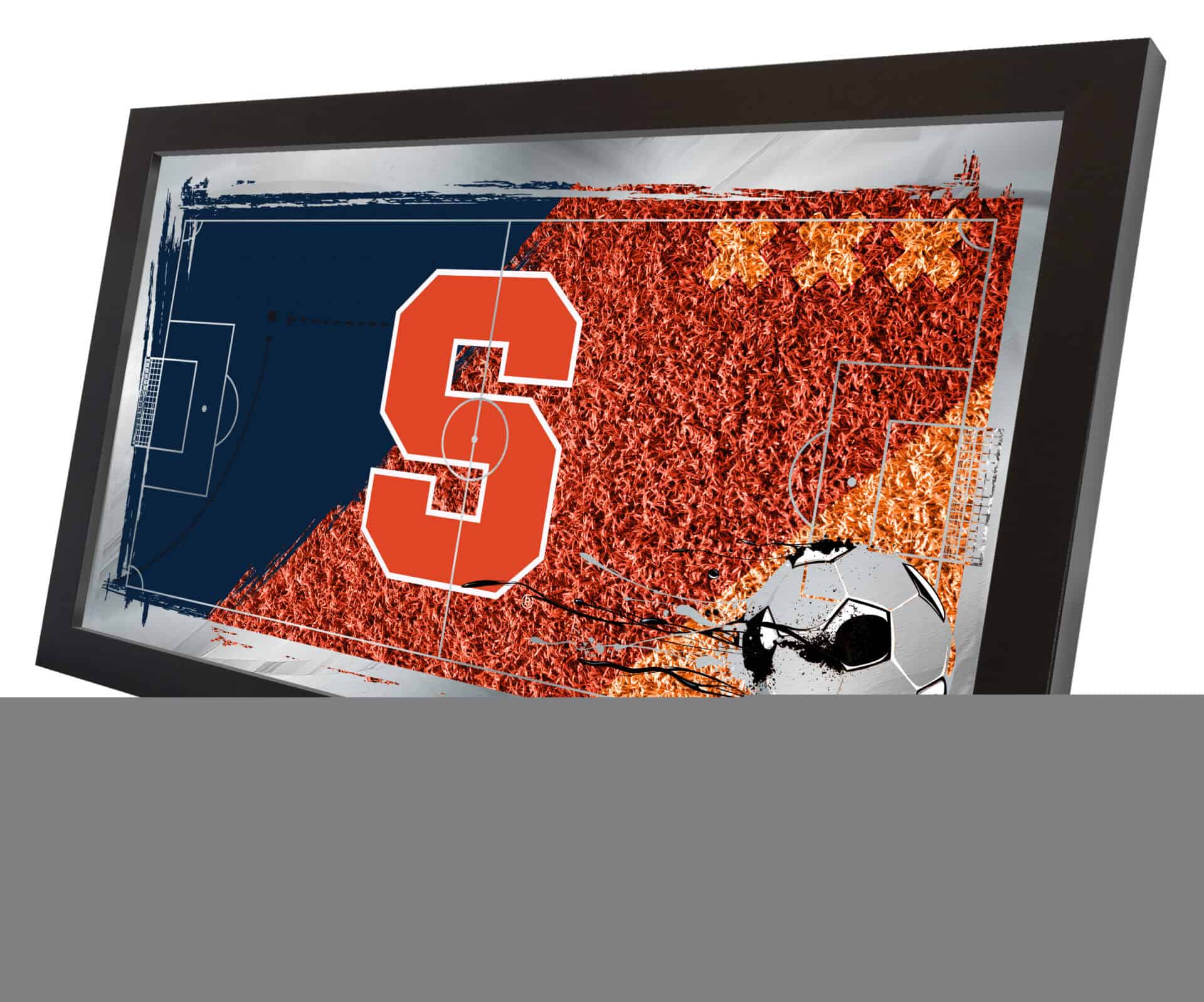 Show your support for your favorite team with the Syarcuse 26×15 Soccer Wall Mirror. Featuring a simple yet elegant design, this mirror showcases vibrant colors through its 1/8″ thick glass, enhanced by mirrored accents. The sleek black 1 1/4″ frame and saw tooth hangers make it easy to display in any space, whether it’s your office, garage, or home. This mirror is a perfect gift for any soccer fan or a stylish addition to your own decor.