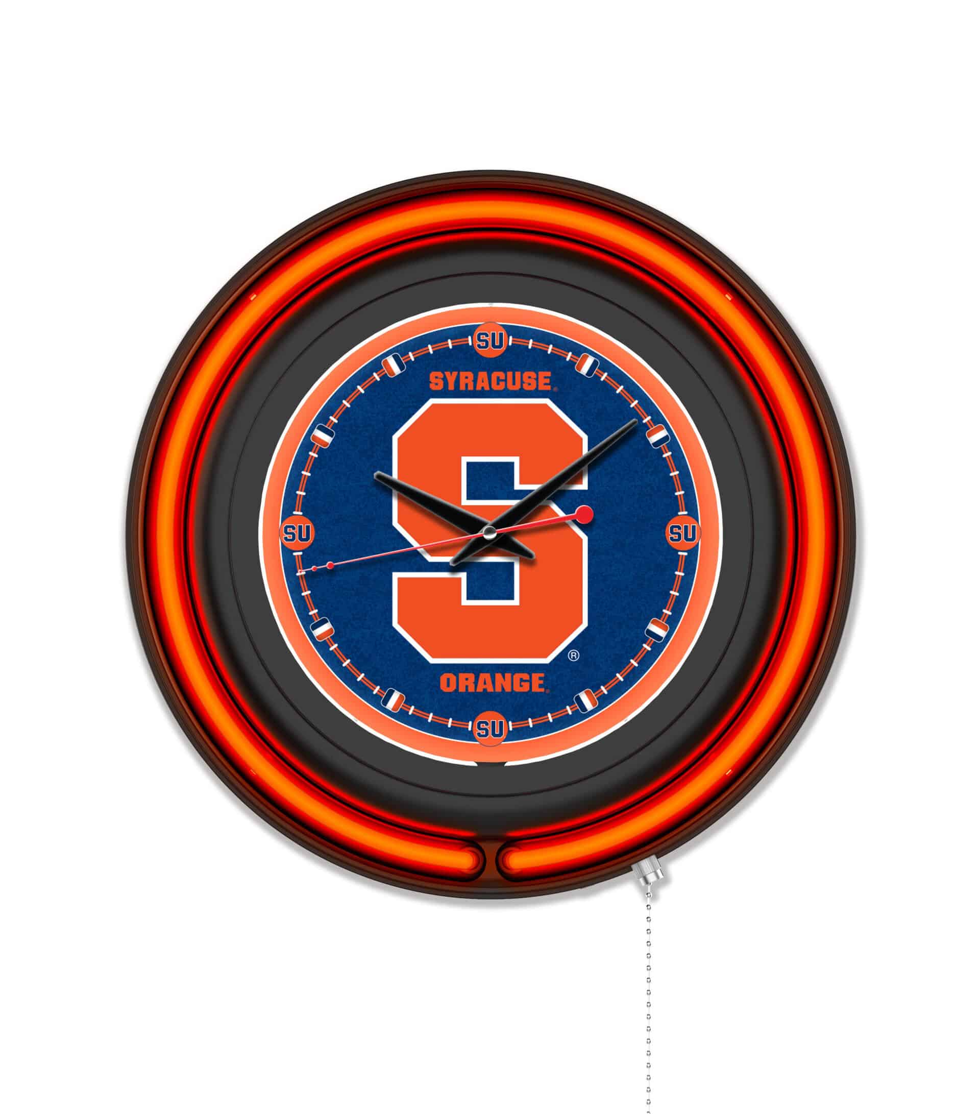 The Syracuse University 15-Inch Neon Logo Clock in Black is the ultimate addition to any man cave, showcasing your school pride with vibrant, full-color artwork. This clock features a striking black casing complemented by a neon outer ring in team colors, beautifully illuminating the custom printed clock face with a brilliant white inner neon ring. The easy-to-use pull chain allows for quick ON/OFF operation, while the UL Listed power transformer connects effortlessly to a standard 120V outlet. With accurate quartz movement powered by a single AA battery (not included), this clock is not just a decorative piece but also a reliable timekeeper. Ideal as a gift for graduates or sports enthusiasts, this clock is a must-have for those who value style and functionality.