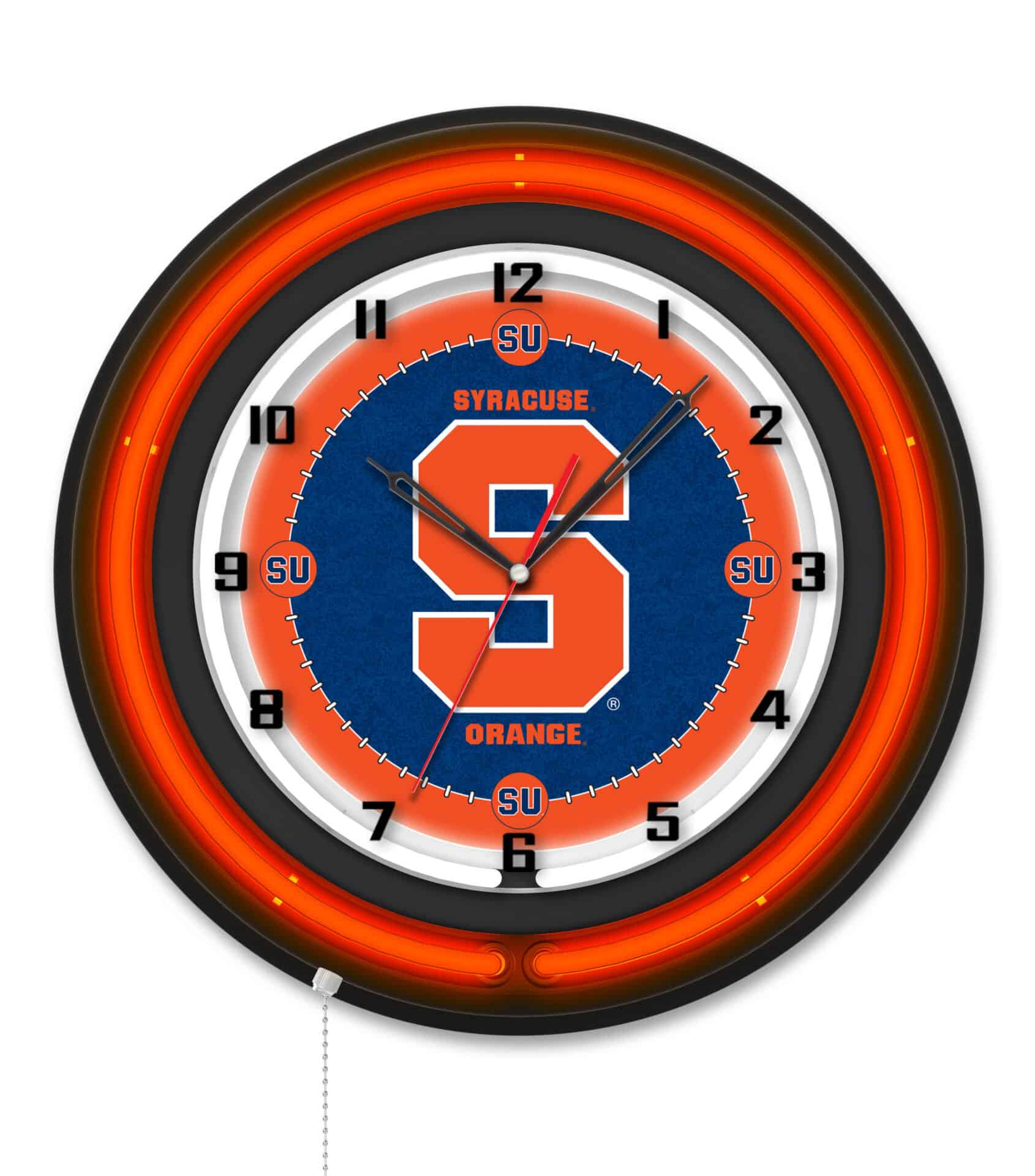 The Syracuse University 19-Inch Neon Logo Clock in Black is the perfect addition to any fan’s collection. This stylish clock features a sleek black casing and vibrant neon accents that illuminate the clock face, showcasing your school pride in a brilliant way. The double neon tubes—one in team colors and one white for illumination—create a stunning effect, making it an eye-catching piece for any room. Its easy pull chain operation allows you to turn the neon lights on and off effortlessly, while the accurate quartz movement ensures that you’ll always be on time. This clock is not just a decorative item; it’s a functional piece that brings both style and utility to your man cave or game room.