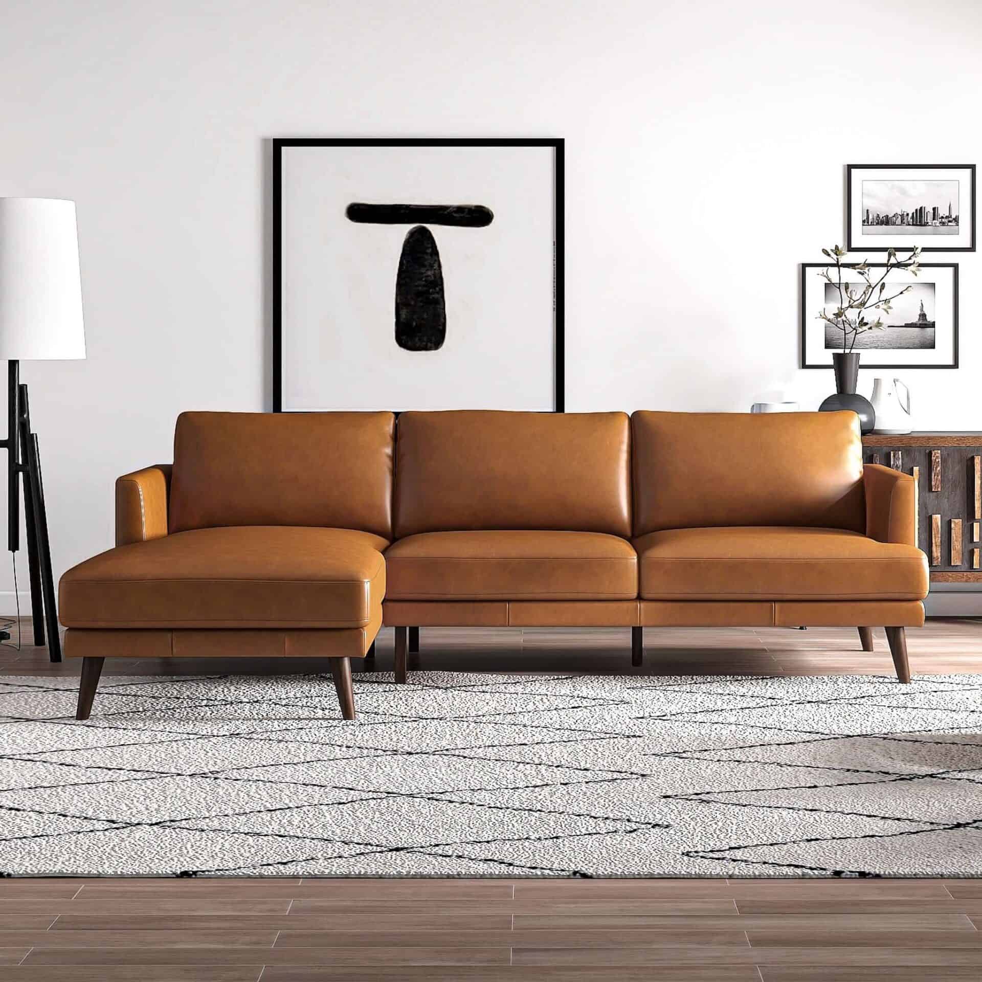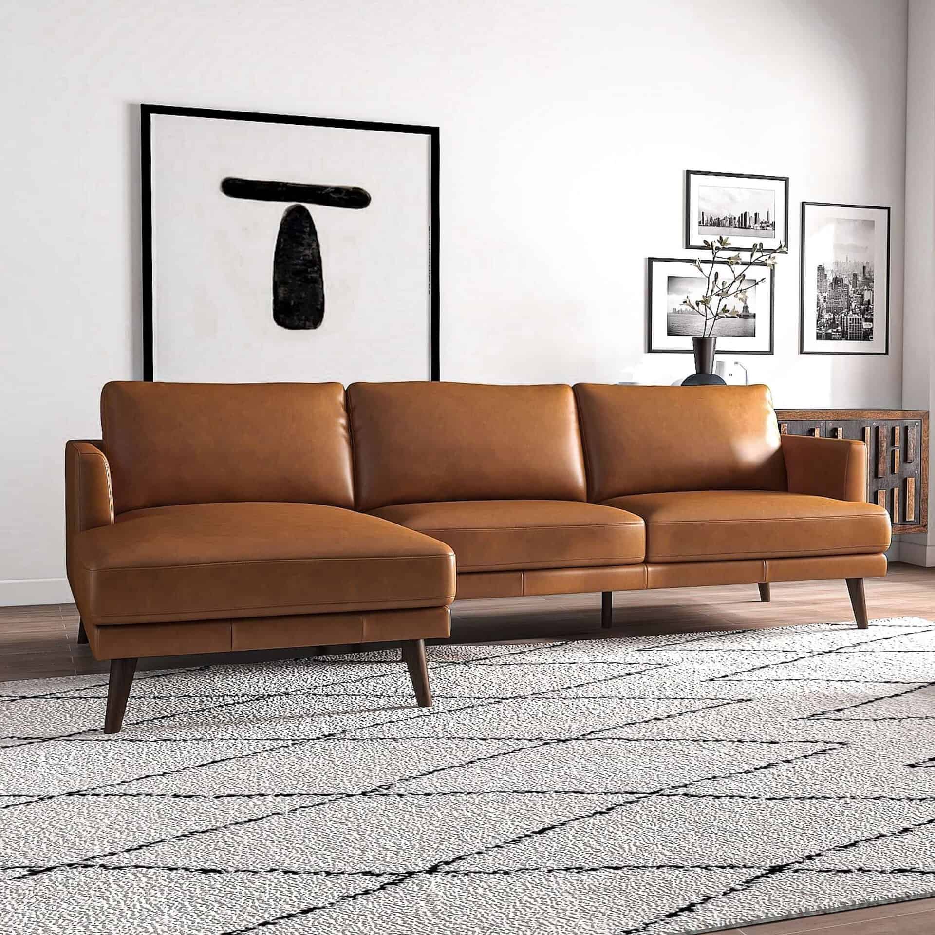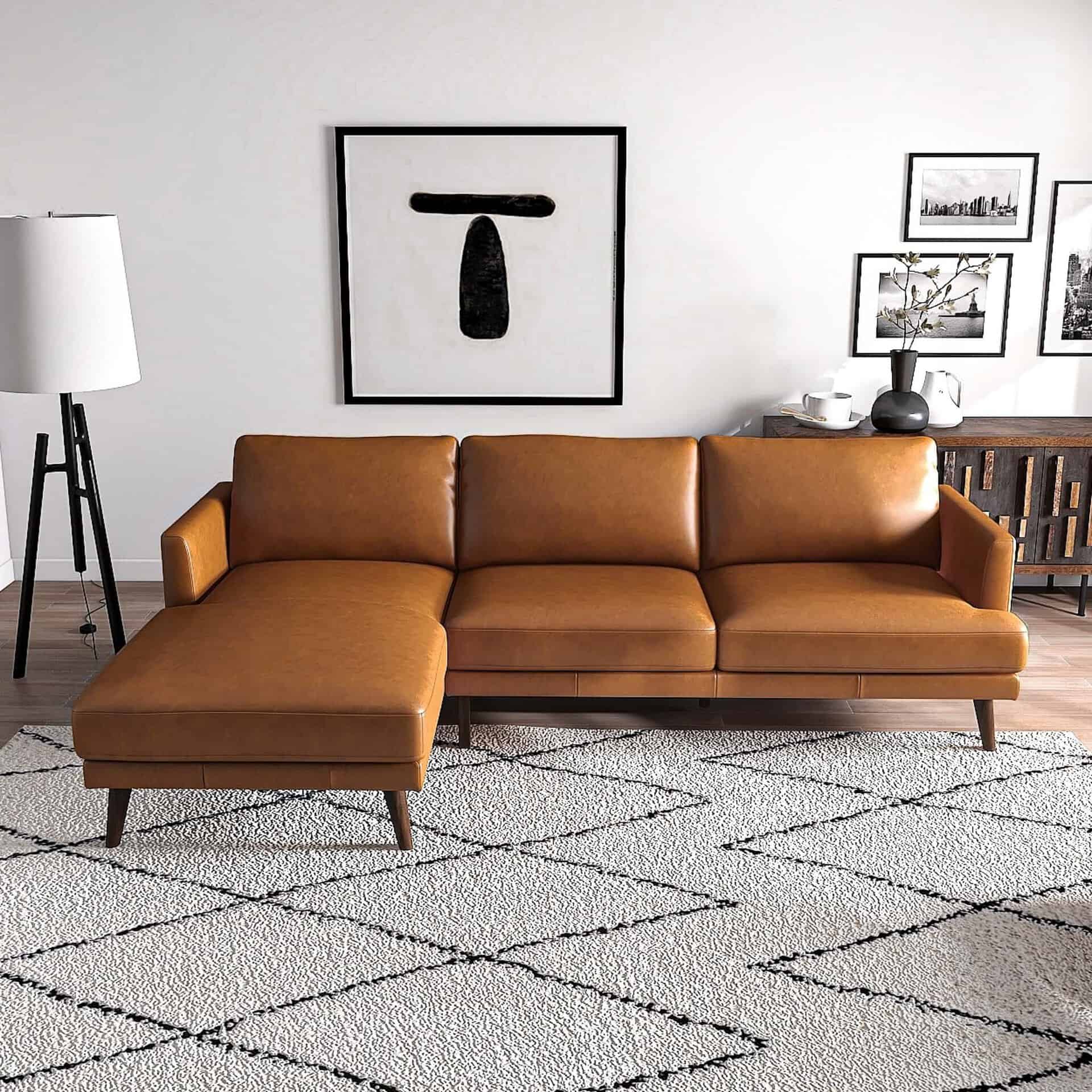Tan Leather L-Shaped Sectional Couch Left Facing