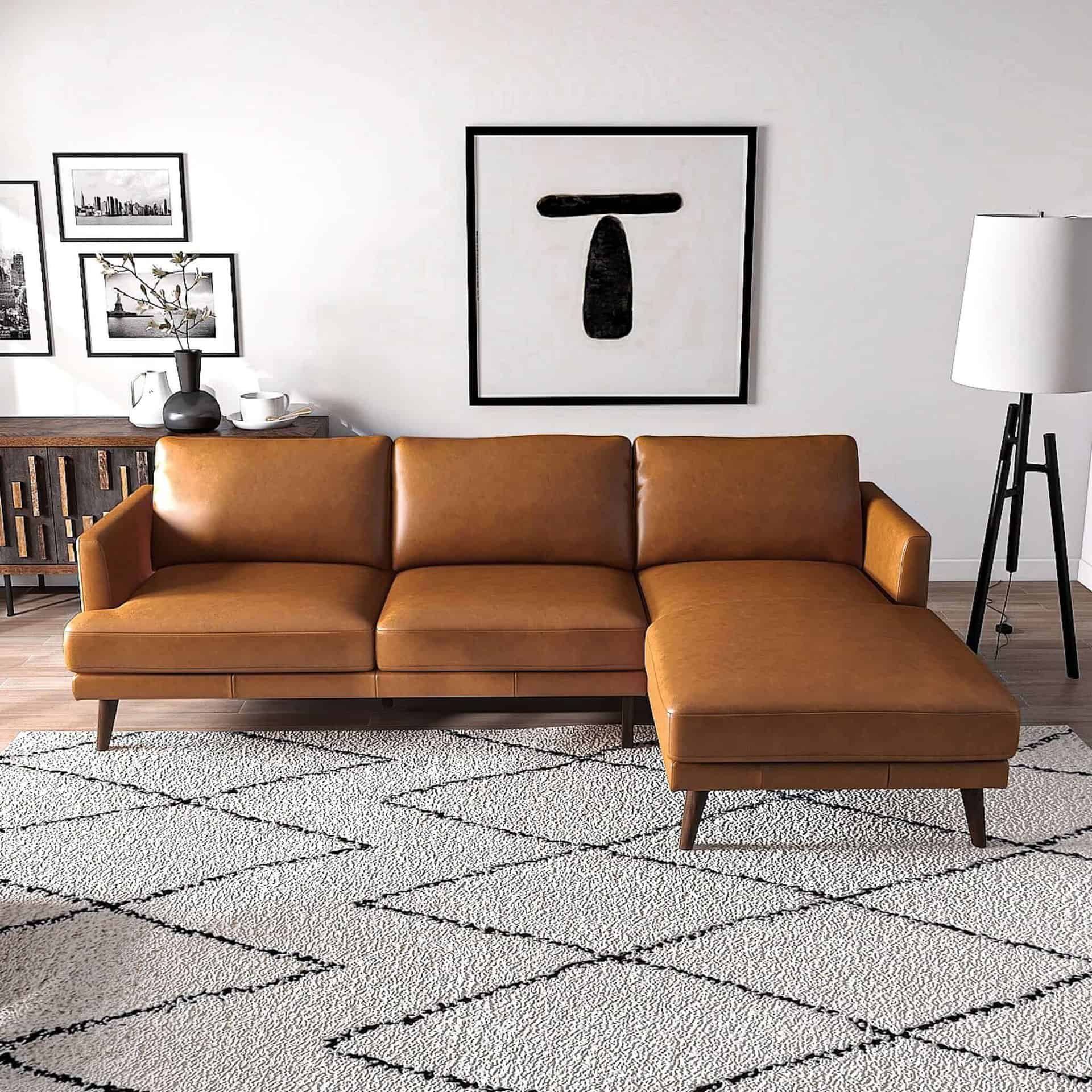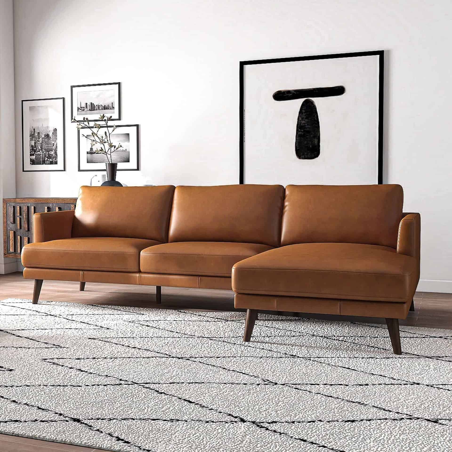 A sectional couch is a versatile and stylish piece of furniture that adds both comfort and functionality to your living space. The Tan Leather L-Shaped Sectional Sofa Right Facing offers generous seating capacity and plush cushions, creating a cozy and inviting spot for relaxation, socializing, or watching TV. Its practical design is perfect for entertaining, as it comfortably accommodates a group of people. This sectional sofa combines comfort, versatility, and aesthetics, making it an excellent addition to any man cave or living room.