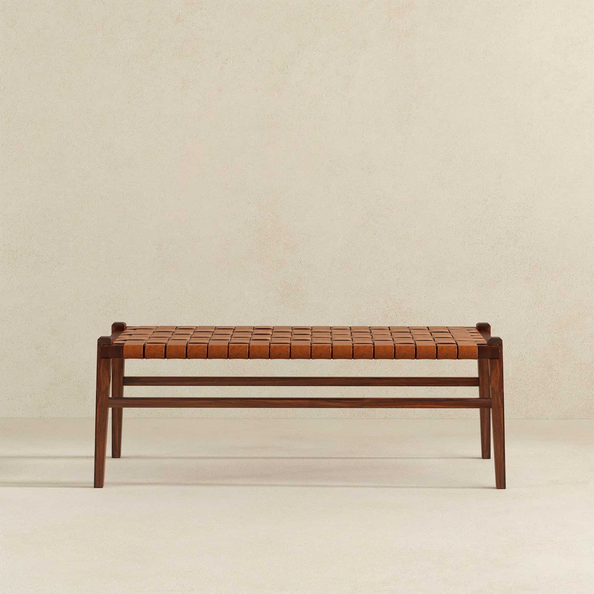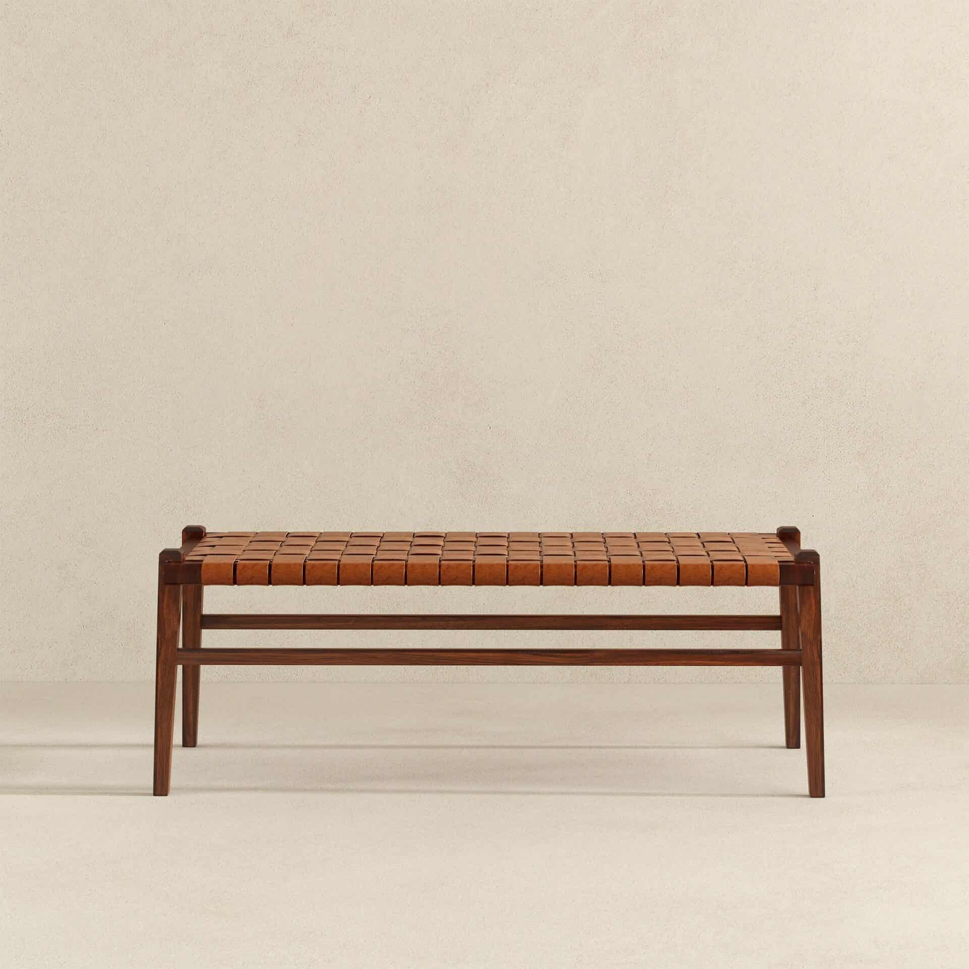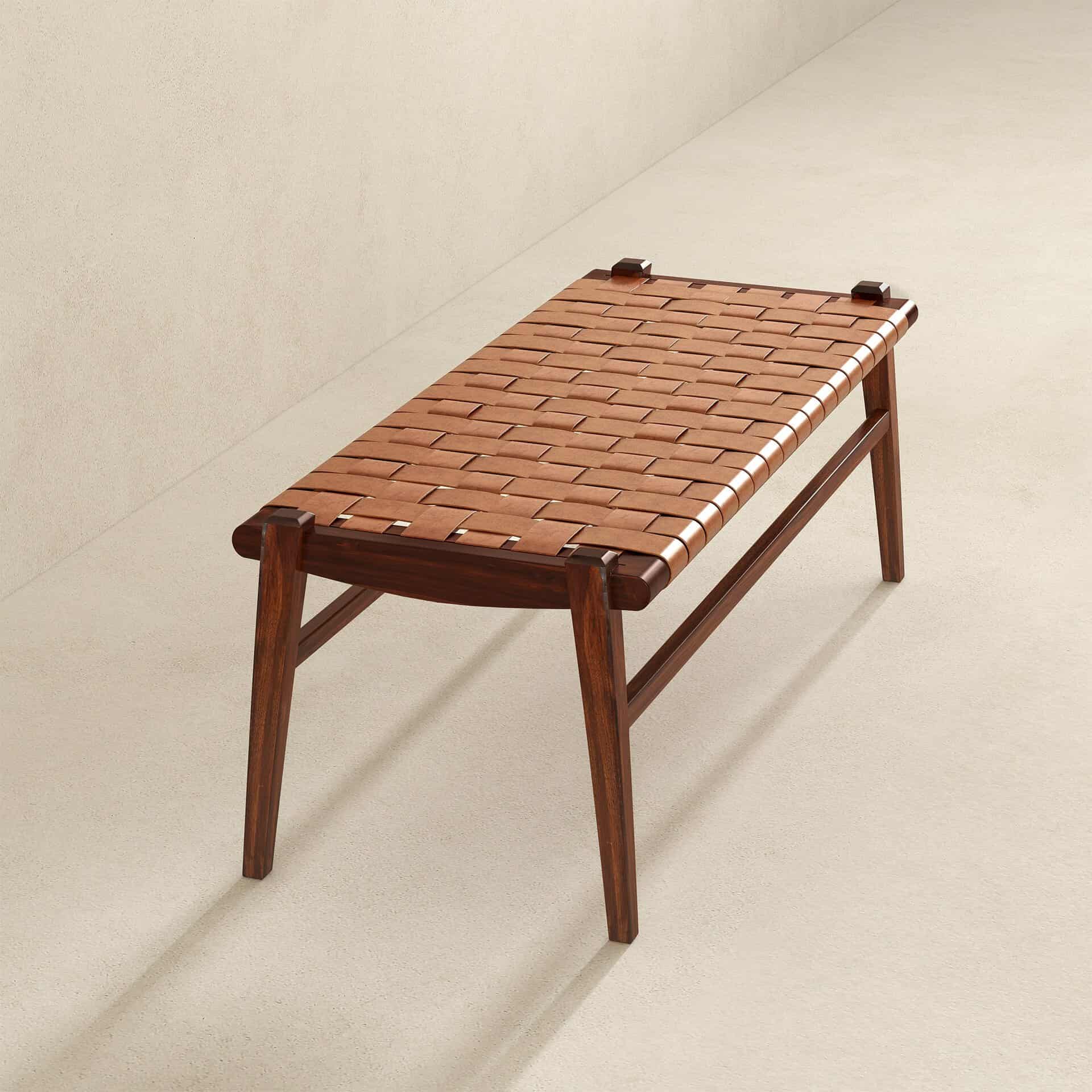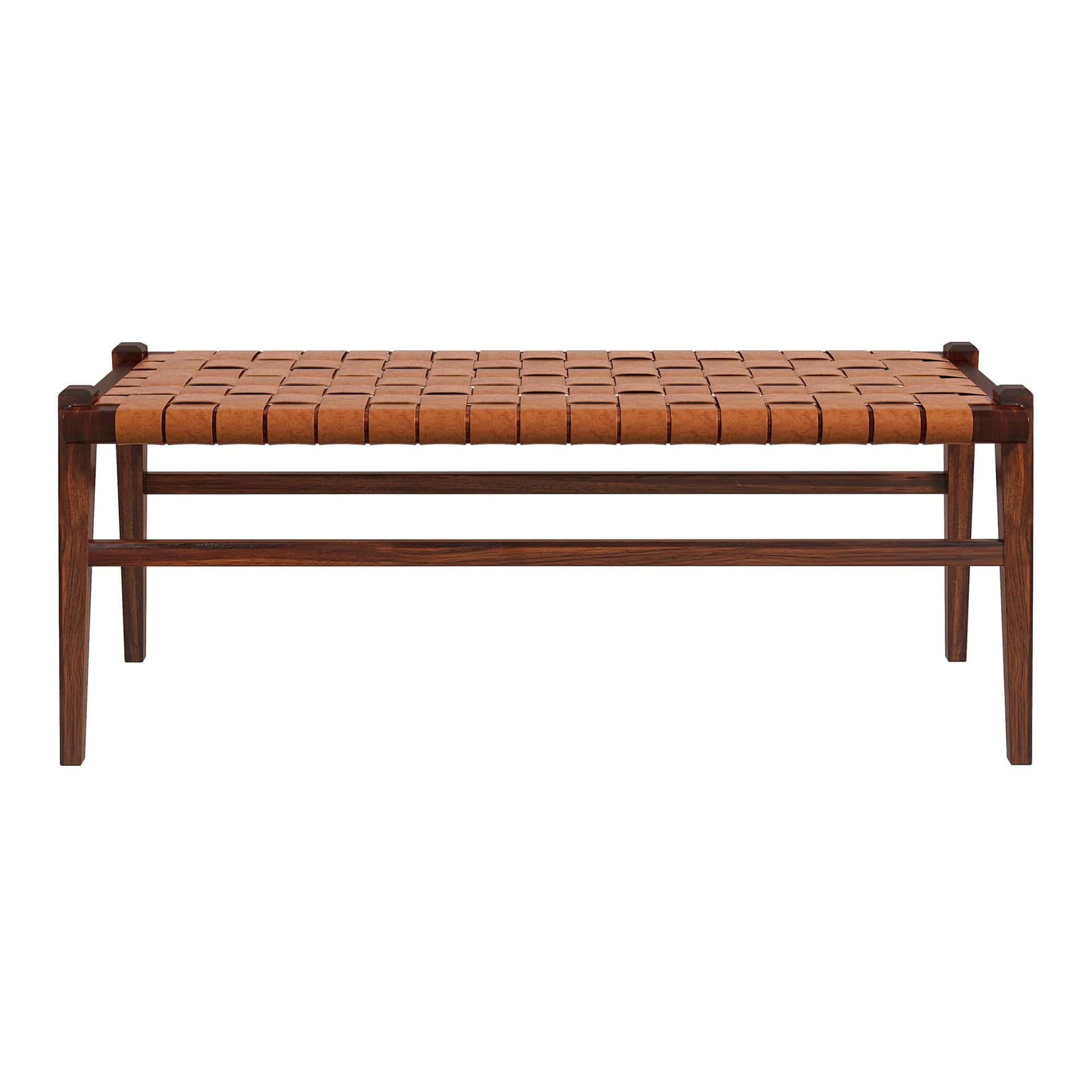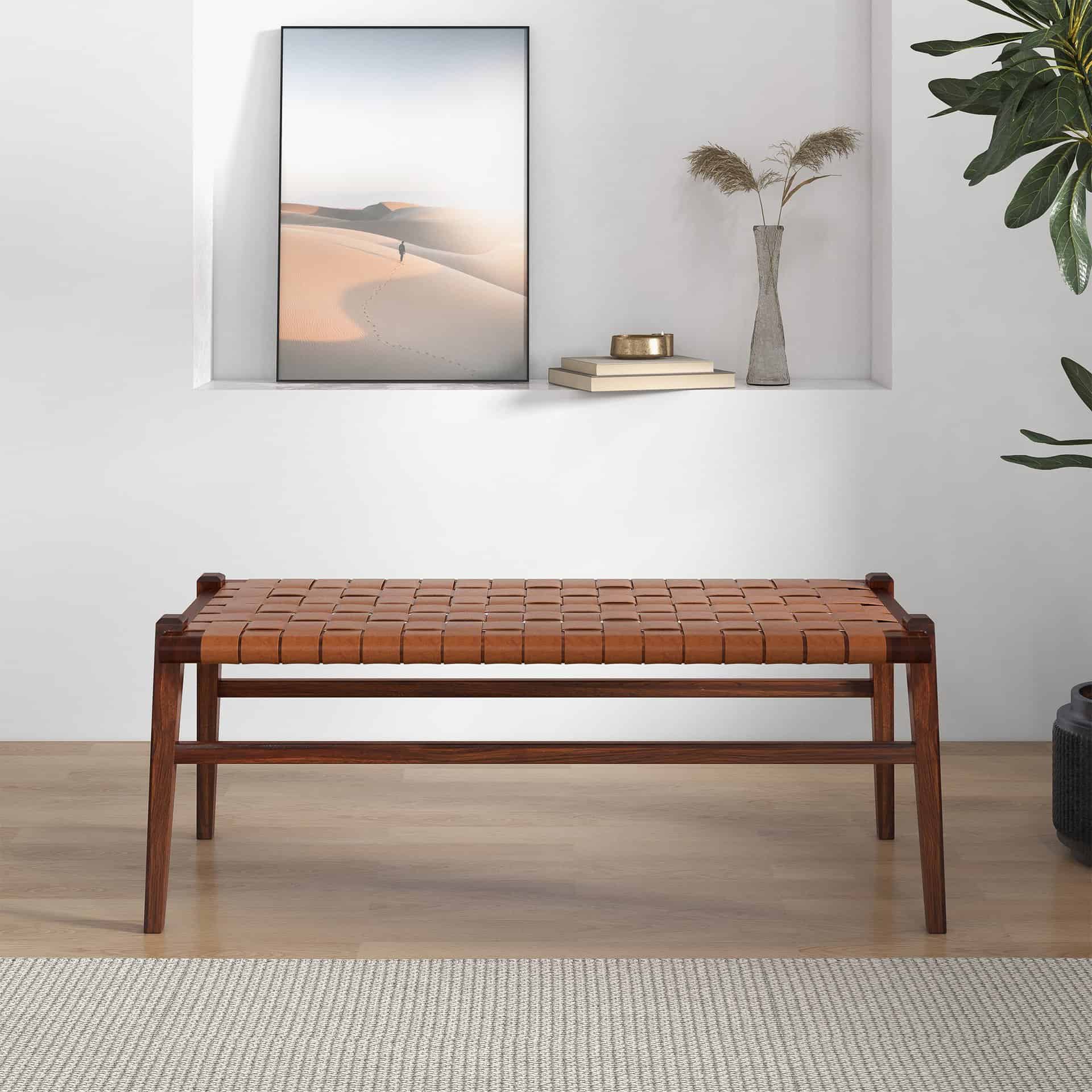 A perfect blend of retro charm and modern design, the Tan Leather Mid-Century Modern Bench With Solid Wood Frame and Tapered Legs is a versatile and stylish addition to your space. Featuring a genuine leather seat cushion filled with high-density foam, this bench offers exceptional comfort for up to two people. The sturdy solid wood frame and rich, tapered legs showcase a refined aesthetic with a touch of mid-century flair. Designed with convenience in mind, the bench requires no assembly and includes removable legs for easy delivery to tight spaces. Its timeless tan color ensures it complements a variety of décor styles, making it an ideal choice for your man cave or living room.