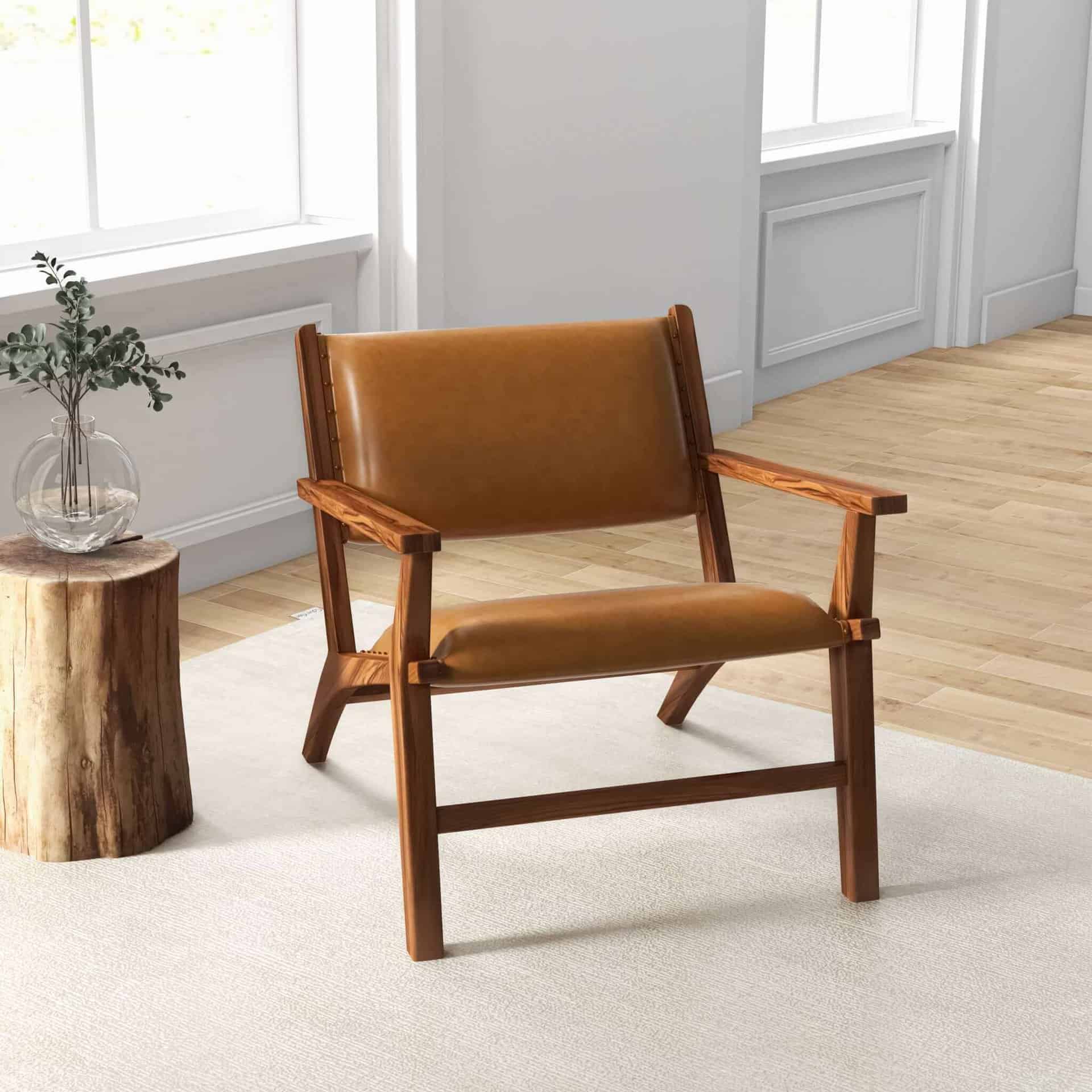 Make a statement in your living room with this mid-century-inspired tan leather lounge chair. Designed with both style and comfort in mind, this chair is crafted with a solid wood frame, durable genuine leather upholstery, and high-density foam padding for a luxurious seating experience. The walnut-finished legs and elegant square arms add a touch of sophistication, while the removable legs allow for easy delivery and setup in tight spaces. Perfect for a variety of decor styles, this chair is available in timeless colors to suit your personal taste. Easy to clean with a non-abrasive cleaning solution and a microfiber cloth.