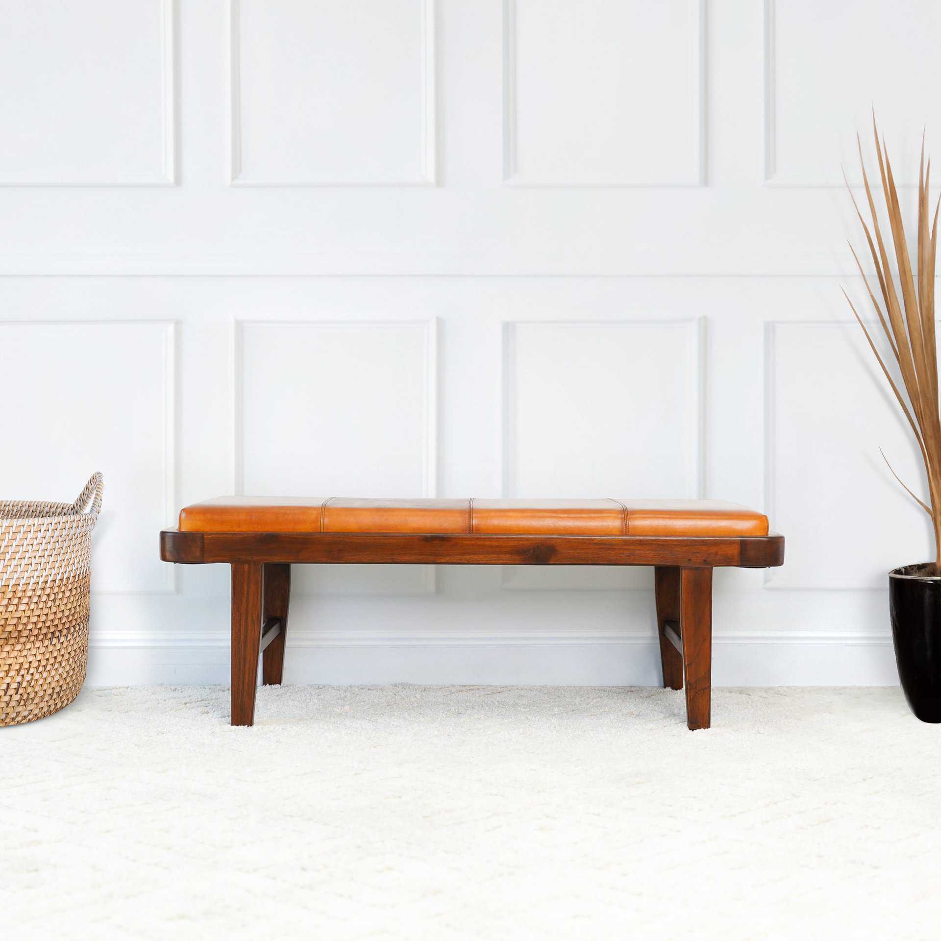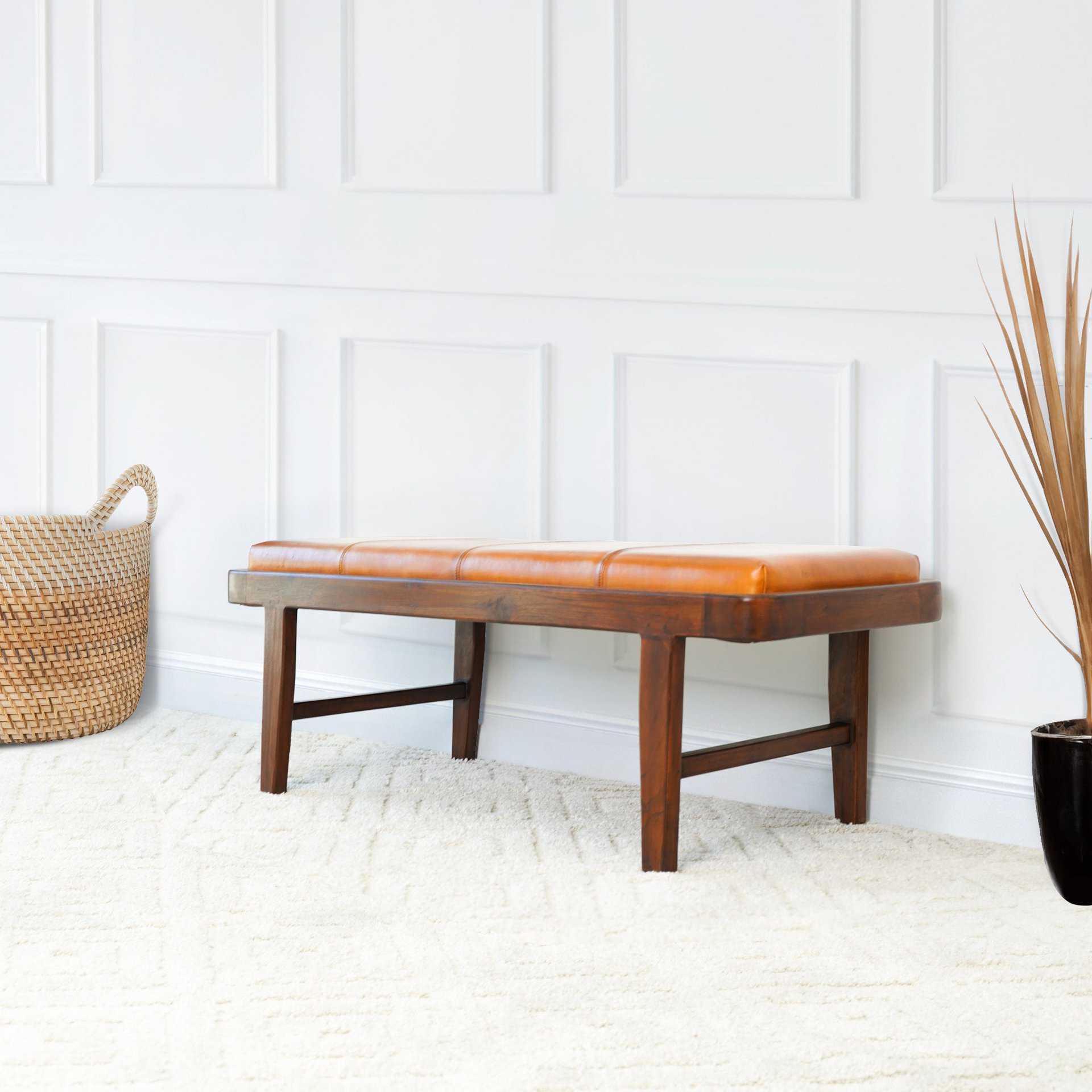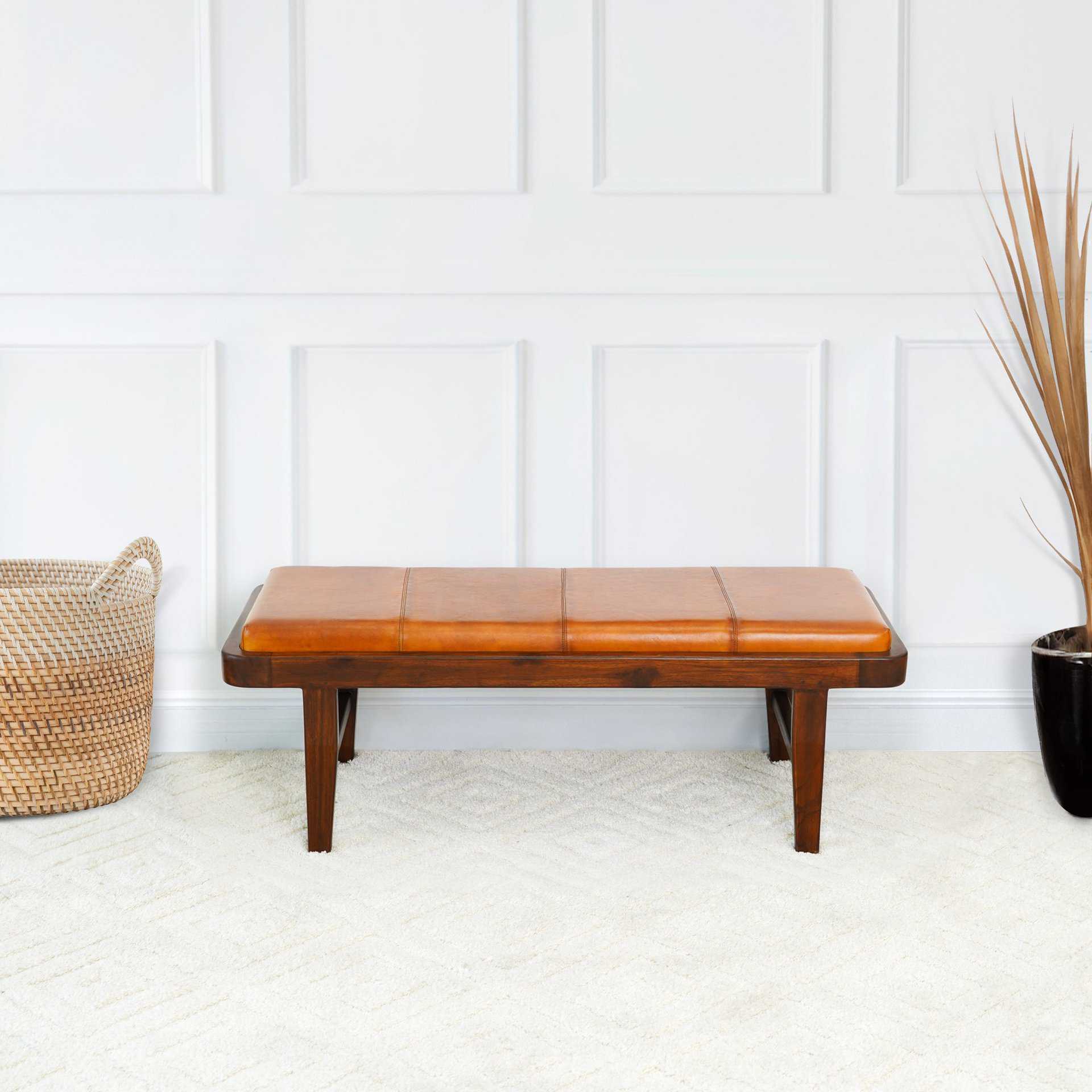 A Mid-Century modern update to a retro classic, the Tan Leather Mid-Century Modern Upholstered Bench with Wood Legs is a versatile addition to any space. Its seat cushion is crafted from high-quality genuine leather and filled with high-density foam, providing comfortable seating for up to two people. The bench is constructed with a sturdy solid wood frame and features elegant tapered wood legs with a rich finish, offering a refined aesthetic and a hint of mid-century charm. Designed for practicality, it can be easily cleaned with a non-abrasive cleaning solution and a microfiber cloth. The removable legs allow for easy delivery and setup, even in tight spaces. Available in timeless color options, this bench is sure to complement your decor.