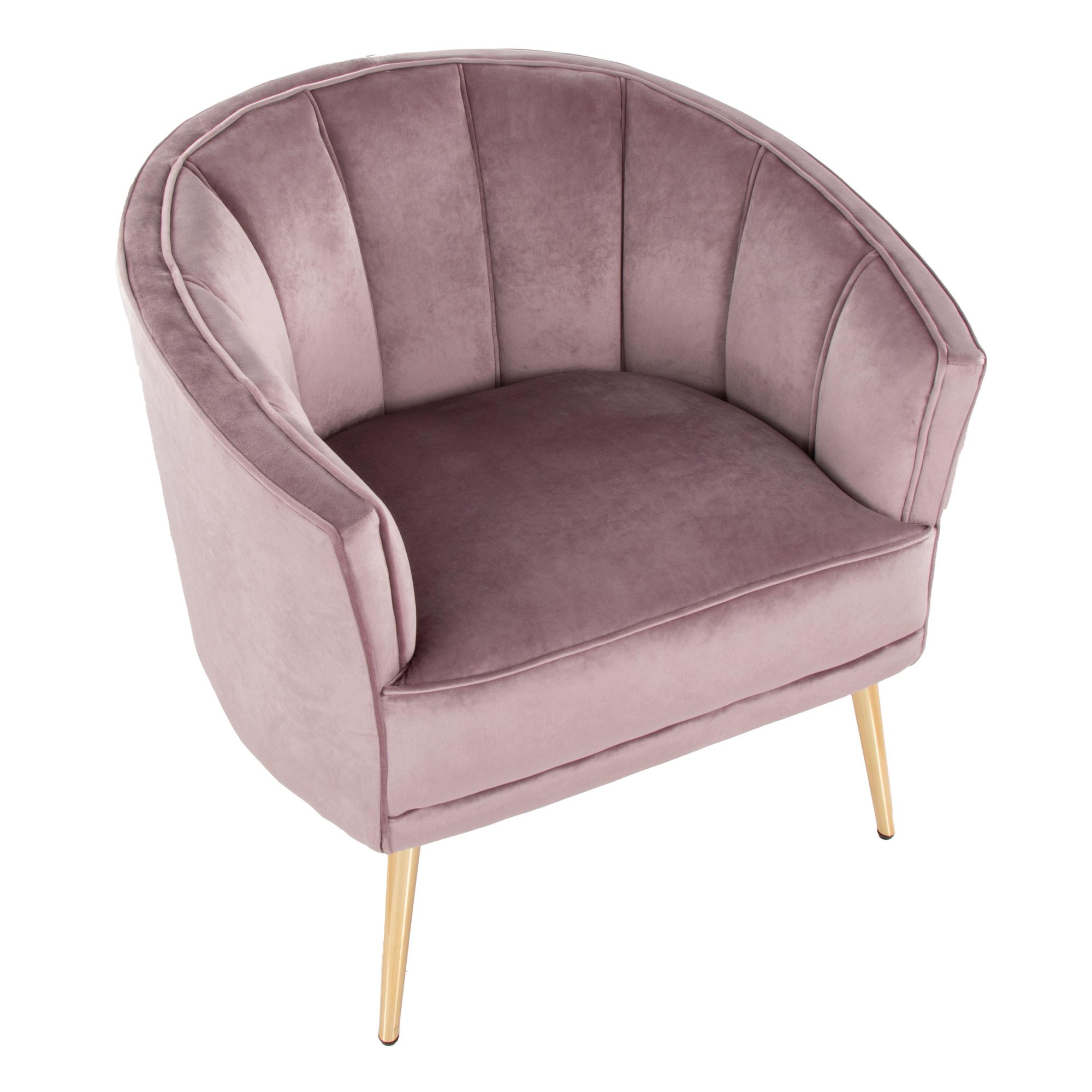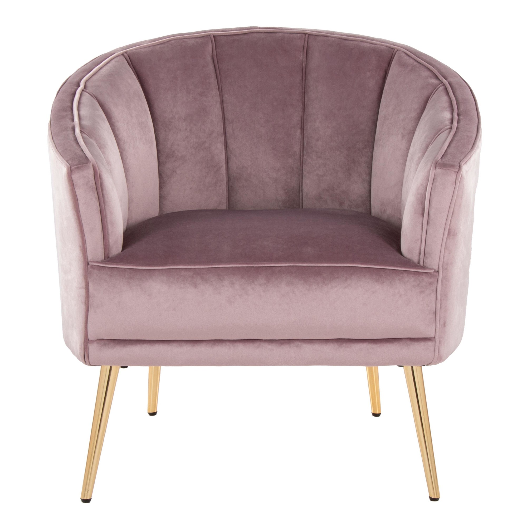Add a touch of glam to your chill space with this contemporary accent chair. The sleek velvet upholstery is soft and stylish. The gold metal legs add a touch of modern style. Notice the vertical tufting on the seat and backrest. The cushioned seat and backrest make this chair comfy for sitting. Some assembly is needed. It is 27″L × 30″W × 29″H overall. The weight limit is 250 lbs. The color is blush velvet with gold metal. The material is velvet fabric, foam, metal, and plywood.